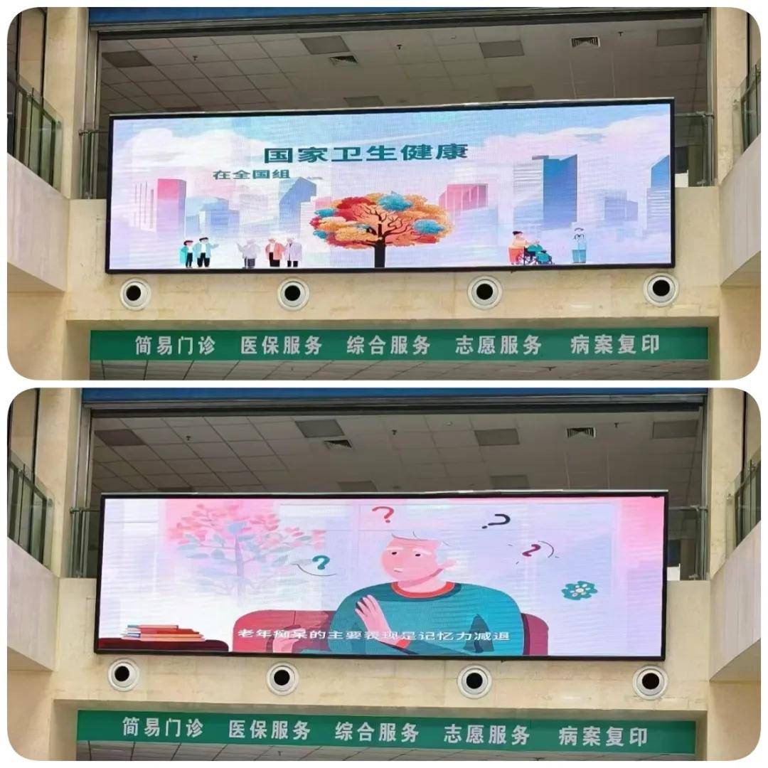同时,在宣传月活动期间,医院在门诊楼电子大屏循环播放老年痴呆防治行动公益宣传视频,介绍阿兹海默症的症状、风险因素、早期识别和治疗方法等重要信息。