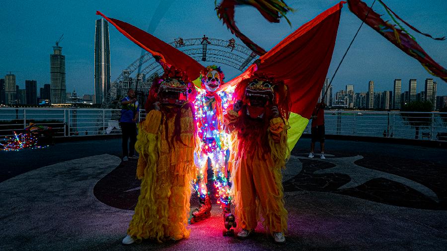 \ 快乐的轮滑小丑“卡卡”和他的伙伴们在武汉江滩