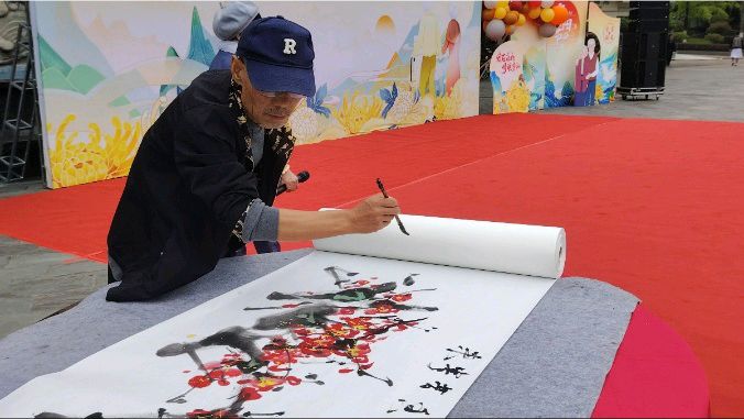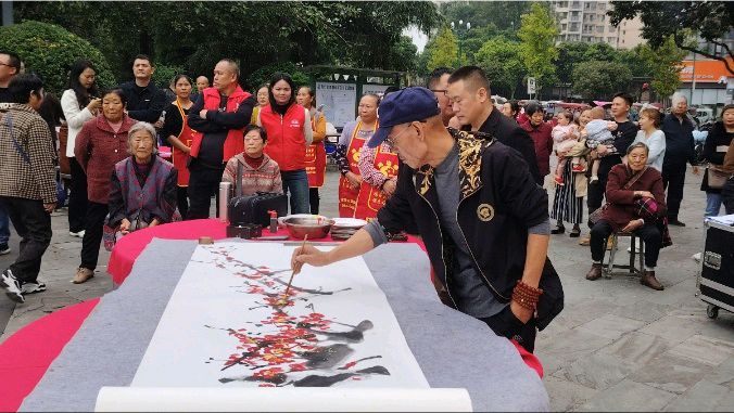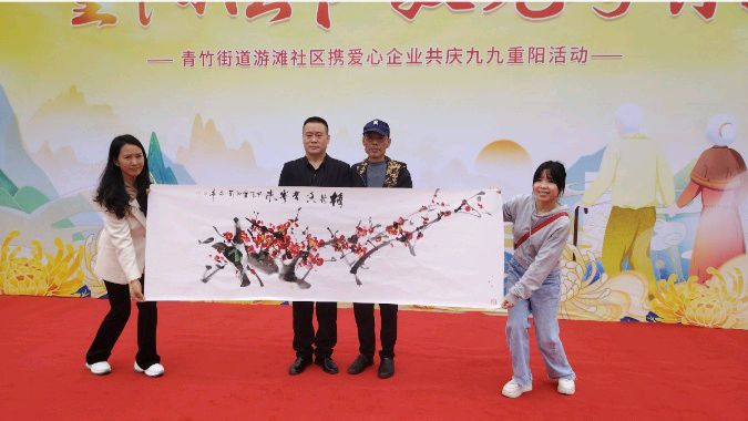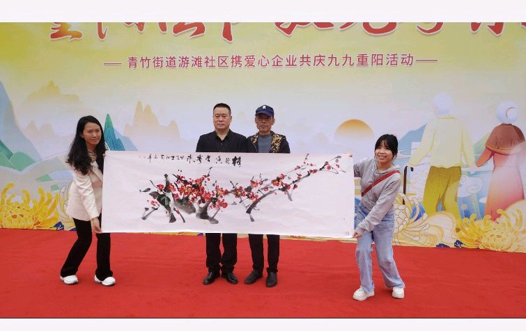 在青神县重阳节庆祝活动上,国礼大师陈永华的画作成为了焦点,他的梅花作品以其独特的艺术特点赢得了在场老人们的一致好评。