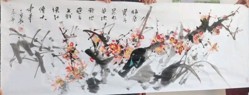 再说说一尘老师,他的书法那是一绝,给这幅画配上了一首诗:“梅蘭写千家,竹菊你我他。飞身上战场,弘传大中华。”这首诗和画简直是绝配,让梅花的意义更深了一层。