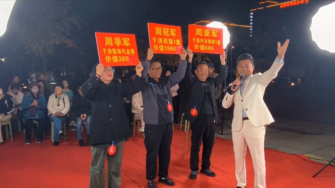 参赛选手,尽情发挥,充分展示才艺,经过激烈的角逐,经现场观众和直播间网友现场投票,“于涛大舞台”第一期周冠、亚、季军诞生。巩义市悠悠水饺总经理吴学曾为季军颁发奖品,市志愿服务联合会会长崔宝丽为亚军颁发奖品,于涛大舞台总负责人、于涛服饰总经理于涛为冠军颁发奖品。