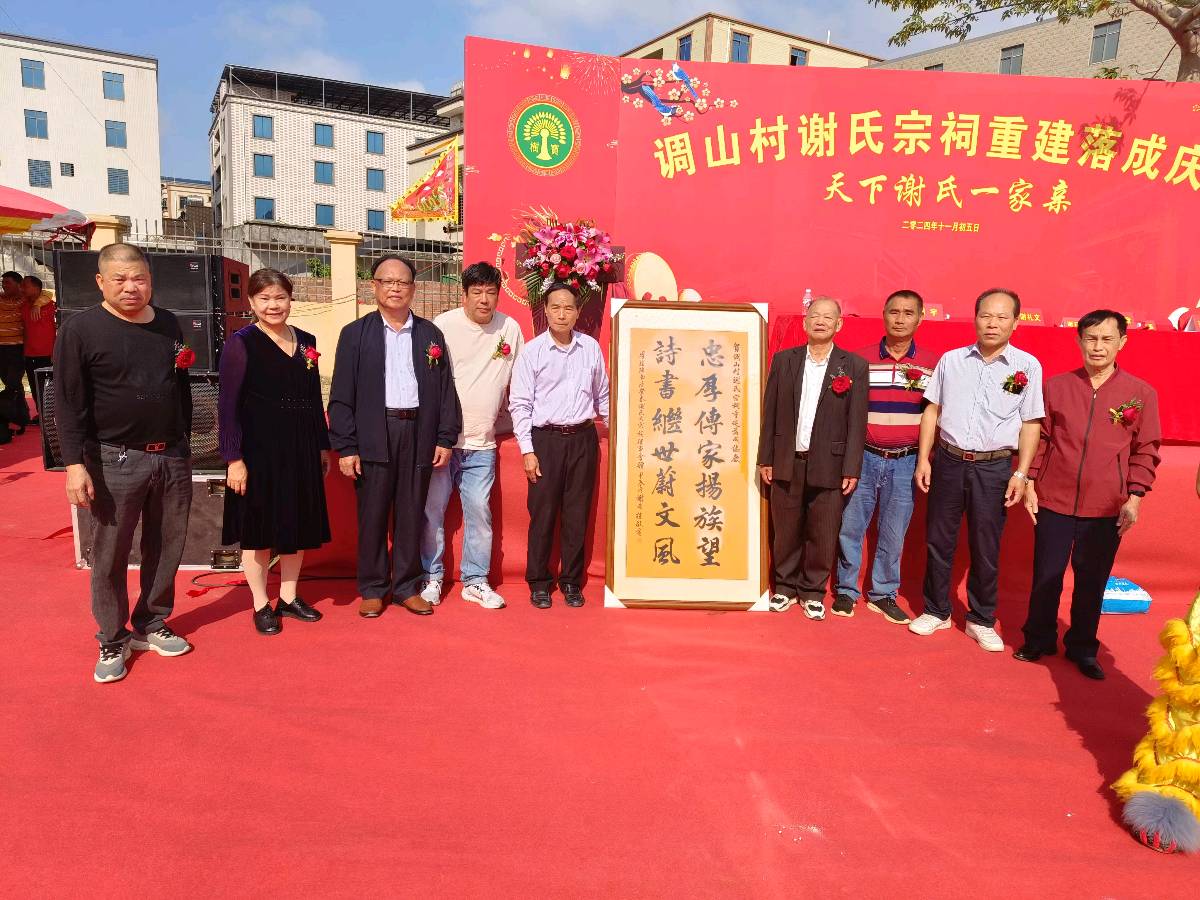 12月5日上午9.30分,广东省湛江市东海岛调山村谢氏文真公祠重建落成典礼正式举行,该村谢氏宗亲代表和来自粤桂琼三省区及国内、海内外、湛江市辖内市县区的社会各界领导、谢氏宗亲代表的宗长共二千八百多人出席了庆典活动。有关领导、宗长、代表等分别发表了热情洋溢的致辞。祠堂占地面积6000多平方米,建筑面积600多平方米,投入资金600多万元。祠堂建设雄伟、美观、新颖,装修辉煌,内部布展祠堂丰富文化、历代谢氏精英人典型物简介,图文并茂,不愧是具有民族特色和传统的精粹高品位综合文化,是传承血脉和开展中华祠堂文化教育宣传的好窗口和平台。祠堂是寻根问祖、追根溯源的圣地。作者应邀荣幸出席典礼并参观了祠堂室内的各项布展全部内容,深受感动和启发,特作诗一首,予示祝贺。诗文如下: