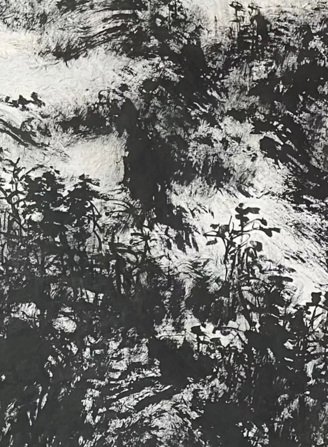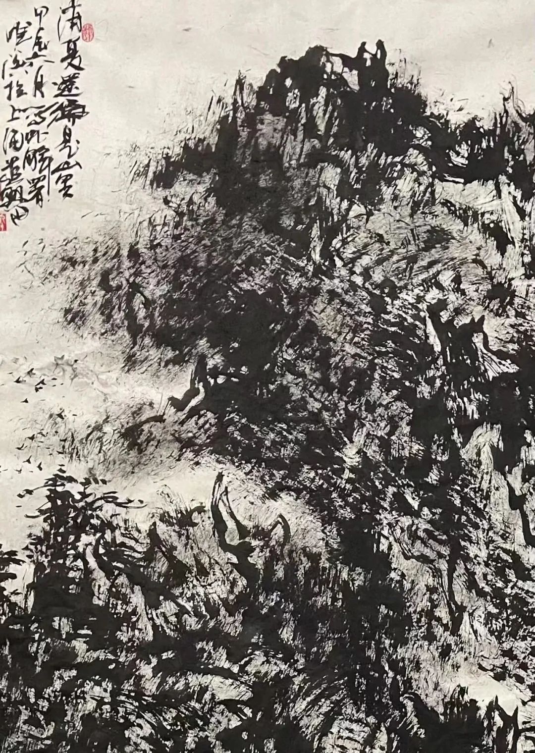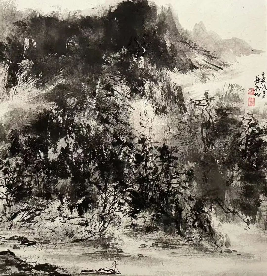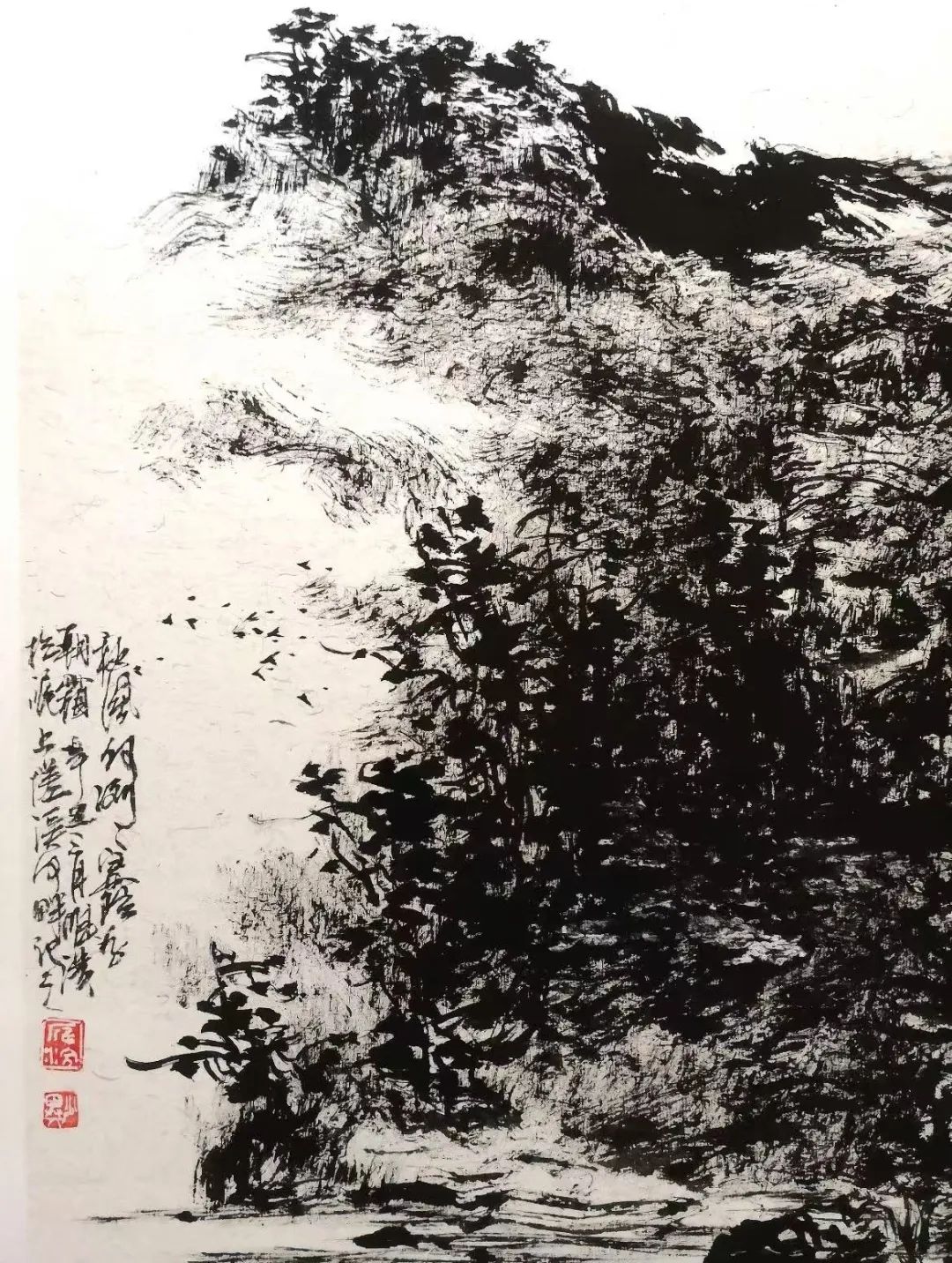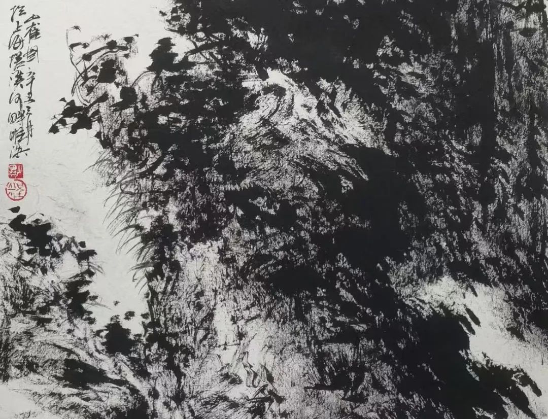 他以焦墨表现其峥嵘华滋,空灵奇逸,乾旋坤转。他的作品多为云烟幻变,林山蓊郁,泉石飞鸣,充满着生气的宇宙之大象,天地之大美,他笔下的山水是包含着个人情感与充满着心象山河;体现出“天人合一”、“大道自然”的艺术情怀。他以笔墨与山川为载体,寄托着自己的性情,抒发出对百变人生的无限感怀。