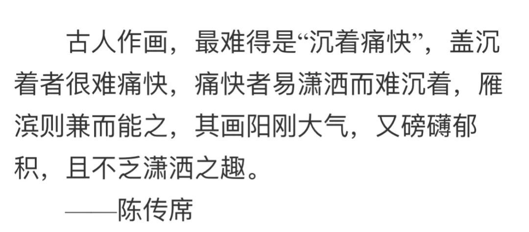 这也是石涛在画语录中提到的“一画”之法的理论。用心感悟时境的不同气象,以不同的笔墨之法营造不同的物象,法为我用,法为活用,知法不落法。笔法得心应手则画面浑然一体,笔墨以心接物则画面气韵生动。雁滨先生的画始终游走在景与情、意与境、笔与墨、道与心的自我状态的恒定中,给观者以无限的回味和品读的暇思。