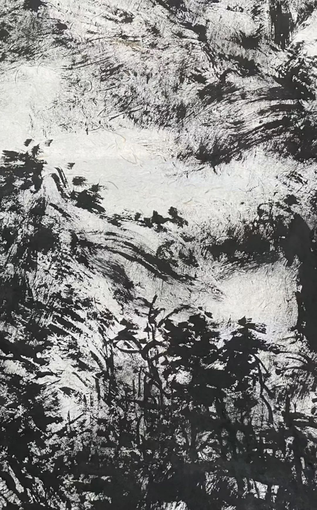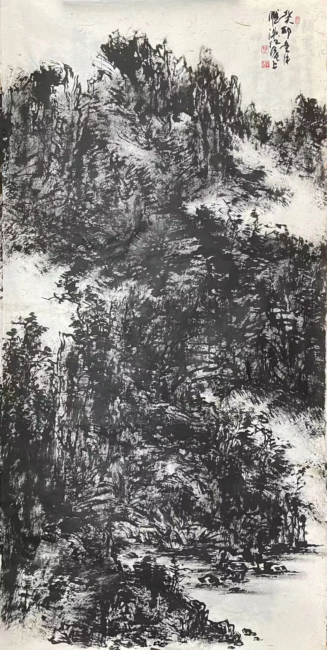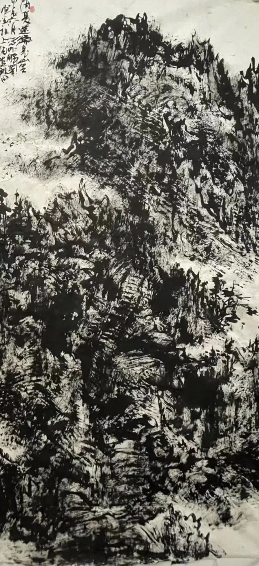 雁滨先生坦诚、乐观。近期所见先生的一批焦墨新作,无不苍雄中藏蕴润,隽逸风丽。他凭借着对焦墨山水笔墨的独道理解和对山川峻宇的热爱,创作出一幅幅精神与个性十分自我且强烈的山水佳作。
