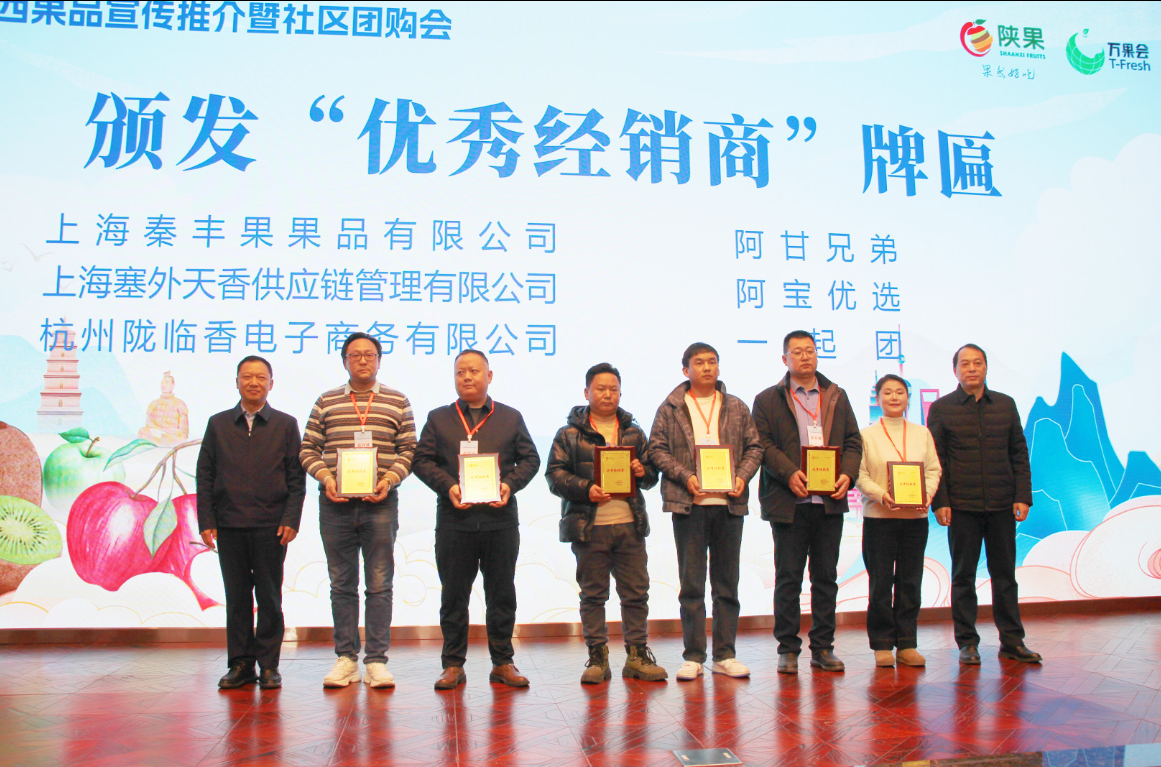 西安祥瑞泰农商贸有限公司、陕西齐峰果业有限责任公司、咸阳绿港农业科技有限公司、陕西富平大方天玺绿色农业发展有限公司、榆林市淮宁河现代农业有限公司等 5 家陕西果业企业代表推介了各自产品。上海社区团购代表阿宝优选萧骆分享了私域流量和社区团购、社群团购的发展趋势。
