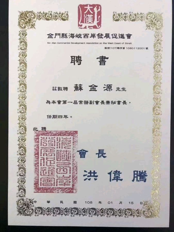 中国老年书画家协会会员,厦门书法家协会会员 、曾任厦门市盈翠书画院首任院长,现为名誉院长 2013年恢复写歌至今在中国大众音乐协会和华夏音刋物举办的感动中国和向祖国致敬(原创歌曲征歌中有40余首歌曲入选和获奖。並担任海峡两岸发展促进会(筹)荣誉会长。