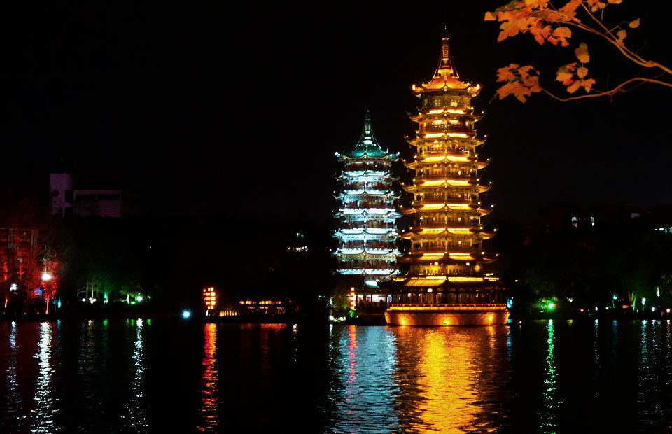 在雨中欣赏桂林的日月双塔,别有一番韵味