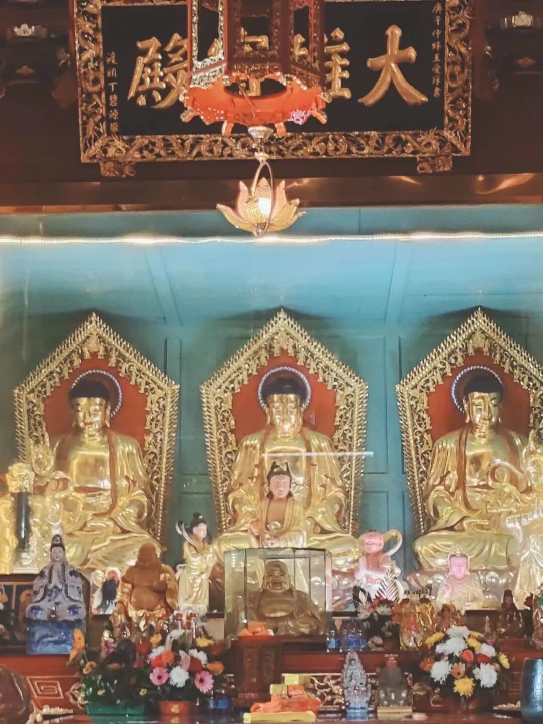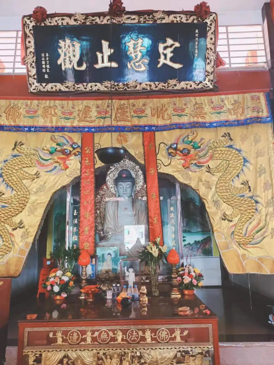 忠烈庙,讲经堂。大厅支柱碧辉煌。禅农养寺香烟盛,法雨慈云净业长。