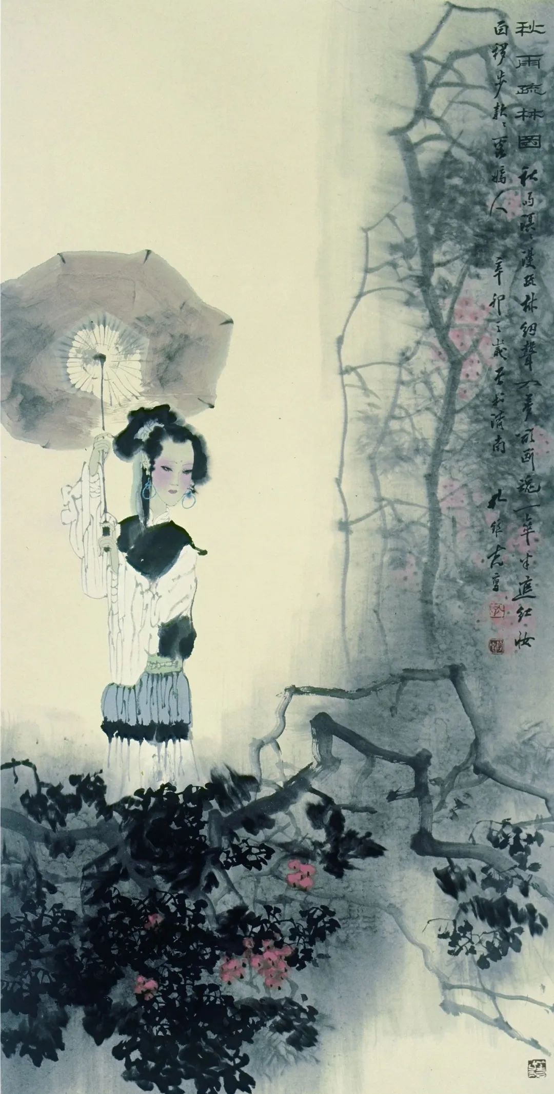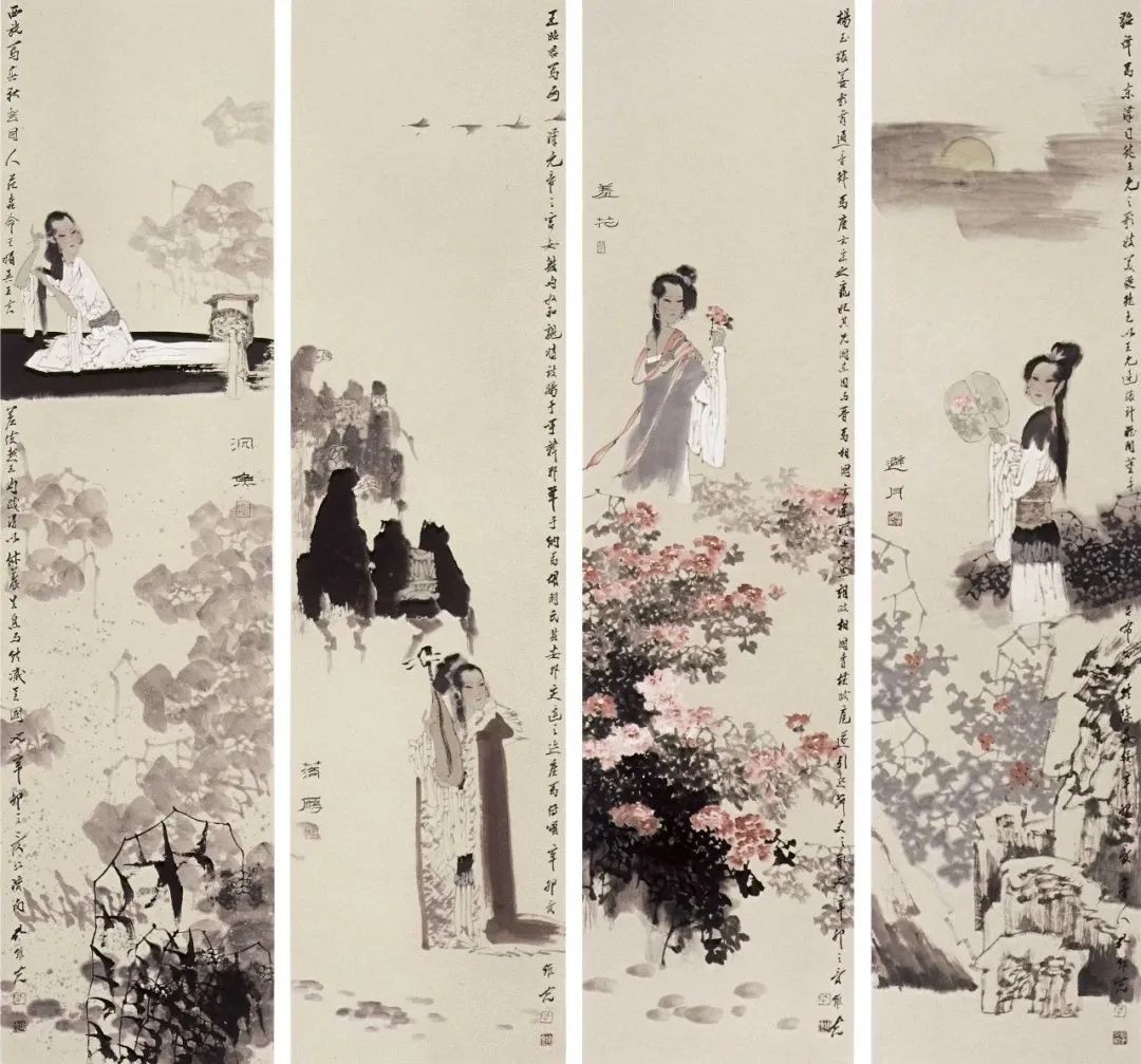 在色彩方面,孔维克先生的设色体系以“古雅”为审美核心,通过降低色相饱和度的方式实现视觉意象的沉淀,在规避浮艳媚俗的同时,构建出具有历史纵深感的东方美学色谱系统。值得注意的是,艺术家在处理戏曲人物时,如《霸王别姬》《白蛇传》《西厢记》《花木兰》等作品,基于传统戏曲服饰色谱的特点,在色彩上稍作热烈处理。相较之下,《四美图》的设色回归传统仕女画的审美范式,通过矿物颜料与植物染料的叠加渲染,营造出“绚烂之极归于平淡”的东方意境。这种克制的色彩语言,既是对东方美学“含蓄”特质的继承,也是对现代视觉经验的回应。