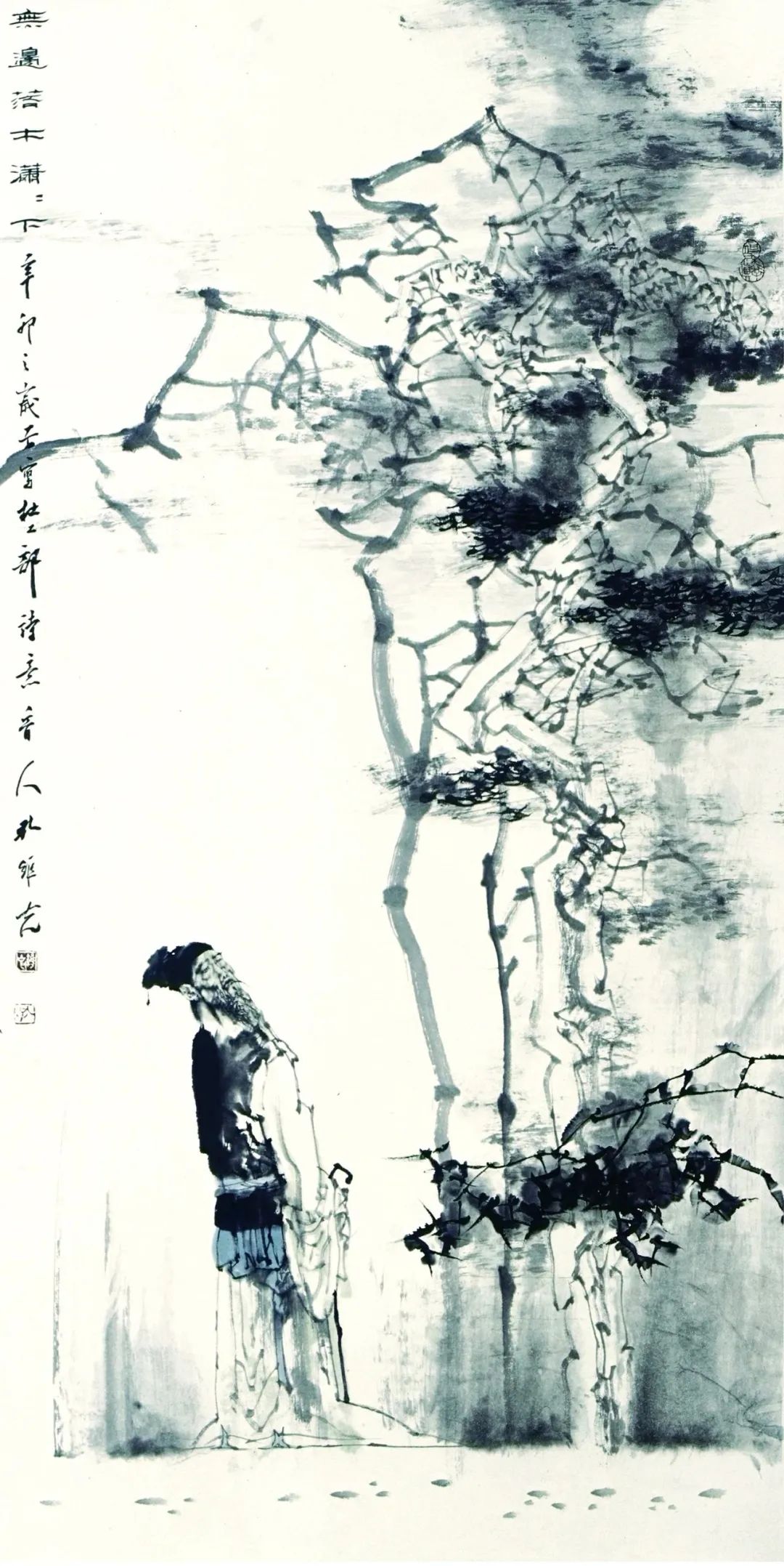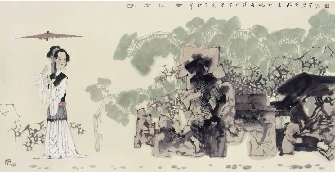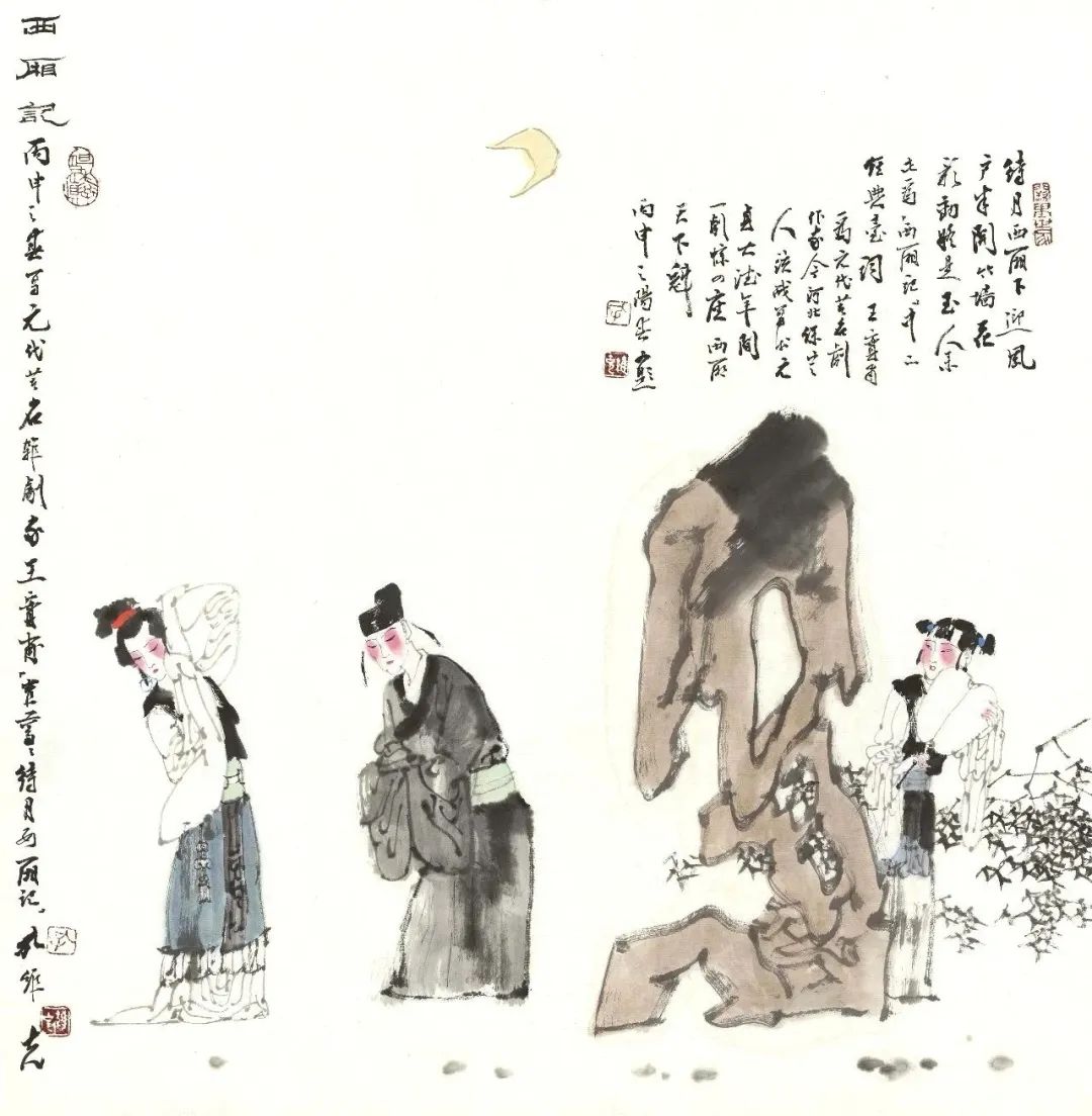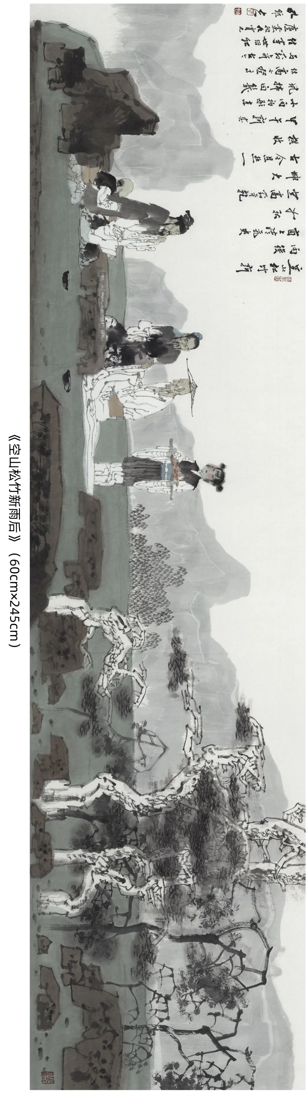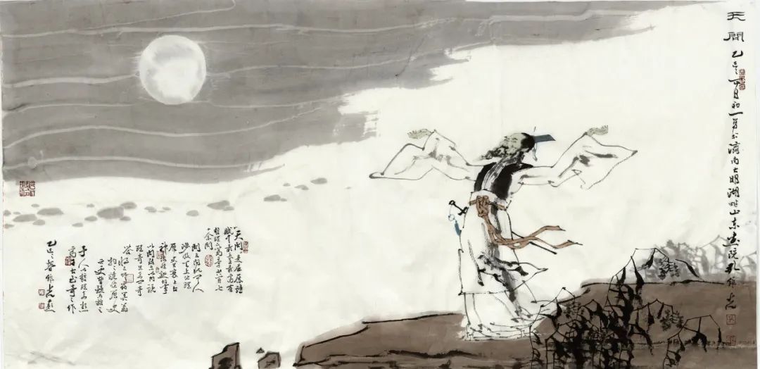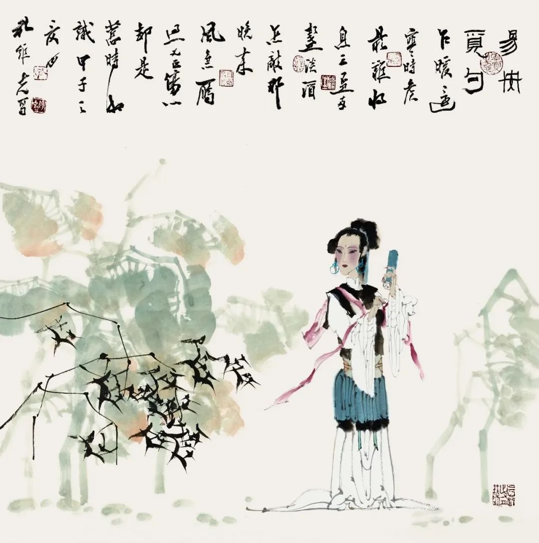 同时,孔维克先生对作品题跋内容十分重视,为此他长年书法临池不惙,并进行过一段篆刻的研习,以提高对篆刻的领悟力。他认为题跋不仅是画面的补充,更是思想表达的延伸。在题跋时,他常常将文字按照画面需求组成“面”抑或“线”,使之与篆刻印章的“点”形成节奏对比并相互呼应,与画中人物造型等绘画元素共同布局安排,体现出他对传统文人画“诗书画印”的深刻传承,而且通过题跋文字的叙事性、哲理性与象征性,赋予作品多维度的文化解读与价值升华。