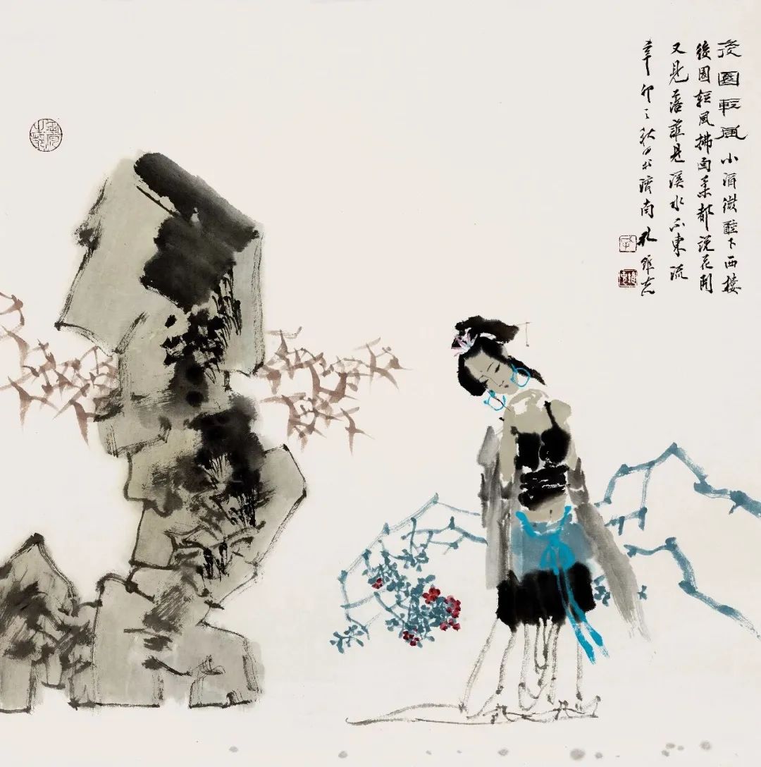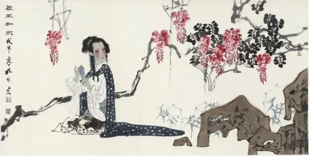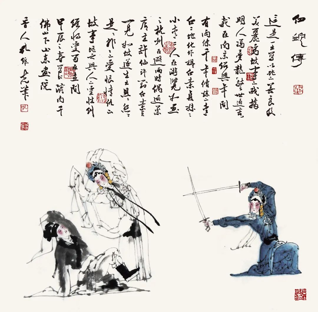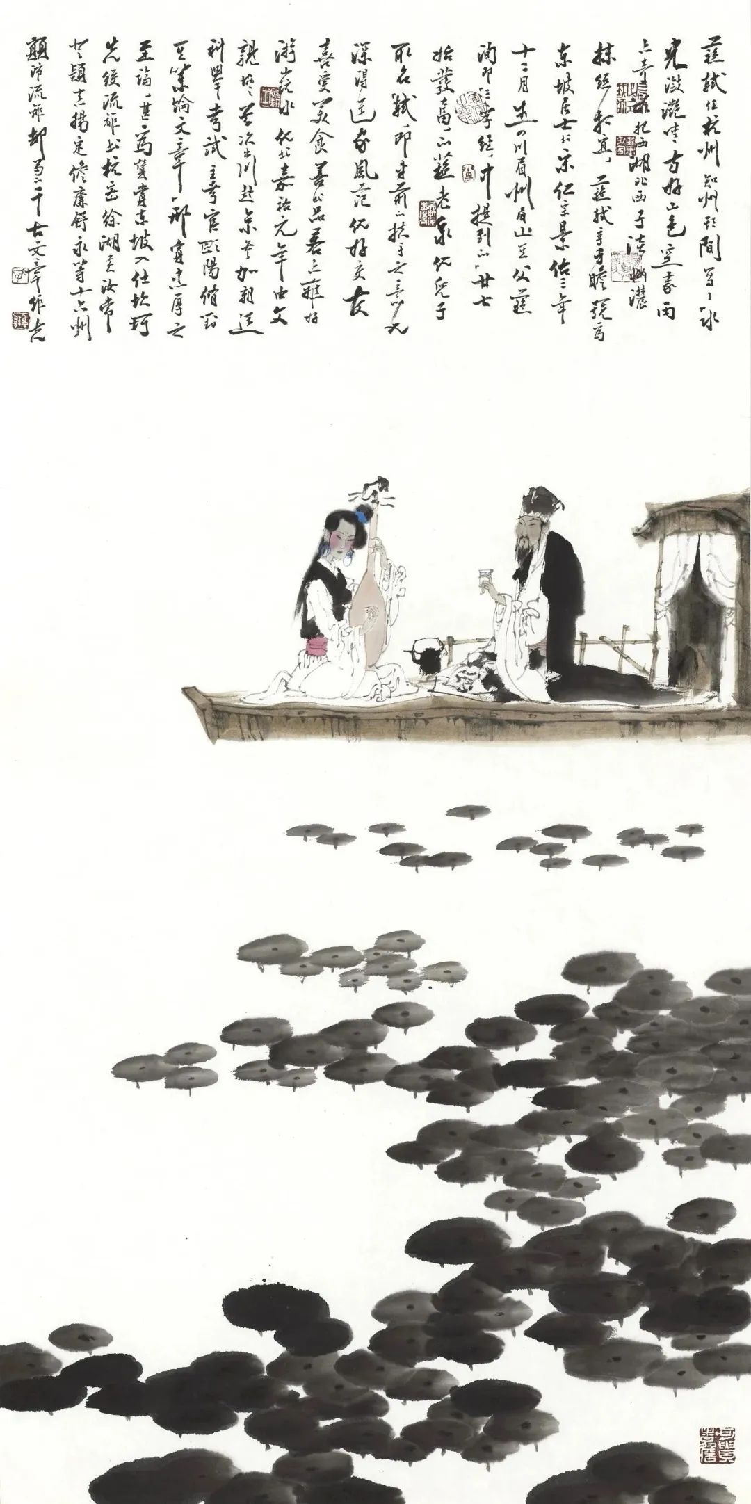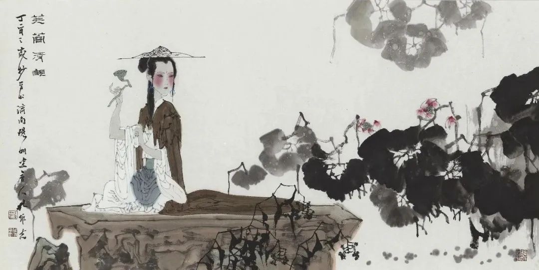 同时,孔维克先生对作品题跋内容十分重视,为此他长年书法临池不惙,并进行过一段篆刻的研习,以提高对篆刻的领悟力。他认为题跋不仅是画面的补充,更是思想表达的延伸。在题跋时,他常常将文字按照画面需求组成“面”抑或“线”,使之与篆刻印章的“点”形成节奏对比并相互呼应,与画中人物造型等绘画元素共同布局安排,体现出他对传统文人画“诗书画印”的深刻传承,而且通过题跋文字的叙事性、哲理性与象征性,赋予作品多维度的文化解读与价值升华。