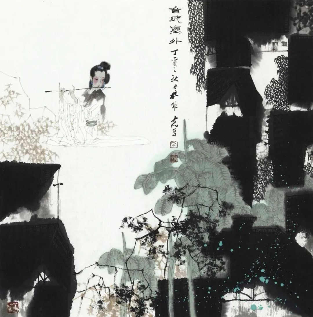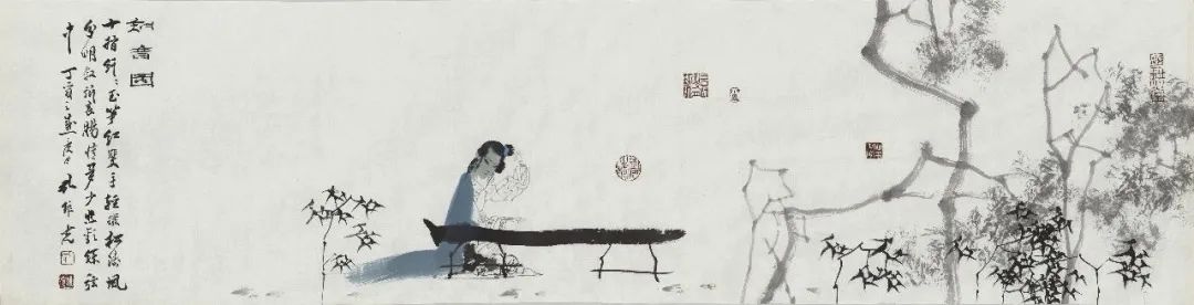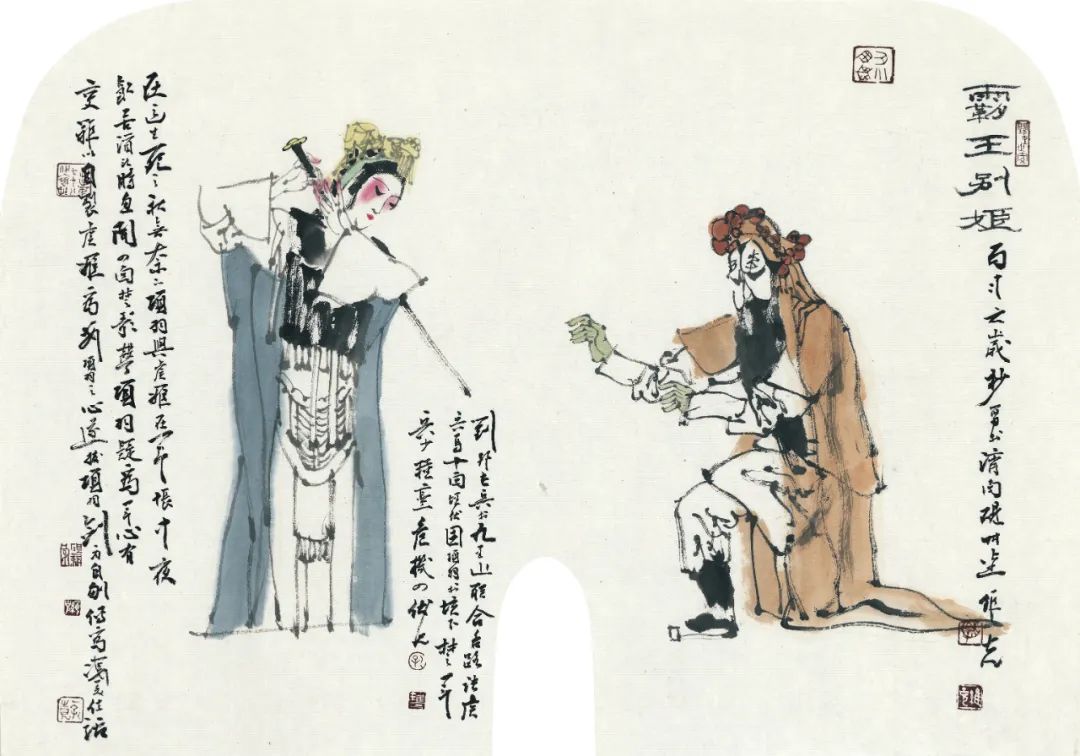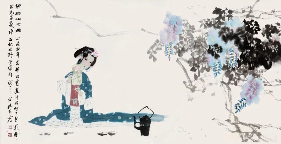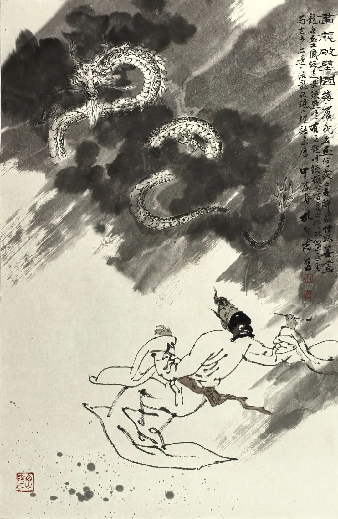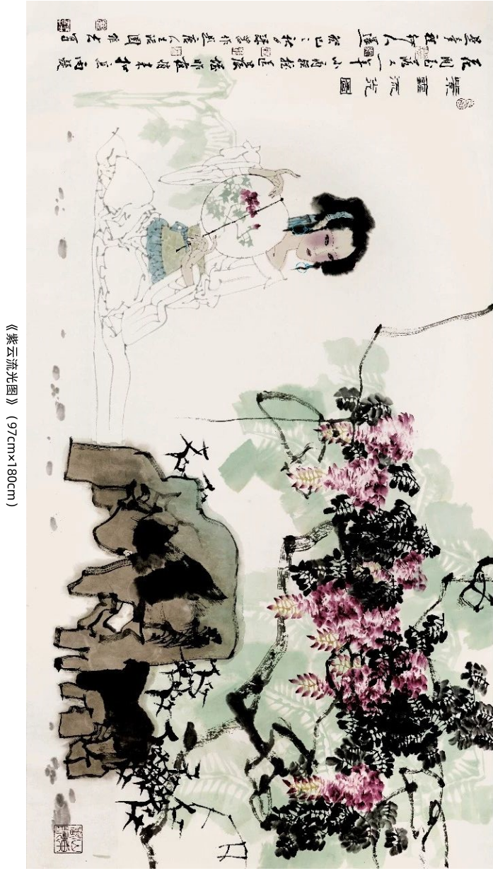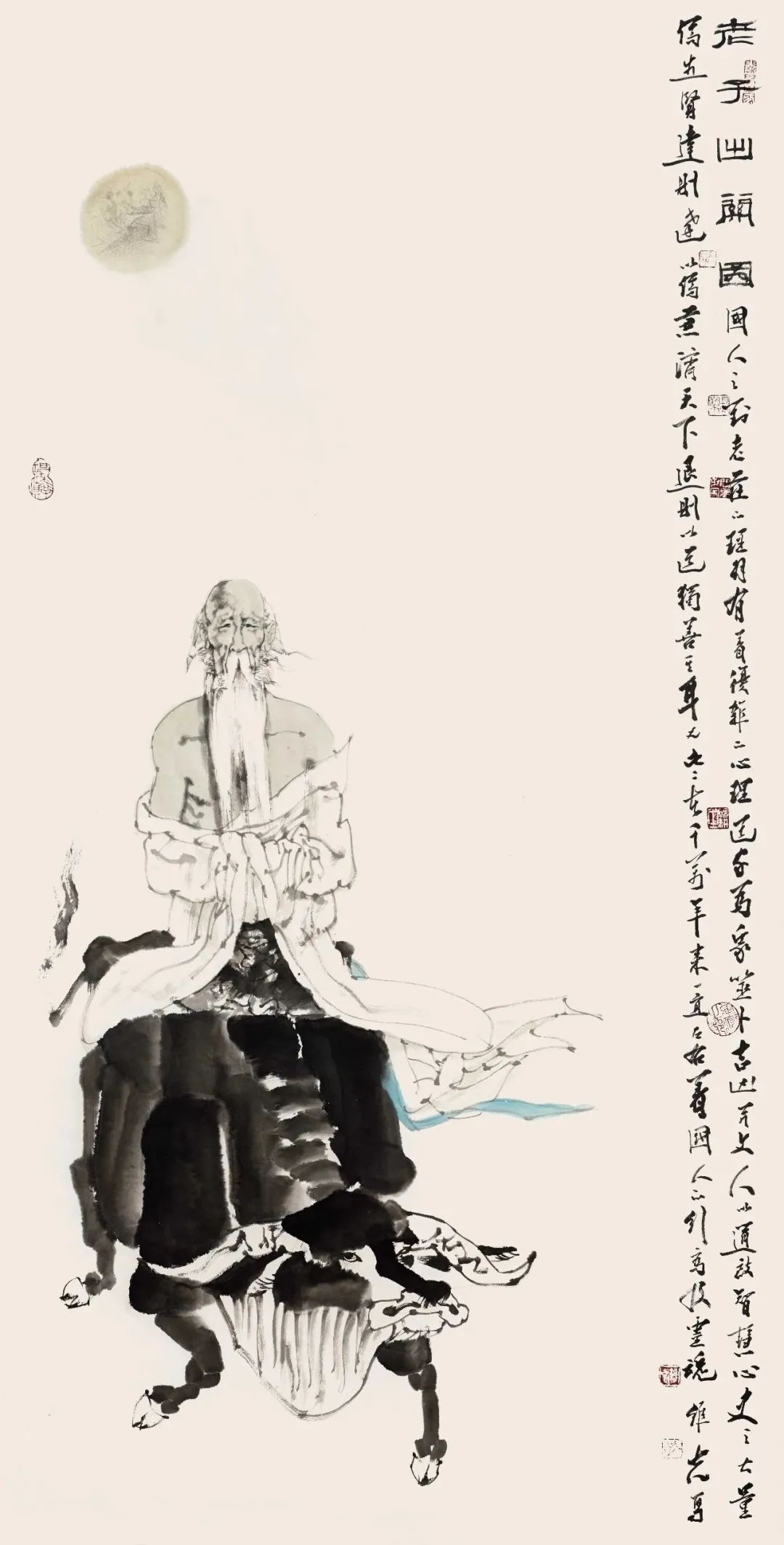 同时,孔维克先生对作品题跋内容十分重视,为此他长年书法临池不惙,并进行过一段篆刻的研习,以提高对篆刻的领悟力。他认为题跋不仅是画面的补充,更是思想表达的延伸。在题跋时,他常常将文字按照画面需求组成“面”抑或“线”,使之与篆刻印章的“点”形成节奏对比并相互呼应,与画中人物造型等绘画元素共同布局安排,体现出他对传统文人画“诗书画印”的深刻传承,而且通过题跋文字的叙事性、哲理性与象征性,赋予作品多维度的文化解读与价值升华。