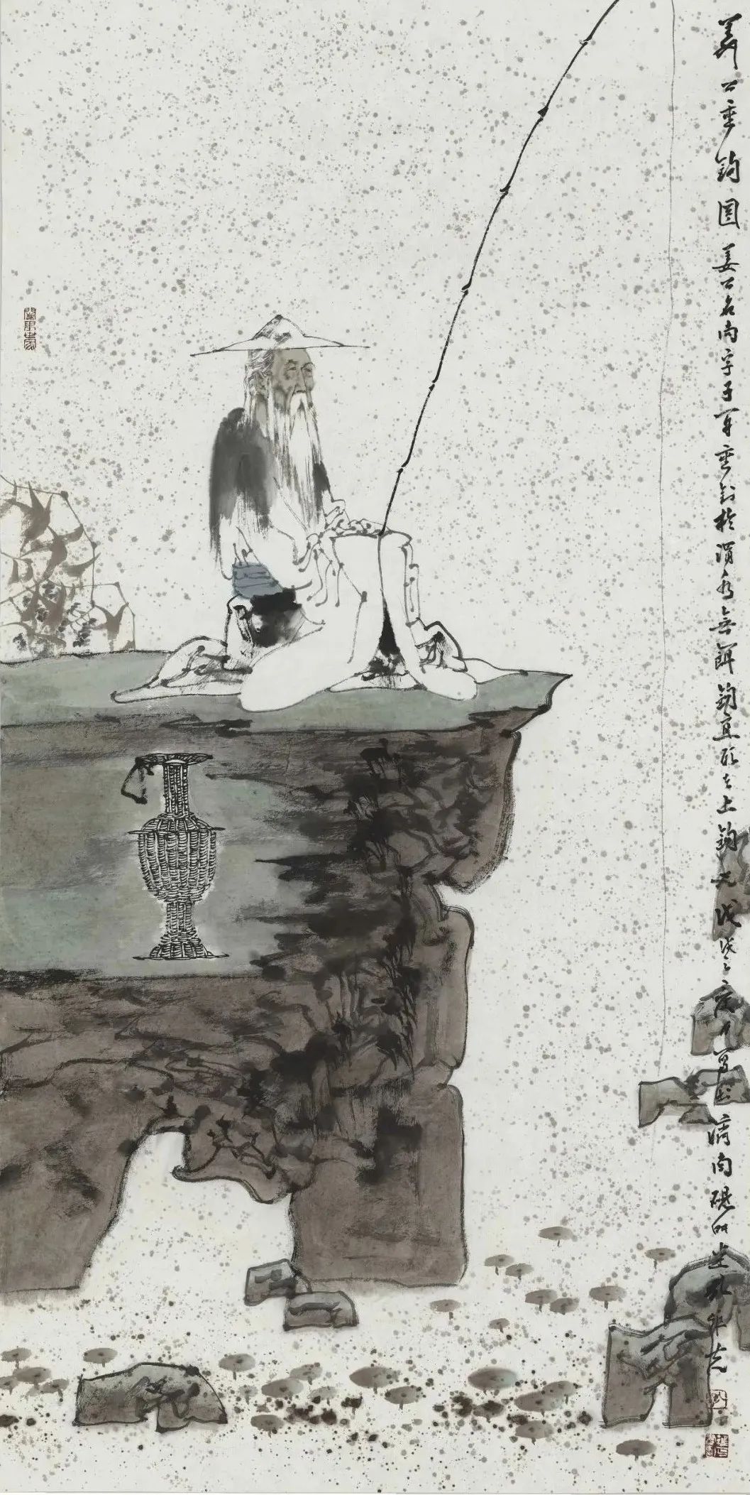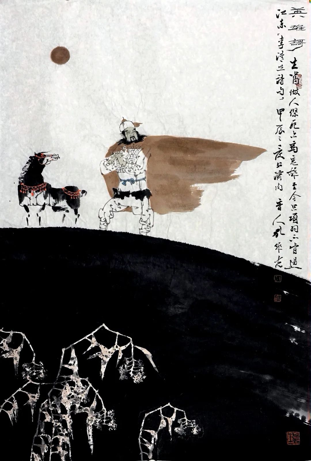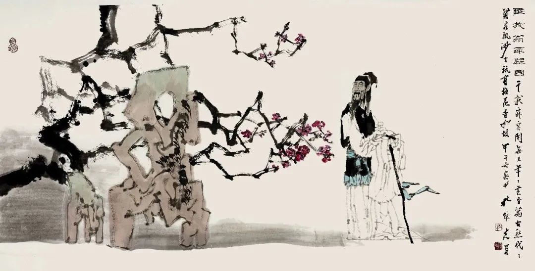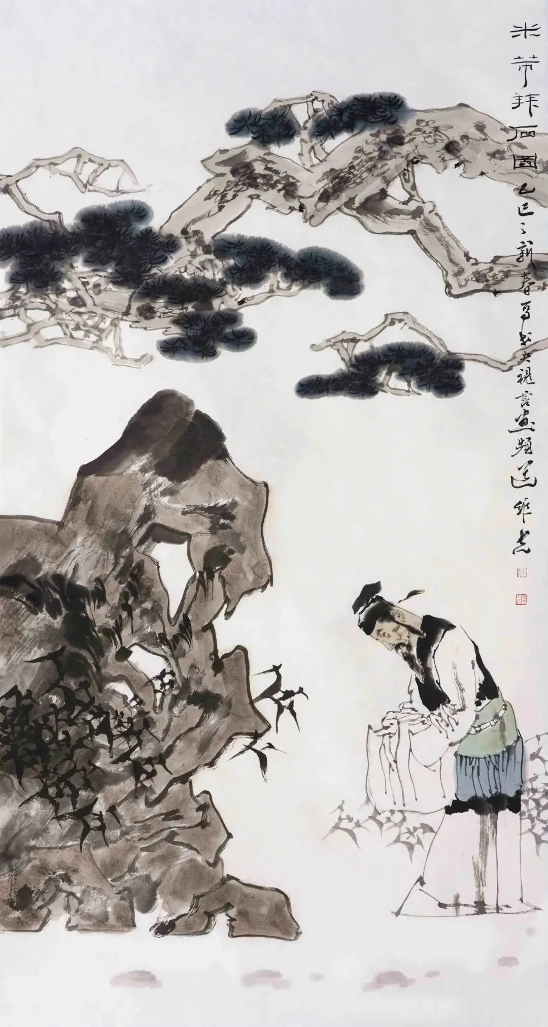 孔维克先生画古典人物题材,从不满足于表面的故事叙述,而是深入典籍,从经史子集、诗词歌赋中挖掘那些被岁月尘封的人物和故事。每一张作品他都严谨对待,无论是儒家经典里的圣贤,还是文人墨客笔下的传奇人物,精心设计典型造型,反复斟酌场景细节,以经典情节、典型形象赋予传统文化新的生命力。如在《高士图》《姜公垂钓图》等作品中,将古代文人的超脱精神与当代社会的个体反思相联结,画面中的人物虽身着古装,但其神态与场景设计暗含现代人对“诗意栖居”的向往。《米芾拜石》《苏东坡诗意》等以简淡的笔墨勾勒出文人的孤傲与洒脱,既呼应传统文人画的“逸品”追求,又融入现代人对文人精神的追求。《老子出关图》的画面中,老子神态悠然,目光深邃,仿佛蕴含着对世间万物的洞察,传达出道家顺应自然、无为而治的文化思想。在当代社会,这种对内心宁静与精神富足的追求,正是“修身” 思想的延伸。而《苏武牧羊》是对儒家“忠”“义”精神的生动诠释,画面里,苏武在冰天雪地中手持汉节,目光坚定,虽历经磨难却始终坚守对国家和民族的忠诚,这也契合当下对文人高尚品格的推崇。这些作品不仅是对传统经典的艺术表达,更是立足当代语境,展现出传统士人精神同当代家国情怀之间的关联与呼应。在形式语言的嬗变中,中国人物画始终保持着与东方美学的血脉传承。这种传承渗透于审美观念、文化内涵,更体现在对绘画技法的延续性探索。孔维克先生的艺术创新不仅体现于对传统文化内核的转译,更在于对传统笔墨、构图与色彩的突破性重构,形成了一种兼具东方意蕴与现代美感的视觉语言,为当代艺术的发展开拓出极具鲜明特点的审美路径,并造就了他兼具东方书写性与现代表现力的个人语系。孔维克先生以独特的线性语言实现了传统笔法的创造性转化。他对传统绘画的“十八描”加以当代化诠释,在古人提炼的古装人物程式化线描范式的基础上,进行强化与组合,由此创生出一种别具一格的高古韵律美。此外,其线条的质量建立在对书法美学的深度参悟之上,通过驾驭淡墨线条的韵律变化——提按顿挫间见筋骨,转折疾徐中显气韵——既精准塑造人物躯体结构,又使衣纹褶皱成为流动的墨韵诗行。这种将书法用笔转化为造型语言的实践,在《辛稼轩醉酒高吟图》中达到精妙平衡,诗人形象以劲健线条勾勒完成,披风则用赭石浅绛,背景幕帘同样仅以淡墨晕染,三者通过墨色层级的控制形成空间对话,在线与面、虚与实的辩证关系中构建起“笔痕即空间”的创作意识。这种对传统笔法的转译打破了程式化继承的窠臼,而是以现代视觉经验重构了水墨语汇的表现维度,使千年传承的线性传统在当代审美语境中实现突破。孔维克先生的另一创新性在于,巧妙地把传统绘画“计白当黑”理念,转化为平面构图里的点、线、面元素,产生强烈视觉冲击力,这就与古代人物画及当代不少古典题材的人物画相比,凸显出极强的艺术个性。通过这种转化,打破常规构图,让画面不再局限于静态瞬间,而是生动呈现动态过程,并让绘画叙事更具连贯性与生命力。如《姜公垂钓图》中的钓线与款识文字并排垂列于画面右侧,与画面左侧的山石块面对比鲜明,强化了钓线空灵笔法彰显的一种时空交融之感。四条屏《高士图》布局经营颇有意味,严子陵、刘伶、陶潜、林逋四位隐士各自据一屏,但画家为四屏画设置了通用的配景,画面中部的古朴苍劲的梅花,下部的枯荷、墨竹,以及整体处理的墨色块面,将四条屏串联成一个有机的整体,这种处理突出了每位隐士的性情气质,又表达了贯穿其中的隐逸文化内核。这些创作实践将传统留白从画面经营策略转化为哲学思考的载体,使“无画处皆成妙境”的传统理念获得了当代艺术语言的全新阐释。