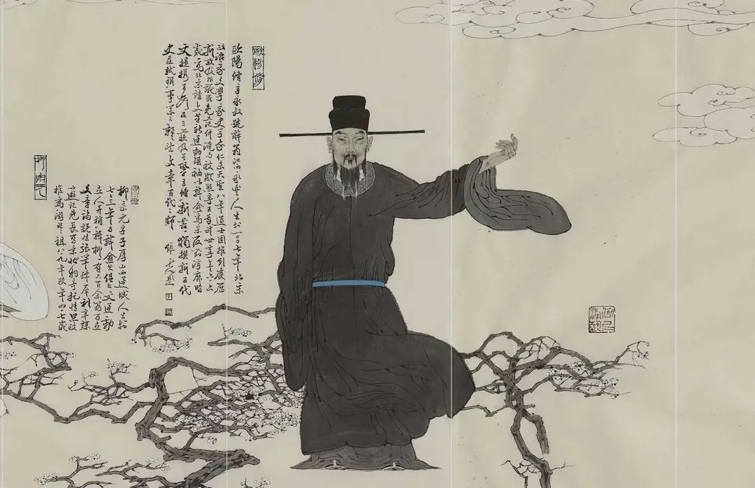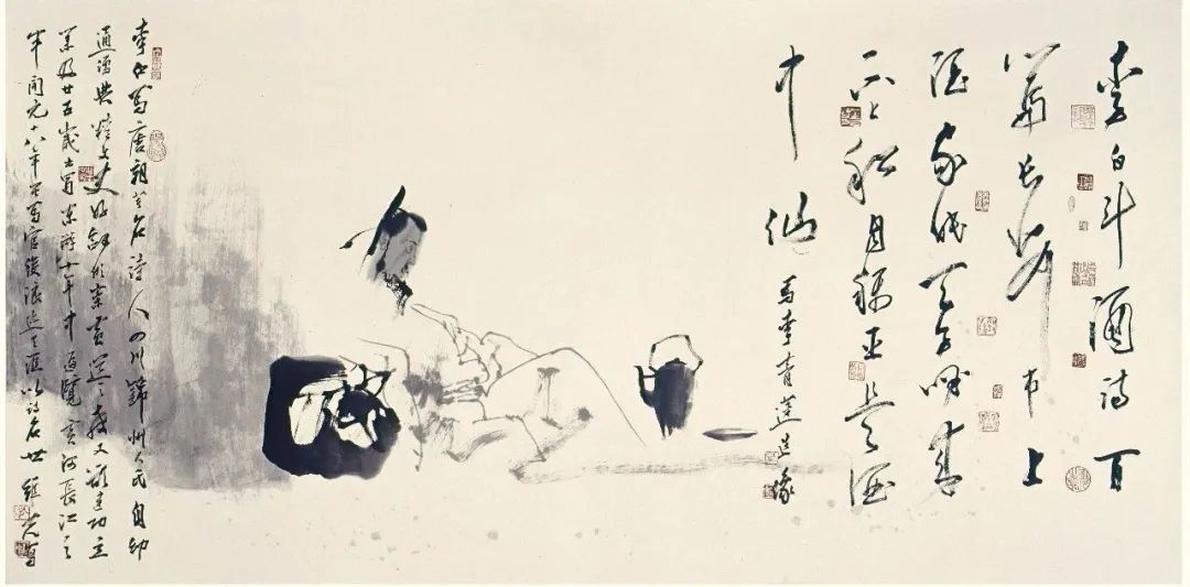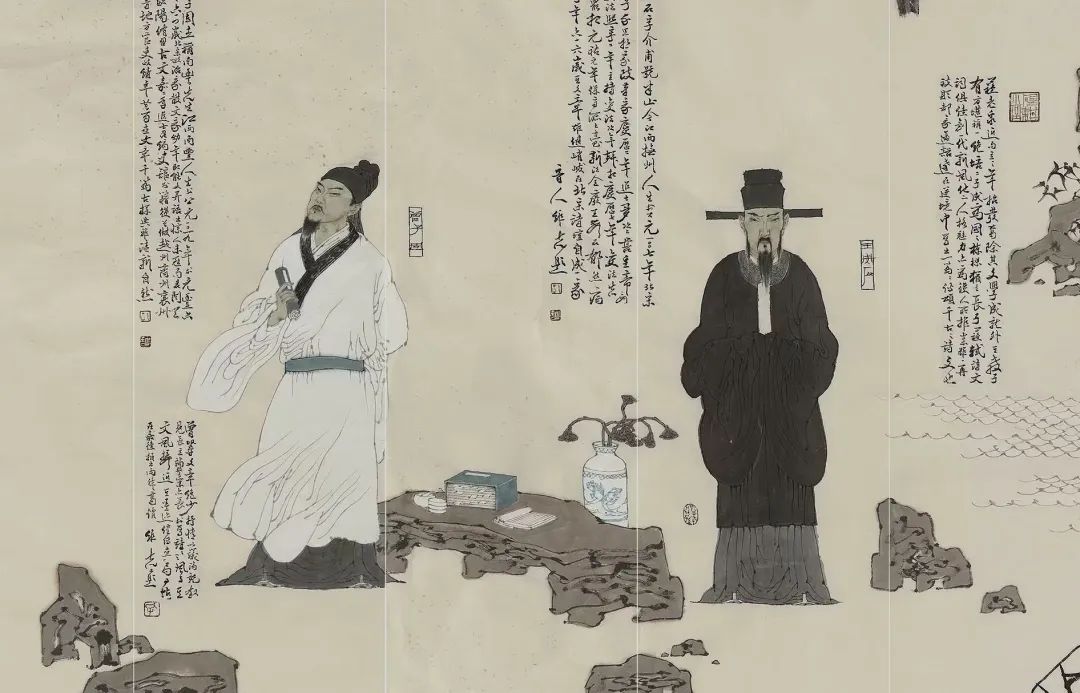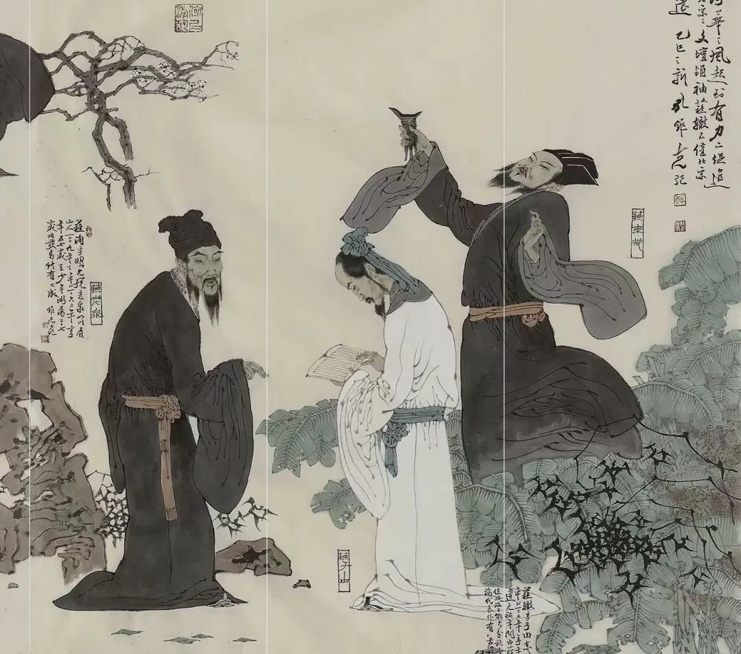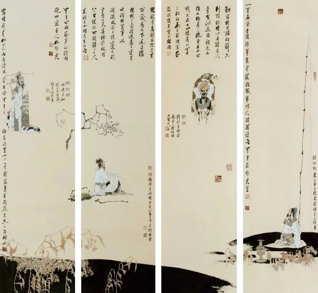 孔维克先生画古典人物题材,从不满足于表面的故事叙述,而是深入典籍,从经史子集、诗词歌赋中挖掘那些被岁月尘封的人物和故事。每一张作品他都严谨对待,无论是儒家经典里的圣贤,还是文人墨客笔下的传奇人物,精心设计典型造型,反复斟酌场景细节,以经典情节、典型形象赋予传统文化新的生命力。如在《高士图》《姜公垂钓图》等作品中,将古代文人的超脱精神与当代社会的个体反思相联结,画面中的人物虽身着古装,但其神态与场景设计暗含现代人对“诗意栖居”的向往。《米芾拜石》《苏东坡诗意》等以简淡的笔墨勾勒出文人的孤傲与洒脱,既呼应传统文人画的“逸品”追求,又融入现代人对文人精神的追求。《老子出关图》的画面中,老子神态悠然,目光深邃,仿佛蕴含着对世间万物的洞察,传达出道家顺应自然、无为而治的文化思想。在当代社会,这种对内心宁静与精神富足的追求,正是“修身” 思想的延伸。而《苏武牧羊》是对儒家“忠”“义”精神的生动诠释,画面里,苏武在冰天雪地中手持汉节,目光坚定,虽历经磨难却始终坚守对国家和民族的忠诚,这也契合当下对文人高尚品格的推崇。这些作品不仅是对传统经典的艺术表达,更是立足当代语境,展现出传统士人精神同当代家国情怀之间的关联与呼应。在形式语言的嬗变中,中国人物画始终保持着与东方美学的血脉传承。这种传承渗透于审美观念、文化内涵,更体现在对绘画技法的延续性探索。孔维克先生的艺术创新不仅体现于对传统文化内核的转译,更在于对传统笔墨、构图与色彩的突破性重构,形成了一种兼具东方意蕴与现代美感的视觉语言,为当代艺术的发展开拓出极具鲜明特点的审美路径,并造就了他兼具东方书写性与现代表现力的个人语系。孔维克先生以独特的线性语言实现了传统笔法的创造性转化。他对传统绘画的“十八描”加以当代化诠释,在古人提炼的古装人物程式化线描范式的基础上,进行强化与组合,由此创生出一种别具一格的高古韵律美。此外,其线条的质量建立在对书法美学的深度参悟之上,通过驾驭淡墨线条的韵律变化——提按顿挫间见筋骨,转折疾徐中显气韵——既精准塑造人物躯体结构,又使衣纹褶皱成为流动的墨韵诗行。这种将书法用笔转化为造型语言的实践,在《辛稼轩醉酒高吟图》中达到精妙平衡,诗人形象以劲健线条勾勒完成,披风则用赭石浅绛,背景幕帘同样仅以淡墨晕染,三者通过墨色层级的控制形成空间对话,在线与面、虚与实的辩证关系中构建起“笔痕即空间”的创作意识。这种对传统笔法的转译打破了程式化继承的窠臼,而是以现代视觉经验重构了水墨语汇的表现维度,使千年传承的线性传统在当代审美语境中实现突破。孔维克先生的另一创新性在于,巧妙地把传统绘画“计白当黑”理念,转化为平面构图里的点、线、面元素,产生强烈视觉冲击力,这就与古代人物画及当代不少古典题材的人物画相比,凸显出极强的艺术个性。通过这种转化,打破常规构图,让画面不再局限于静态瞬间,而是生动呈现动态过程,并让绘画叙事更具连贯性与生命力。如《姜公垂钓图》中的钓线与款识文字并排垂列于画面右侧,与画面左侧的山石块面对比鲜明,强化了钓线空灵笔法彰显的一种时空交融之感。四条屏《高士图》布局经营颇有意味,严子陵、刘伶、陶潜、林逋四位隐士各自据一屏,但画家为四屏画设置了通用的配景,画面中部的古朴苍劲的梅花,下部的枯荷、墨竹,以及整体处理的墨色块面,将四条屏串联成一个有机的整体,这种处理突出了每位隐士的性情气质,又表达了贯穿其中的隐逸文化内核。这些创作实践将传统留白从画面经营策略转化为哲学思考的载体,使“无画处皆成妙境”的传统理念获得了当代艺术语言的全新阐释。