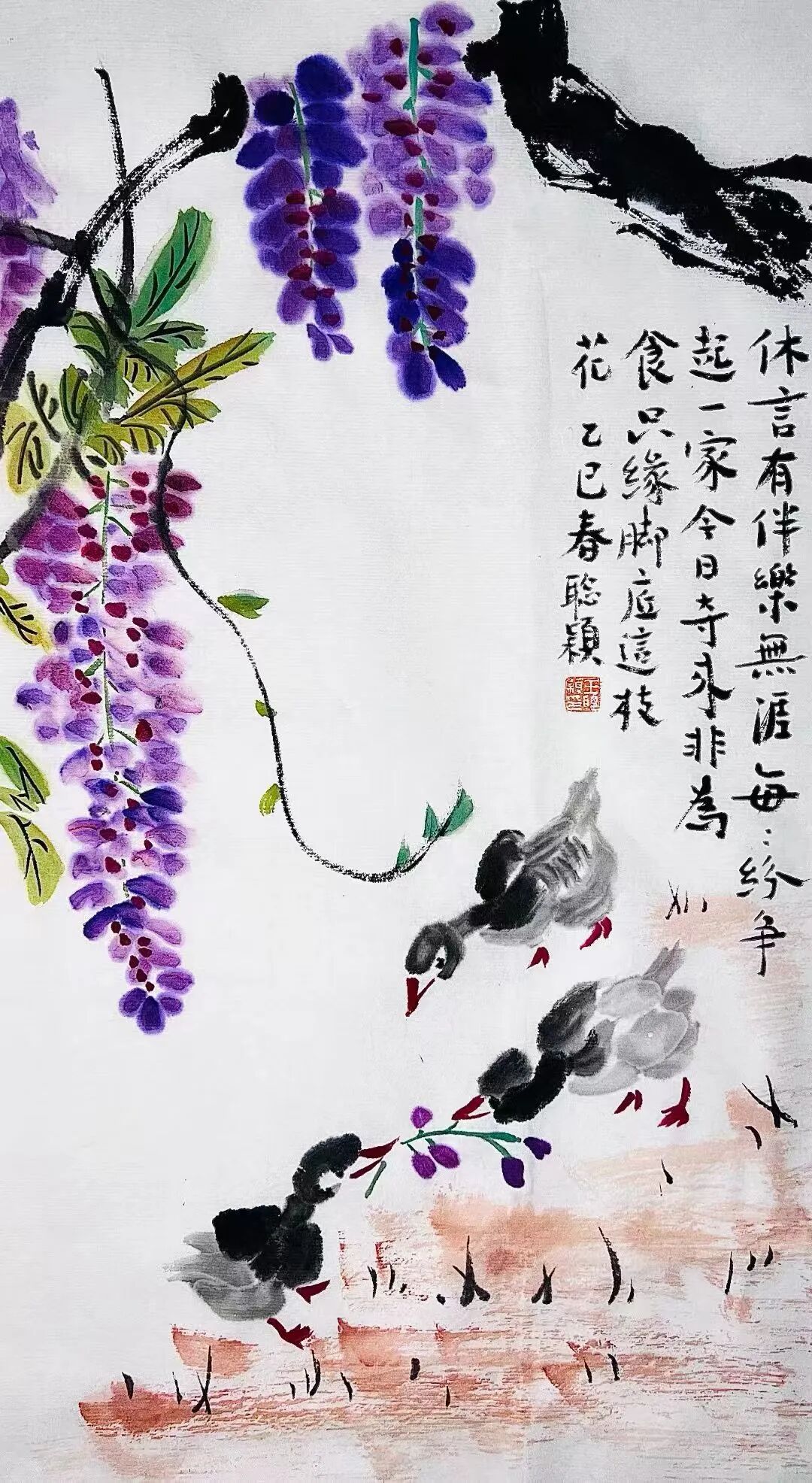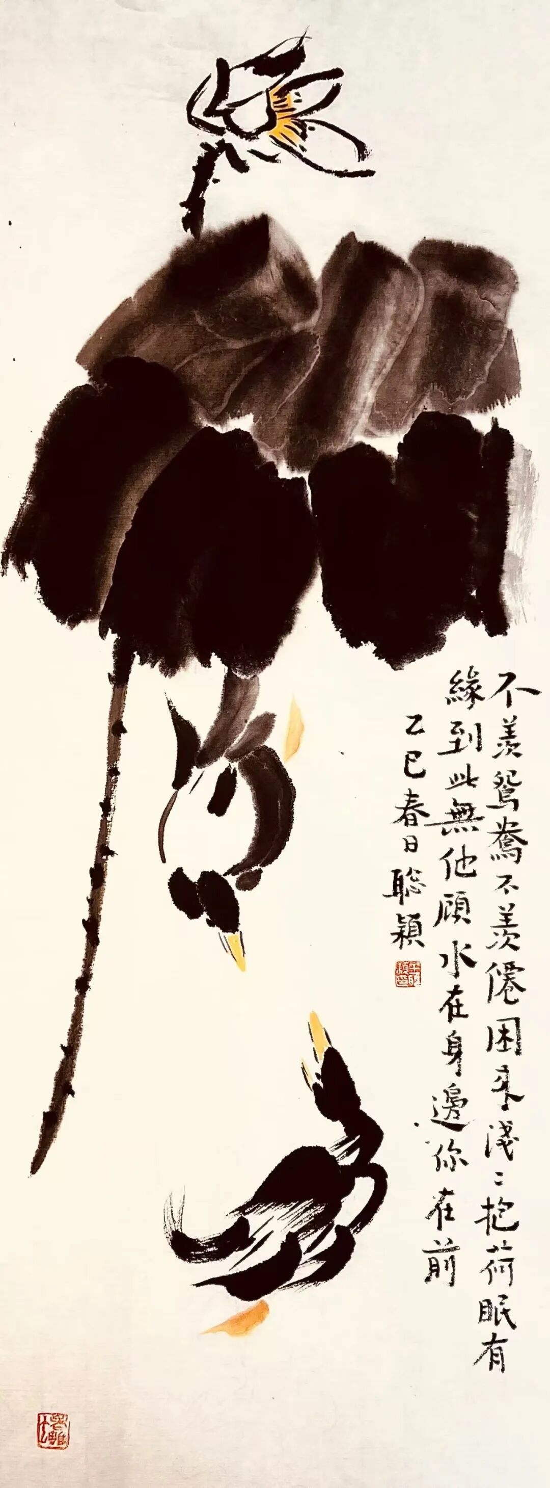 自题荷塘双鸭图