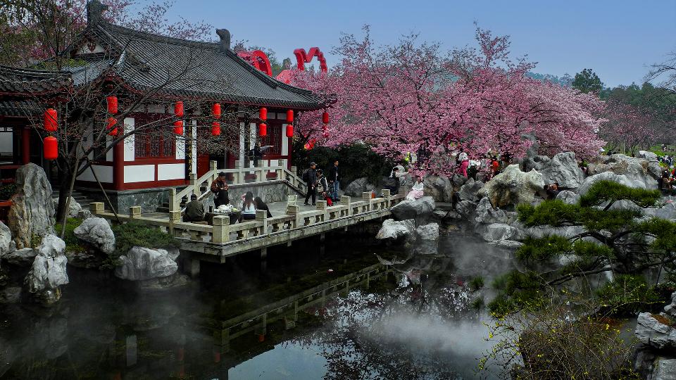 武汉东湖樱花园早樱绽放,樱花如云似霞迎客来