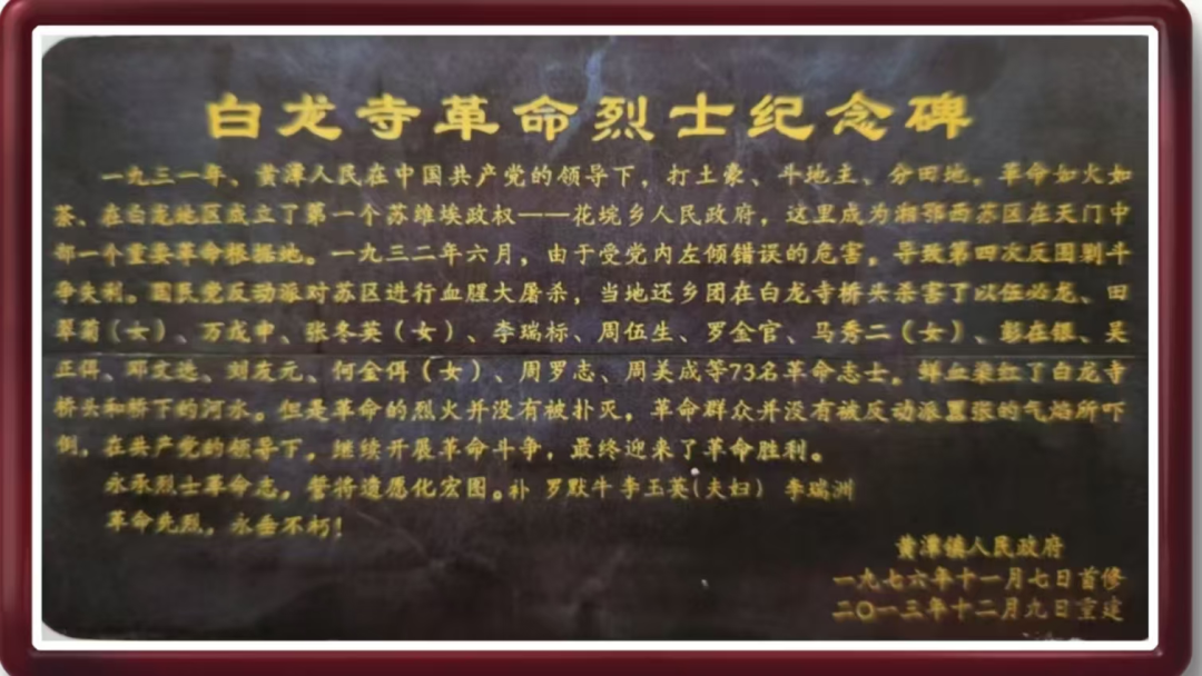 白龙寺村的村民无论是常住该村,还是从这里走出去在外工作的村民、后裔,无论何时何地,始终都没有忘记这块红色土地,是这块土地养育了他们。更没有忘记1932年在白龙桥头被国民党还乡团杀害的76名革命先烈。是他们及全国千千万万个革命先辈流血牺牲,才取得了中国革命的胜利,才有了今天的幸福生活。早在1976年,黄潭人民公社就深入调查,根据群众要求,在这里建立了烈士纪念碑。2012年,市委、市政府花35万多元又重新进行了修建。