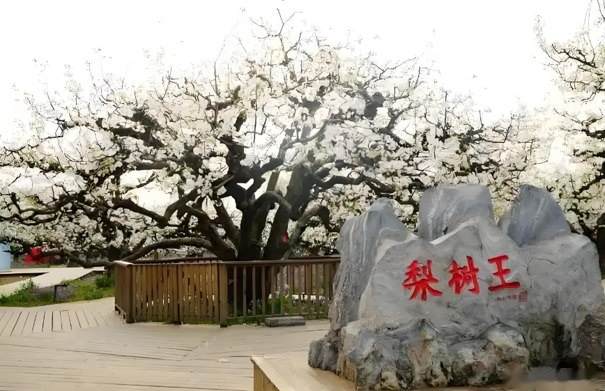 树香,雪香,万顷梨花放。乌龙披雪倍芬芳,处处腾银浪。铁干虬枝,直指穹苍。无双梨树王。树香,雪香,观赏来芒砀。 (过)依稀白雪降,玉砌美琳琅。游人来此忘回乡,醉倒梨花荡。