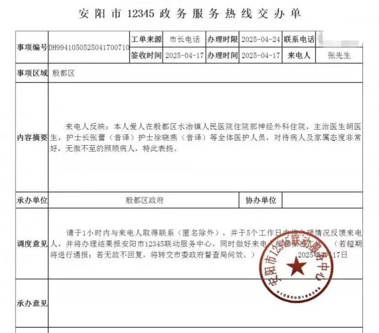 这份来自 12345 平台的反馈,让殷都区人民医院医护人员备受鼓舞。