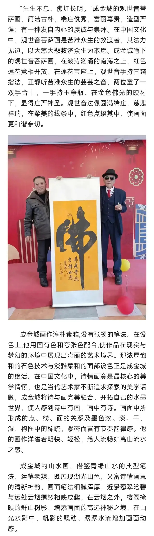成金城在画作中讲究布势,“势”可理解为气势、局势、大势,画人物时,首先找出人物的基本动态线,以确定运动大致方向状态。一幅画也隐含一组动态线,它构成画面的内在旋律,把画面中各个组成部分有机组织在一个运动体系中,是达到“气韵生动”的重要因素。中国画的“置阵布势’’即 “远观其势,近观其质”。成金城在形式美上突显笔墨魅力。近年,成金城作品远销福建地区和东南亚国家。2017年成金城荣获“中国长城文化金奖”,被授予“中国长城艺术家”荣誉称号。
