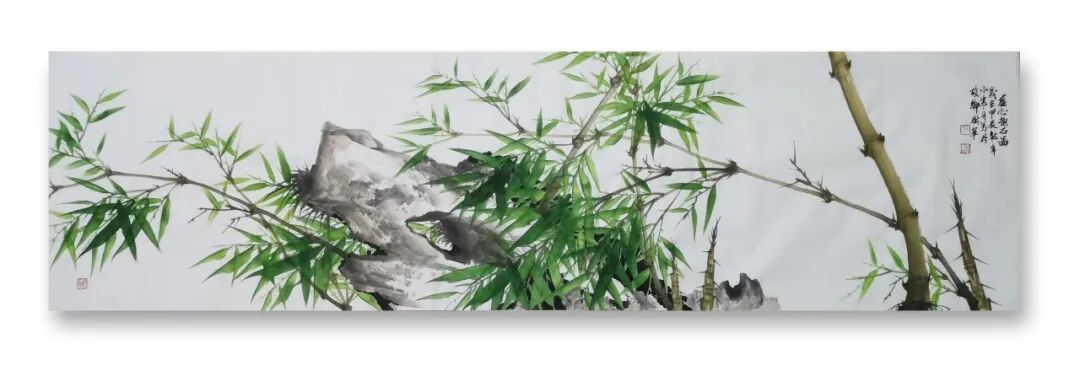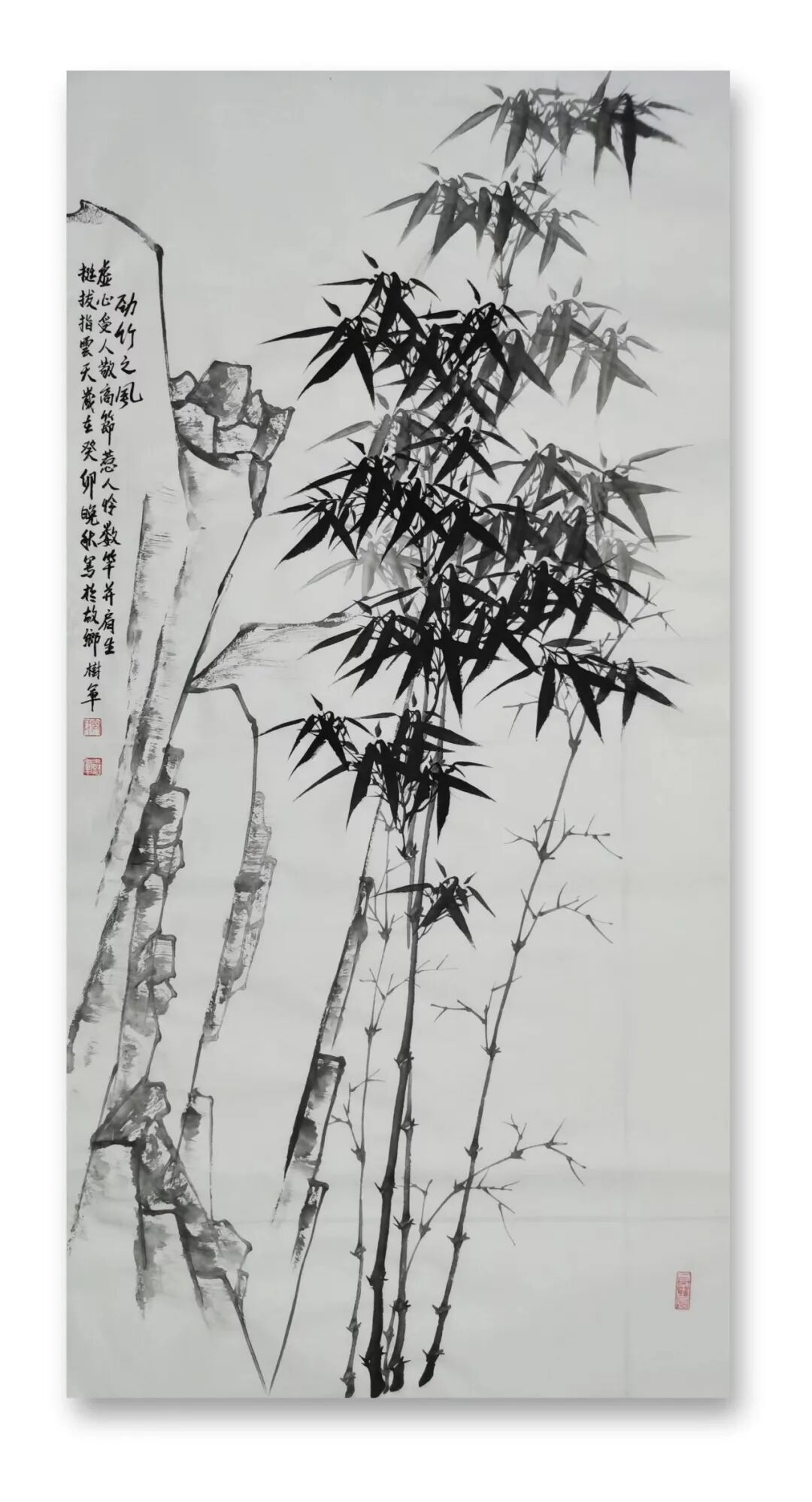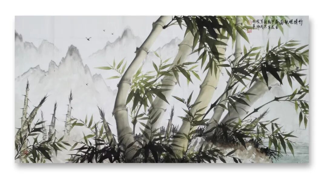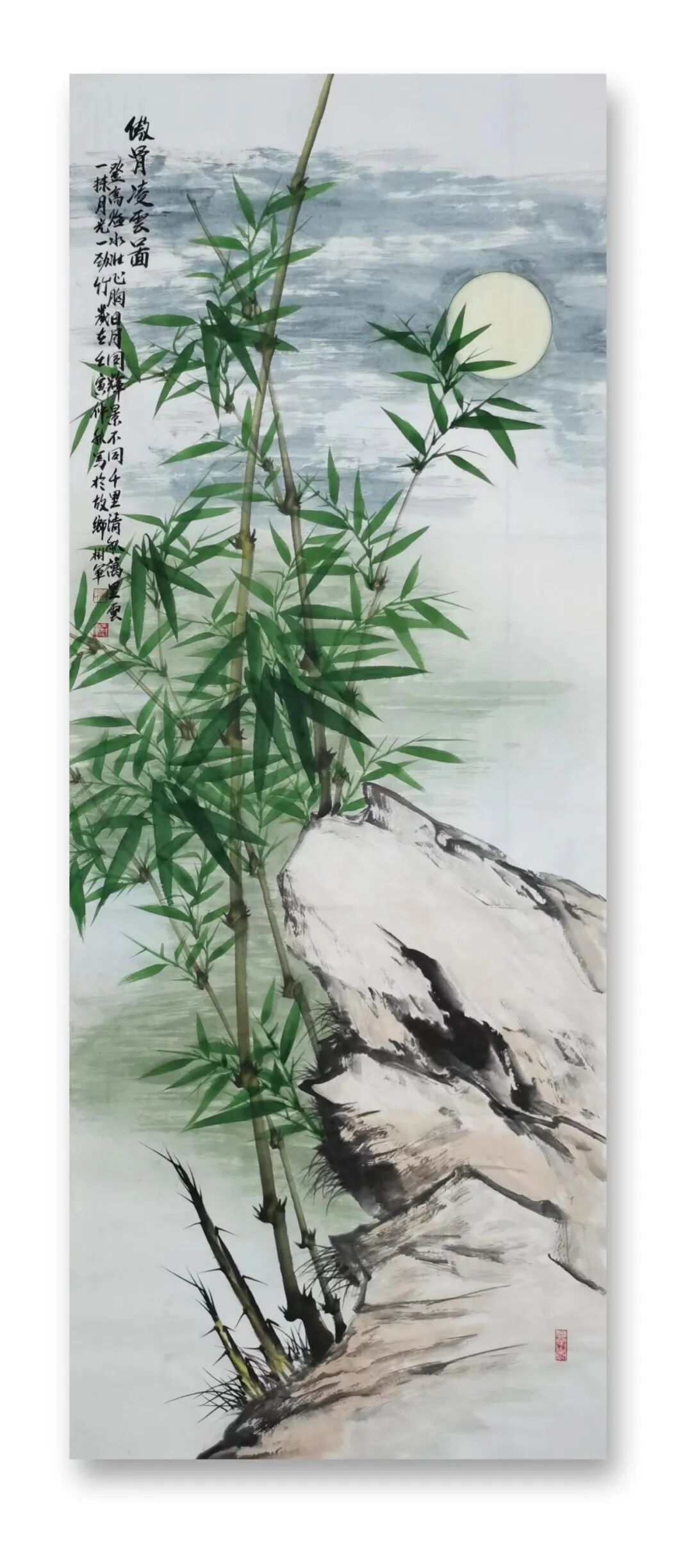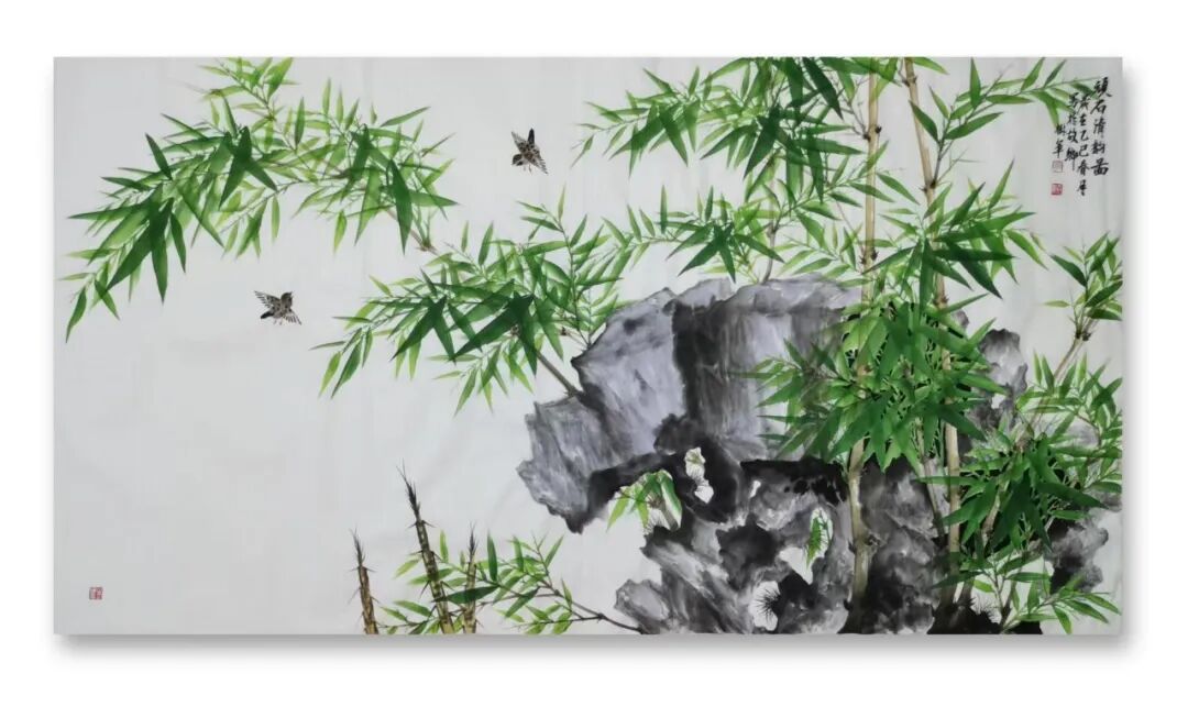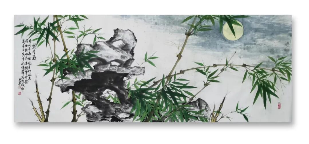 单看他的一幅《竹朋石友图》作品,画中宫树军先生精心布局,是以奇石衬托绿竹风姿,更是以绿竹照应奇石根基,二者之间,单看一者就足以成画,合起来便就更是相辅相成,极具于诗情妙韵!另一幅《清风明月图》中,则是两竿绿竹悠然斜出画面,竹叶间洋溢着清新淡雅的生机,枝叶交错,仿佛有月光穿透其间,洒落点点银辉。乌云月下照翠竹,画意清幽畅心神,可以说,正是凭借着这种凝神遐想、妙悟自然的写意情怀,宫树军先生的竹画作品才会在当代画坛内独树一帜,并最终给人留下了一种深刻而独特的艺术印象!