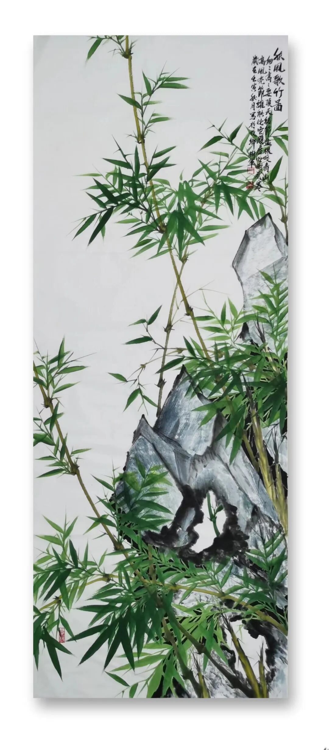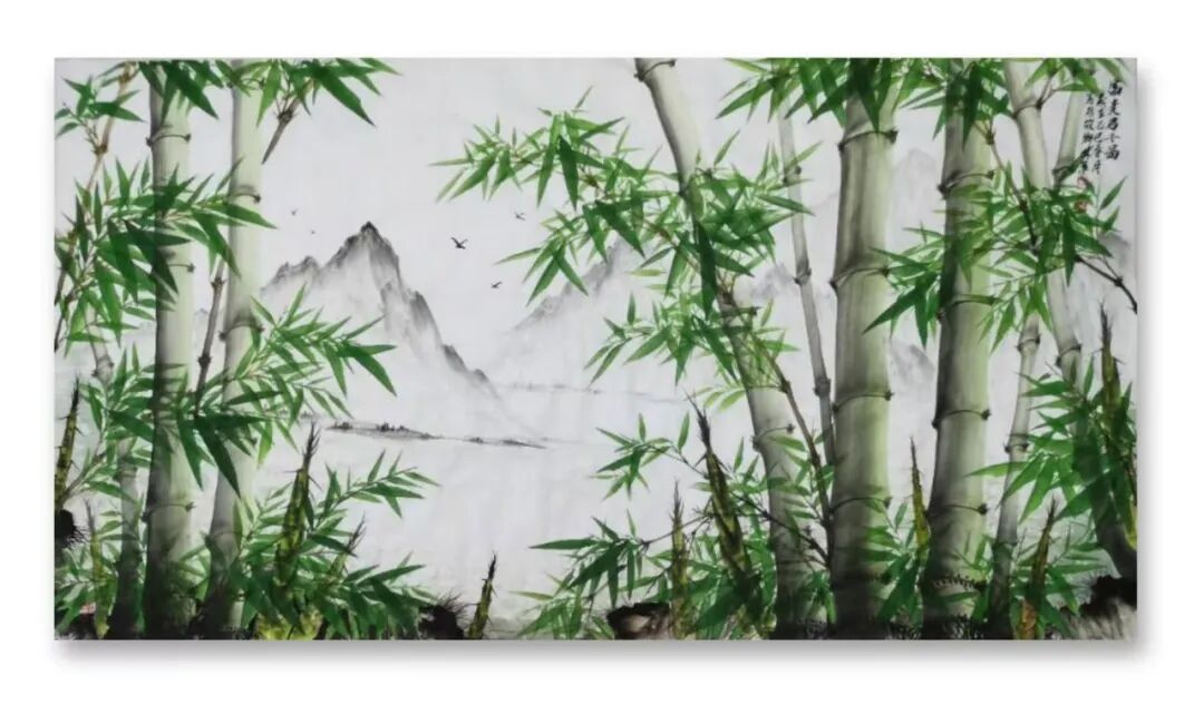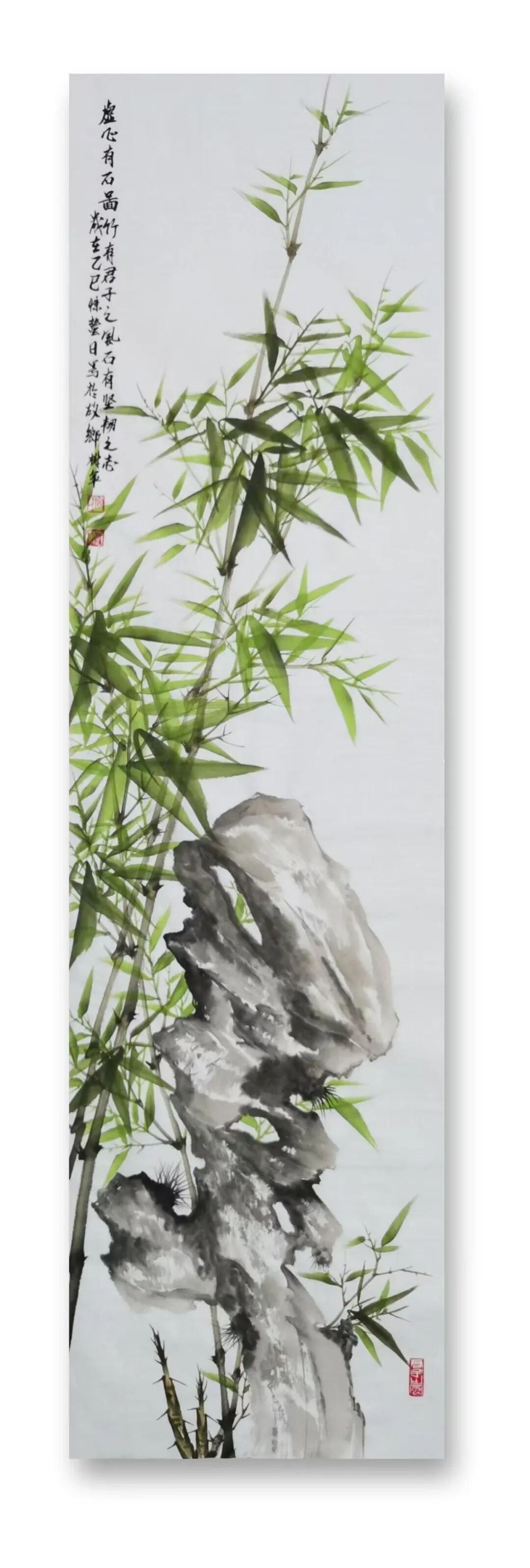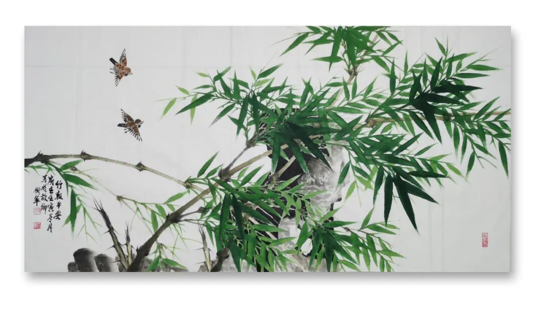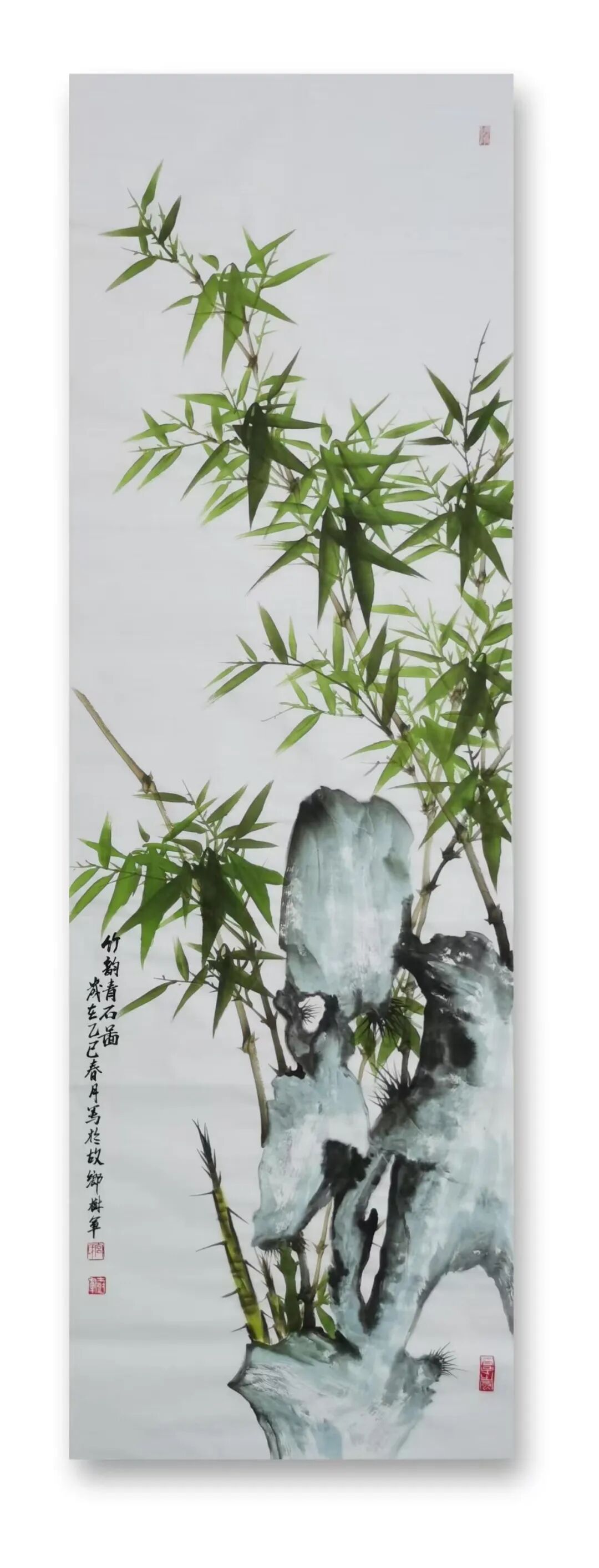 单看他的一幅《竹朋石友图》作品,画中宫树军先生精心布局,是以奇石衬托绿竹风姿,更是以绿竹照应奇石根基,二者之间,单看一者就足以成画,合起来便就更是相辅相成,极具于诗情妙韵!另一幅《清风明月图》中,则是两竿绿竹悠然斜出画面,竹叶间洋溢着清新淡雅的生机,枝叶交错,仿佛有月光穿透其间,洒落点点银辉。乌云月下照翠竹,画意清幽畅心神,可以说,正是凭借着这种凝神遐想、妙悟自然的写意情怀,宫树军先生的竹画作品才会在当代画坛内独树一帜,并最终给人留下了一种深刻而独特的艺术印象!