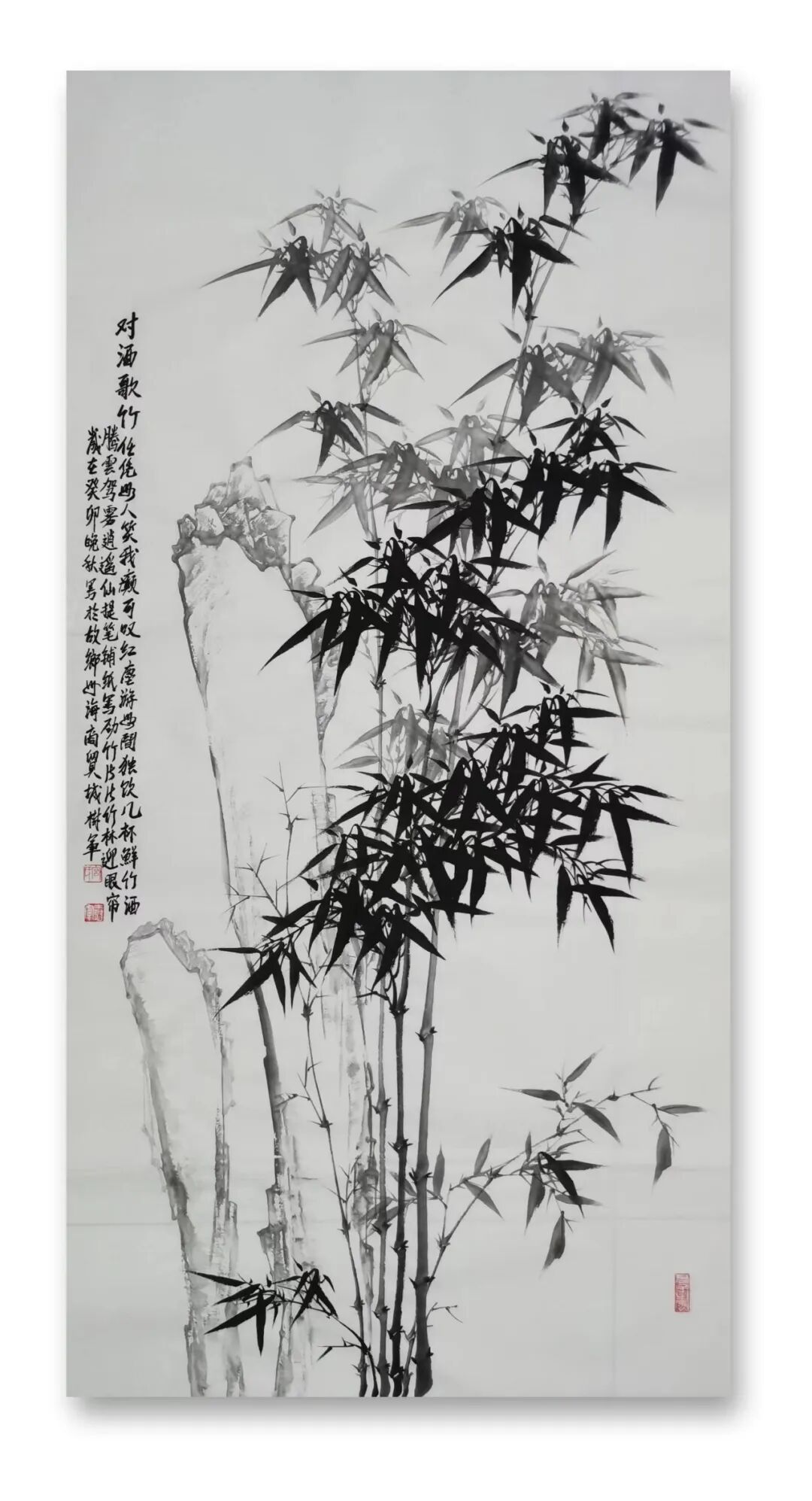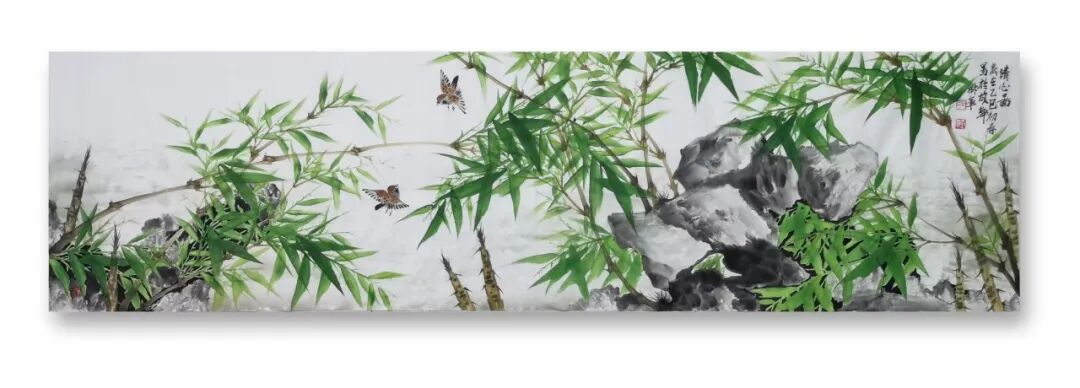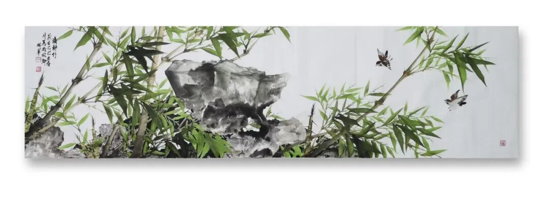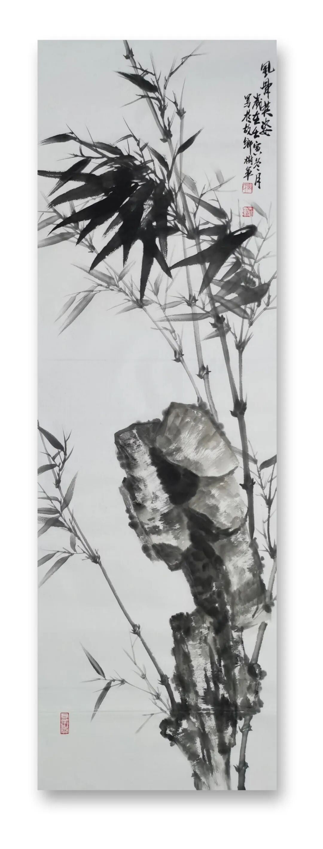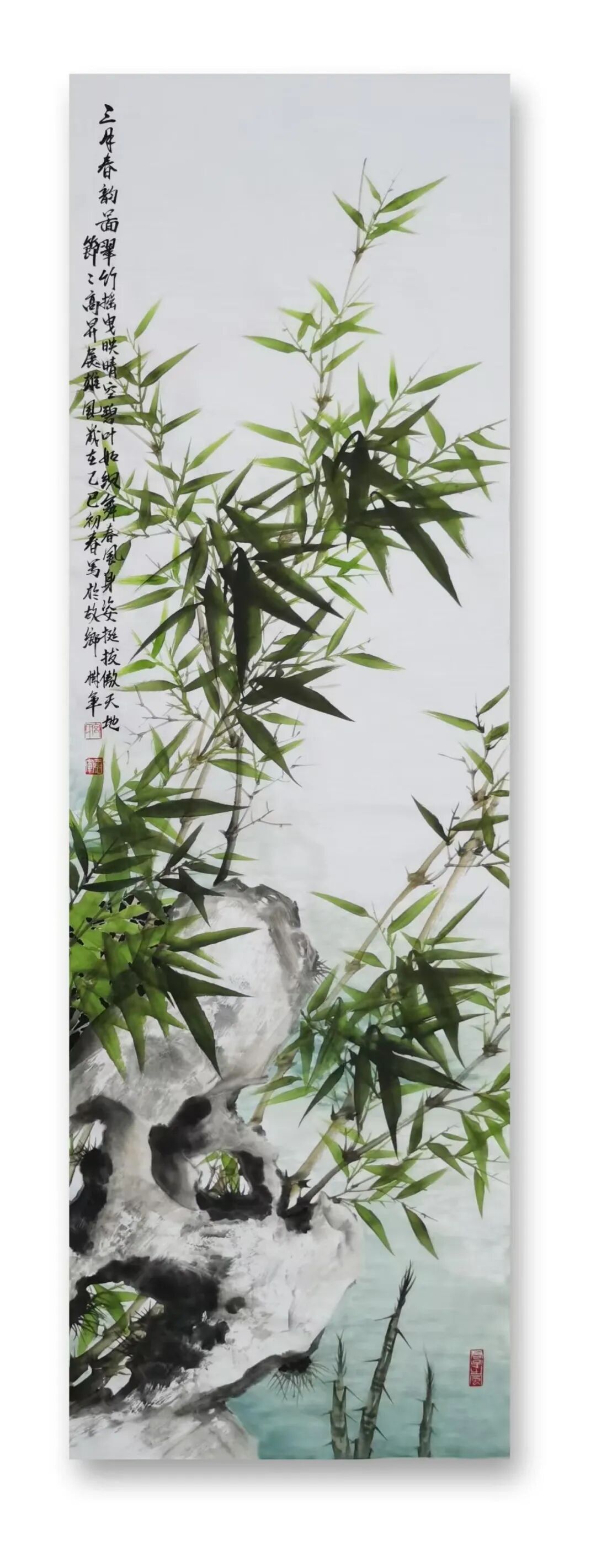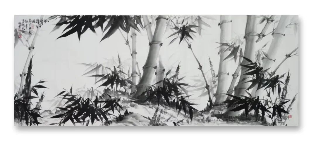 单看他的一幅《竹朋石友图》作品,画中宫树军先生精心布局,是以奇石衬托绿竹风姿,更是以绿竹照应奇石根基,二者之间,单看一者就足以成画,合起来便就更是相辅相成,极具于诗情妙韵!另一幅《清风明月图》中,则是两竿绿竹悠然斜出画面,竹叶间洋溢着清新淡雅的生机,枝叶交错,仿佛有月光穿透其间,洒落点点银辉。乌云月下照翠竹,画意清幽畅心神,可以说,正是凭借着这种凝神遐想、妙悟自然的写意情怀,宫树军先生的竹画作品才会在当代画坛内独树一帜,并最终给人留下了一种深刻而独特的艺术印象!