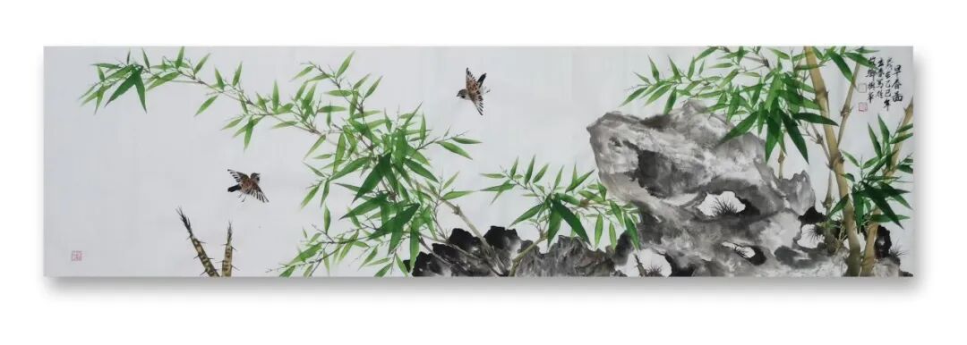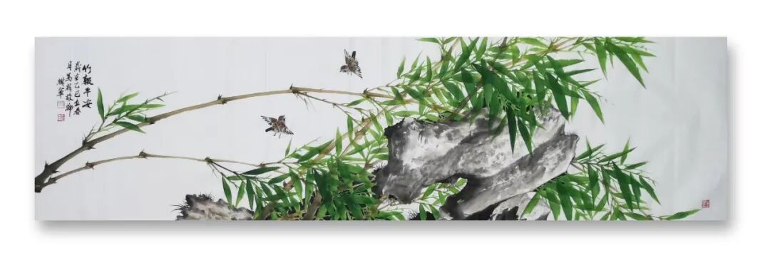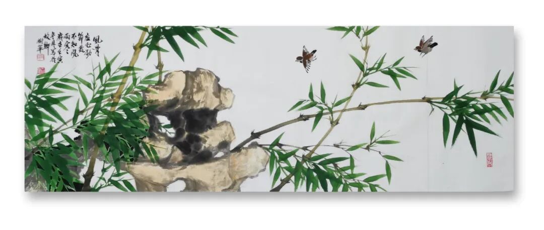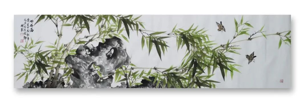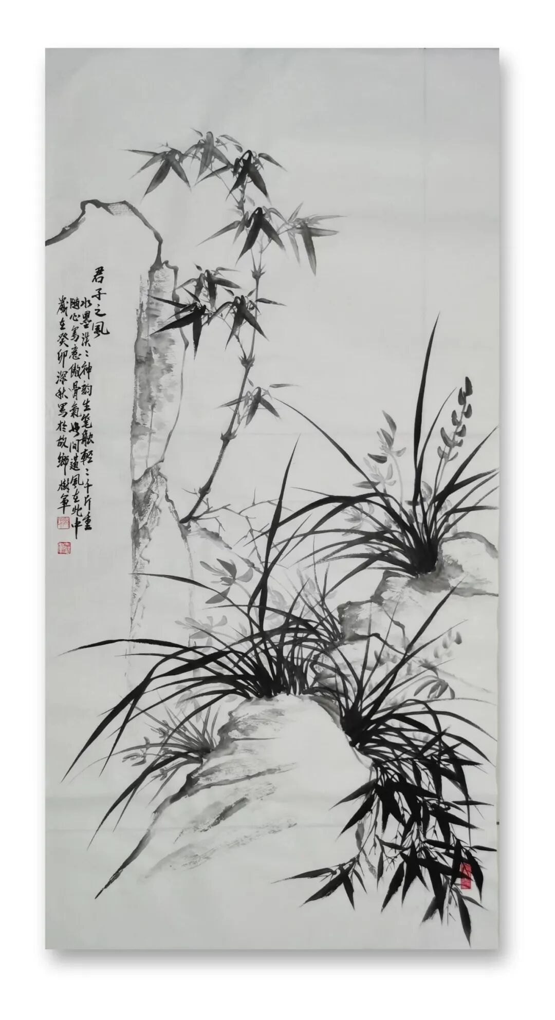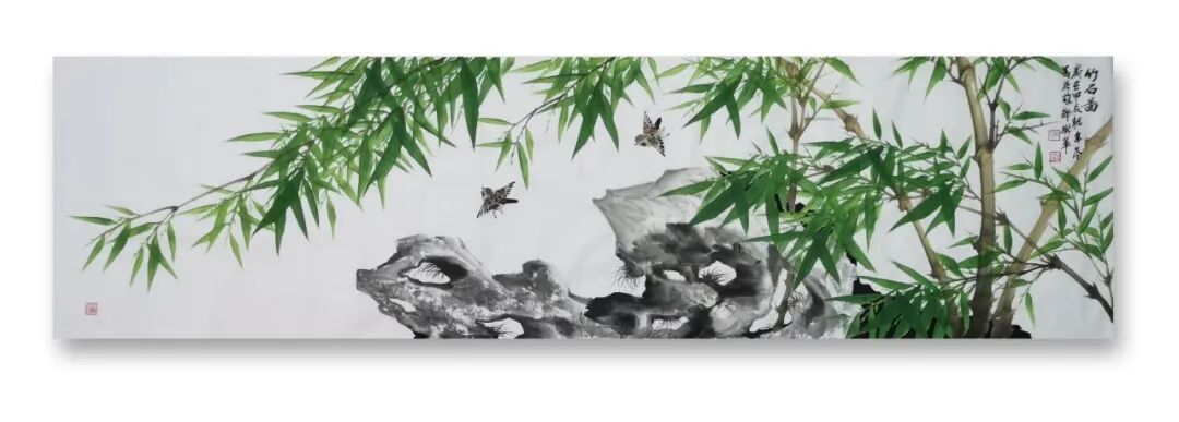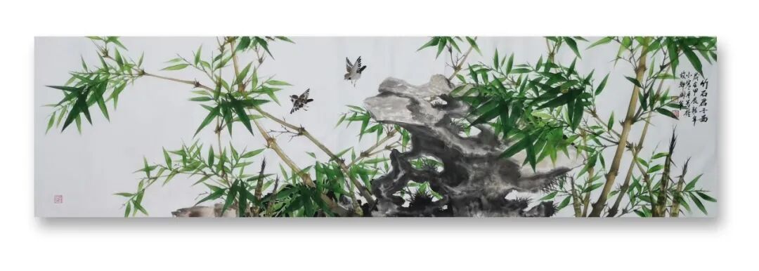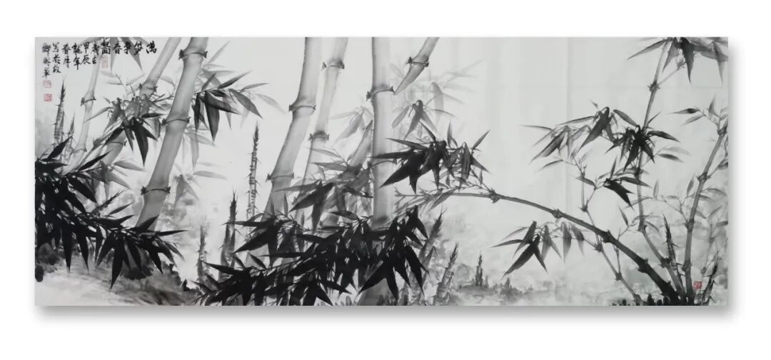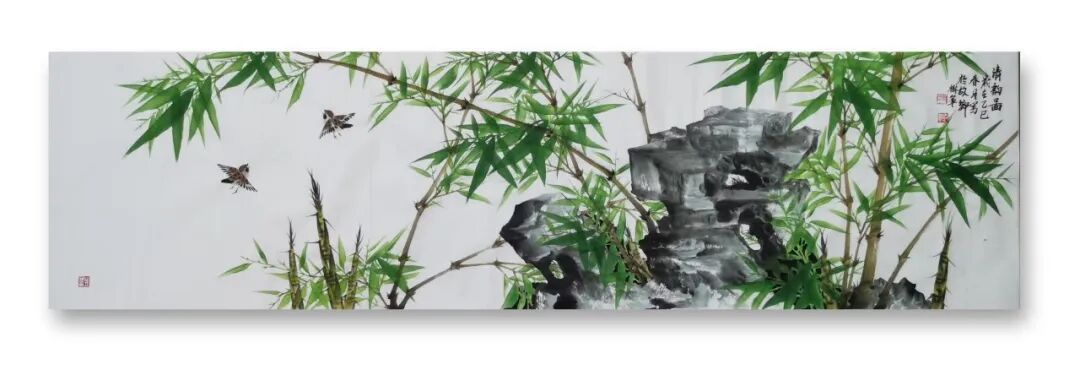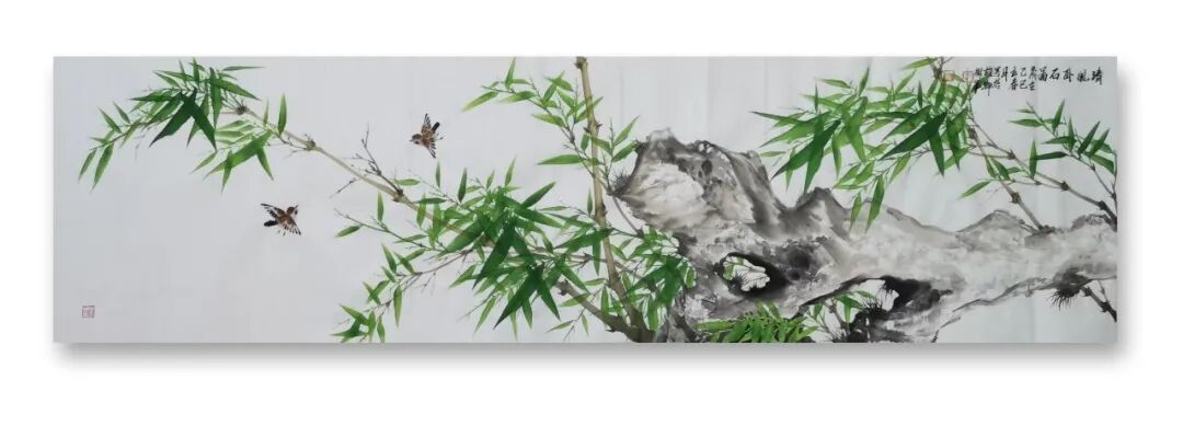 单看他的一幅《竹朋石友图》作品,画中宫树军先生精心布局,是以奇石衬托绿竹风姿,更是以绿竹照应奇石根基,二者之间,单看一者就足以成画,合起来便就更是相辅相成,极具于诗情妙韵!另一幅《清风明月图》中,则是两竿绿竹悠然斜出画面,竹叶间洋溢着清新淡雅的生机,枝叶交错,仿佛有月光穿透其间,洒落点点银辉。乌云月下照翠竹,画意清幽畅心神,可以说,正是凭借着这种凝神遐想、妙悟自然的写意情怀,宫树军先生的竹画作品才会在当代画坛内独树一帜,并最终给人留下了一种深刻而独特的艺术印象!