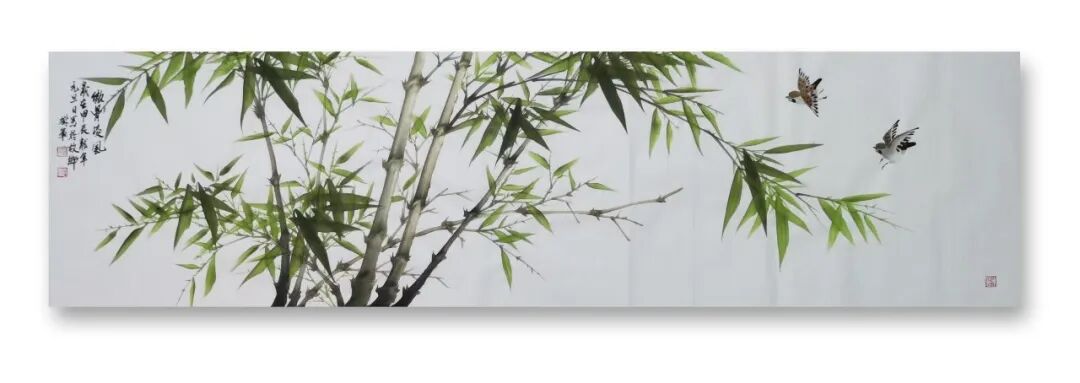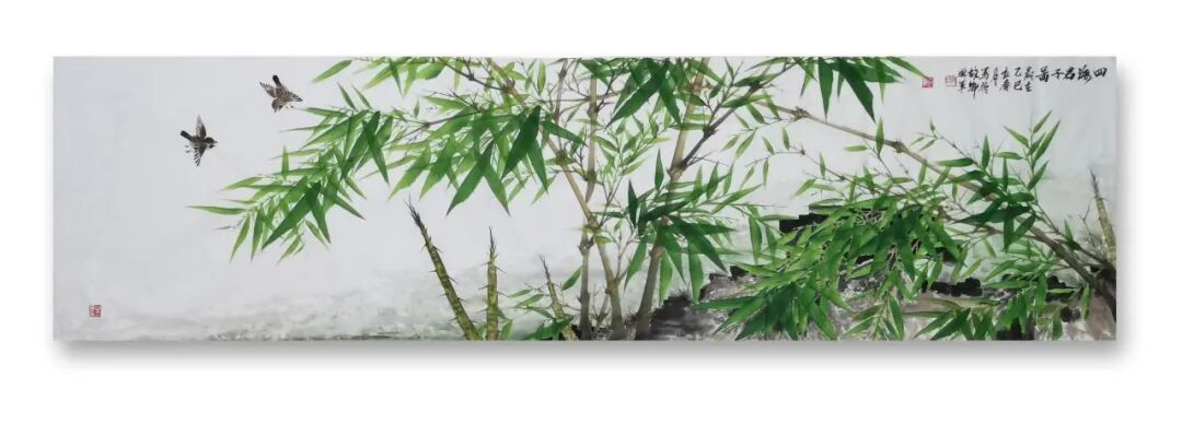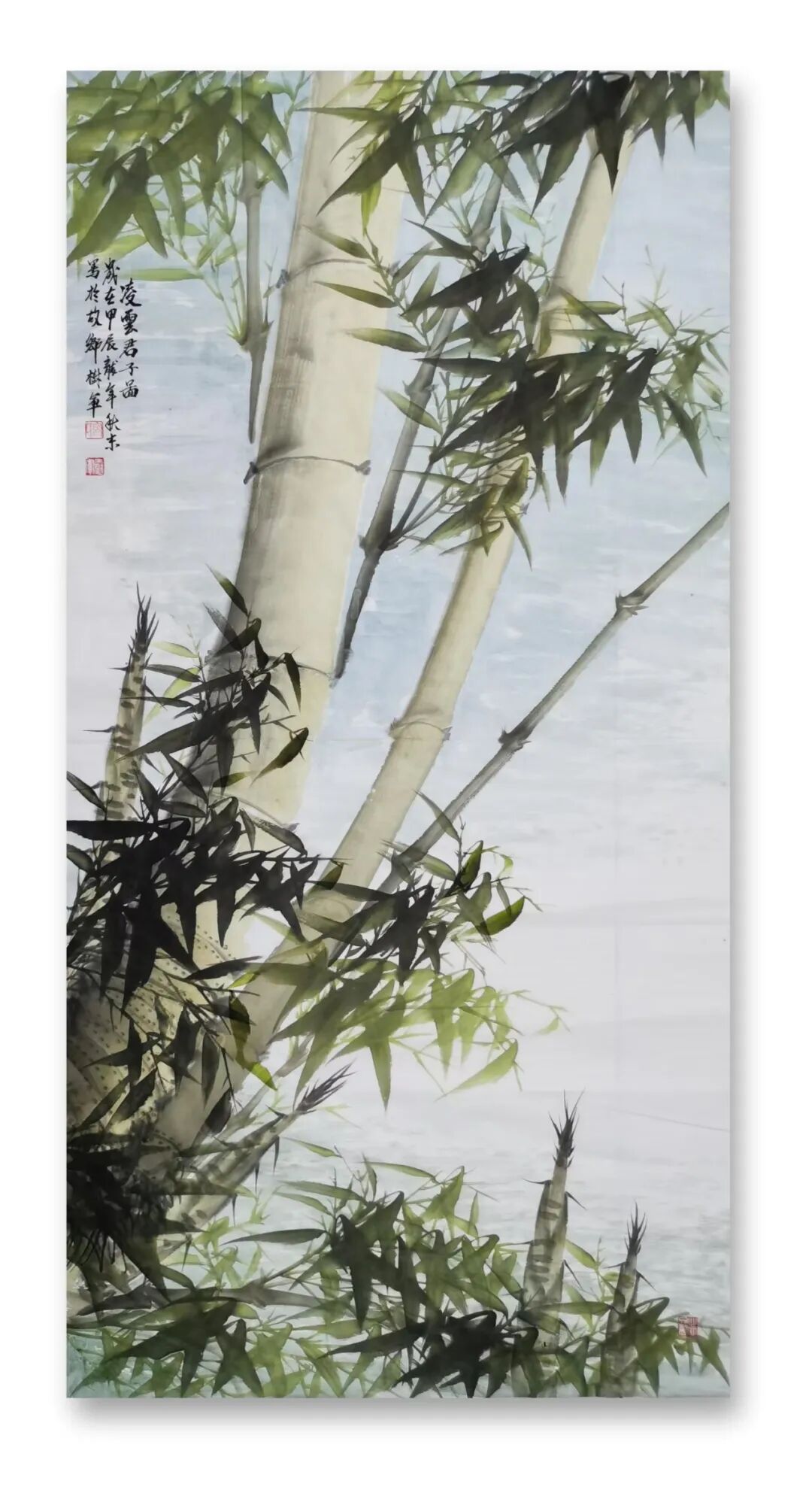 其画竹技法,是可见郑板桥先贤之功底,又有王相文先生之授业。由此笔墨间的运思挥毫,无论是取象着意,还是随类赋彩,都是能达到一种“理法相生,气机流畅”的境地。笔腹蘸水涩进,使竹干至若磔髦竦骨,粗壮之根,矗立画端。笔毫着色出锋,则使叶片平易流畅,一笔一画间从不拖泥带水,或宜隐藏,或宜显露,正是各得其宜!诚然,业内画竹者众多,却为何出彩者少见,其根源也就是在于一句话,即画其形易,而画其精神则难!所谓画形者,无非临摹搬照,仅徒貌似,而如宫树军先生这般画家,却是能将画外妙意尽赋其中,以竹为源,画其心哉!故一幅之中,往往都是能透露出一股清雅之气、一种谦谦之风。此正如古人所言,是谓画有尽而意无尽!