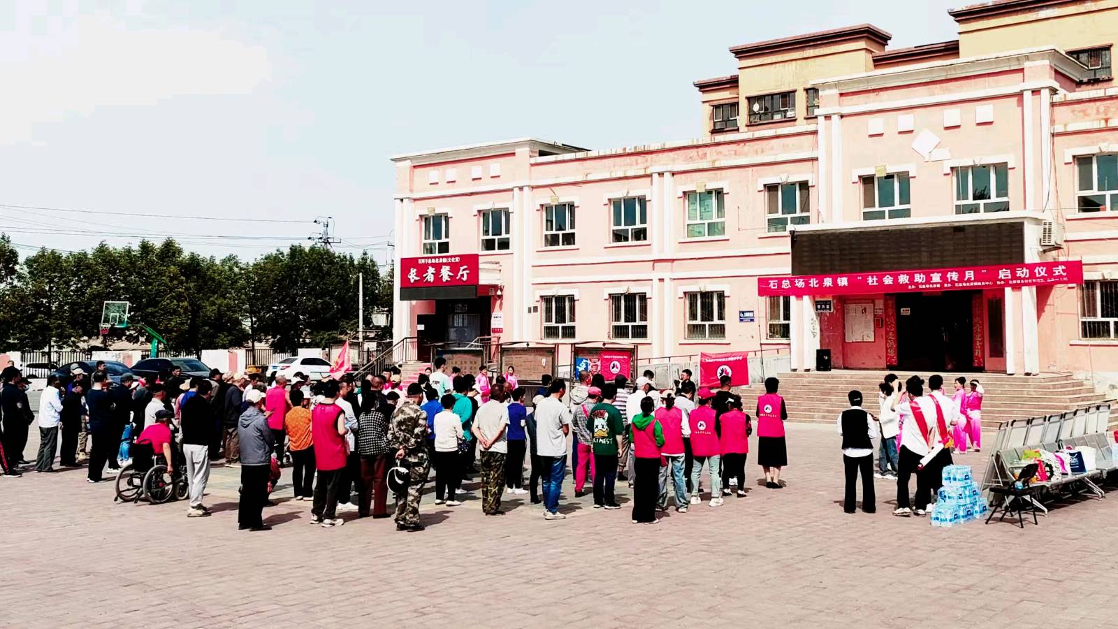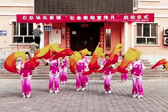 25年4月30日上午,石总场北泉镇“社会救助宣传月”启动仪式在文化宫社区门前隆重举行。本次活动有全场镇各社区书记、社区两委工作人员参加,石总场党委常委副政委马現丰、场镇社会服务中心主任孙芳等参加了"启动仪式"并做了“贺词”讲话。场镇关工委副主任刘洪英代领“关工委老军垦演艺小分队”部分队员在(启动仪式)上表演了一场"扇子舞",以热烈的气氛祝贺“场镇社会救助宣传月”启动仪式圆满成功举行。