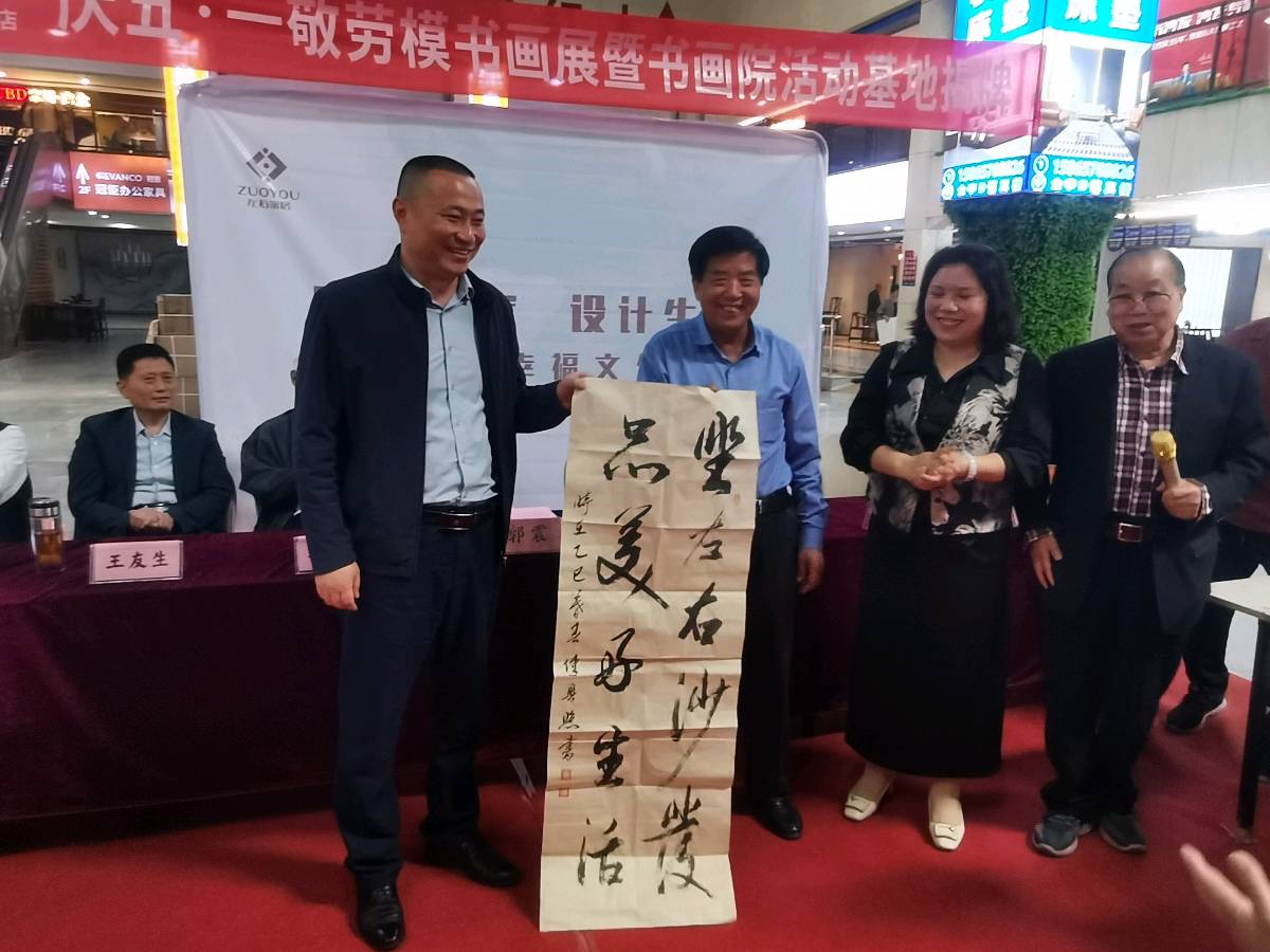 翰墨飘香歌盛世,丹青焕彩绘锦程。在书画活动现场,各位书画艺术家还将自己之前创作的书画精品悬挂在金宇家俱城里,举办了“庆五·一,敬劳模”书画作品展。接着,书画艺术家一个个精神抖擞,热情高涨,挥毫泼墨,奋笔疾书。一幅幅书法作品跃然纸上,一张张精美画作丹青焕彩。经过两个多小时的辛苦努力,当场共创作书画作品30余幅,连同之前在家精心创作的20余幅墨宝,共计50余幅书画作品,全部赠送给了济宁金宇家俱城的管理人员和在现场的工作人员,受到有关领导及现场工作人员的的热情称赞。