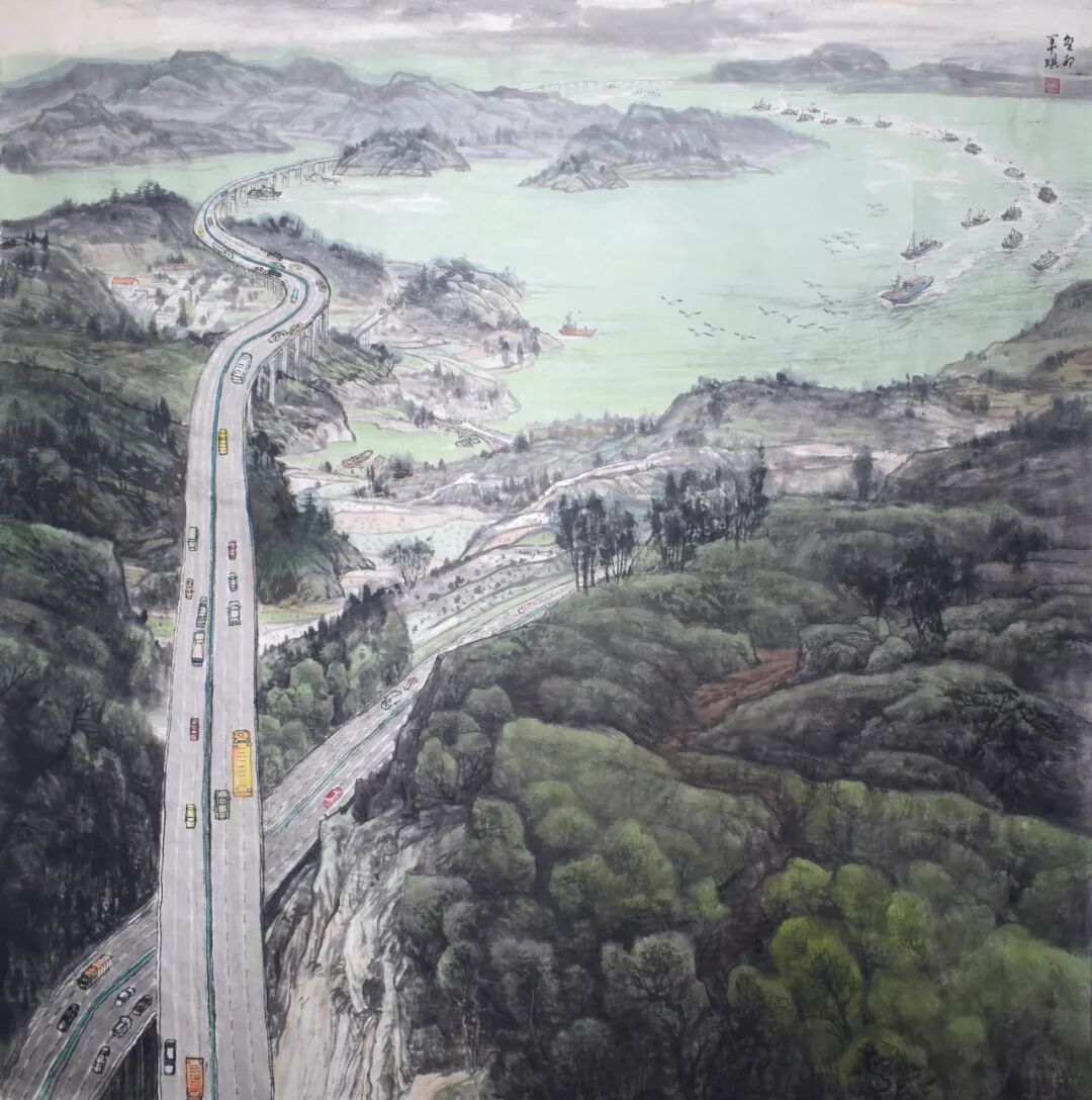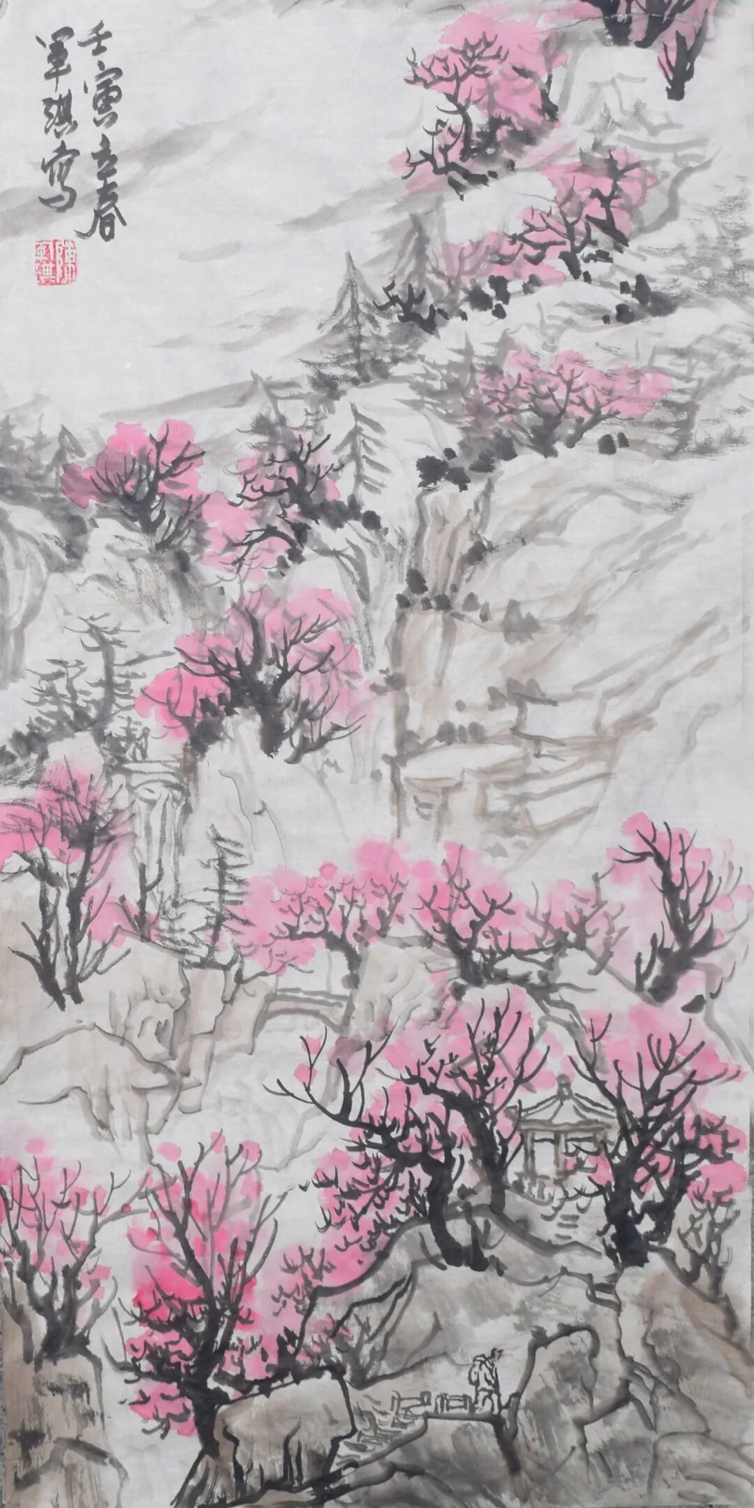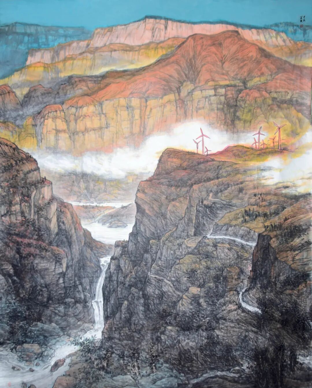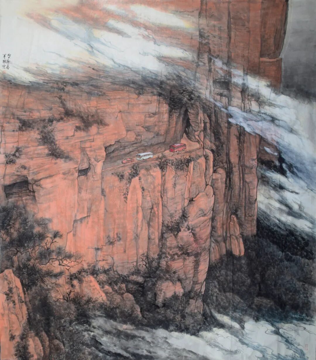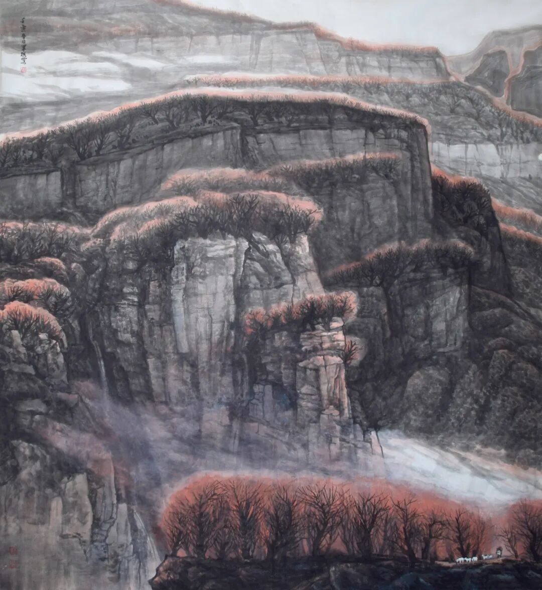 细处可察精微,远观可撼心神,整幅山水画作,墨色之间交相适宜,浓则以勾勒铸其轮廓形势,淡则以渲染漫其云烟内质,尤其重色之处,更是如绯红旭日映于画端,巉岩峭壁,浑雄无比,恰如秦陇之峰峦,巍巍赫赫,嶙嶙峢峢,既可瞻万里之遥,亦可思鸿蒙之开辟山川也!由此不得不说,陈军琪先生的画,的确是深入传统的,也更是深入写生造化的,自臻于此道以来,悟得经营二字不爽!因此若要用一言概其山水精要,窃以为当属:“咫尺藏洪荒,笔墨铸山河!”此语最是切中肯綮!