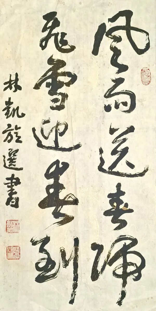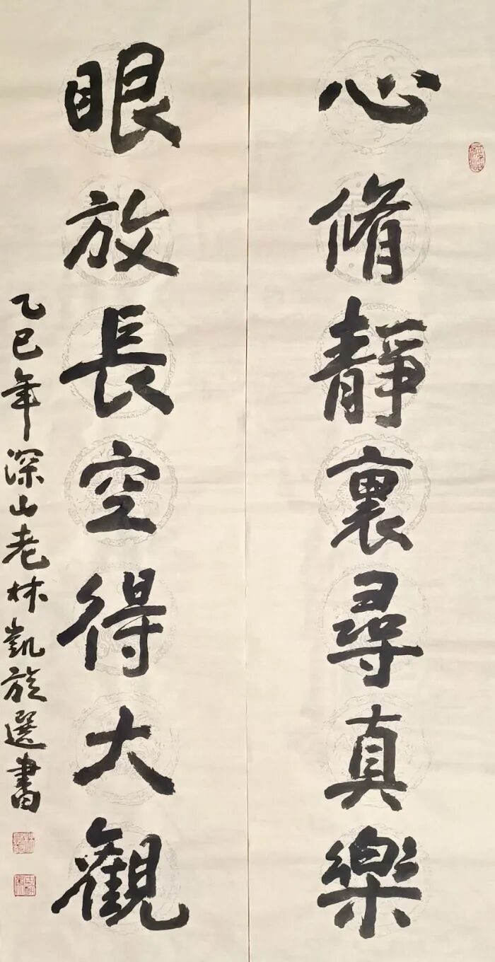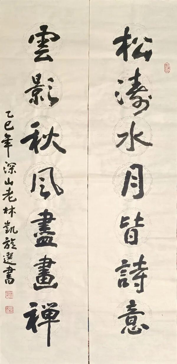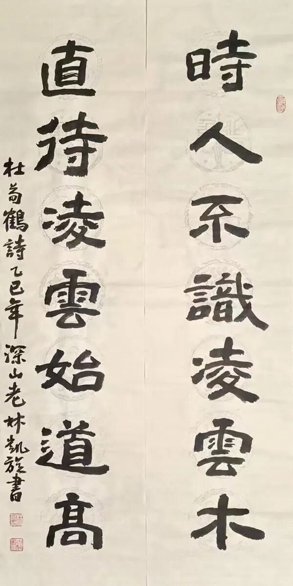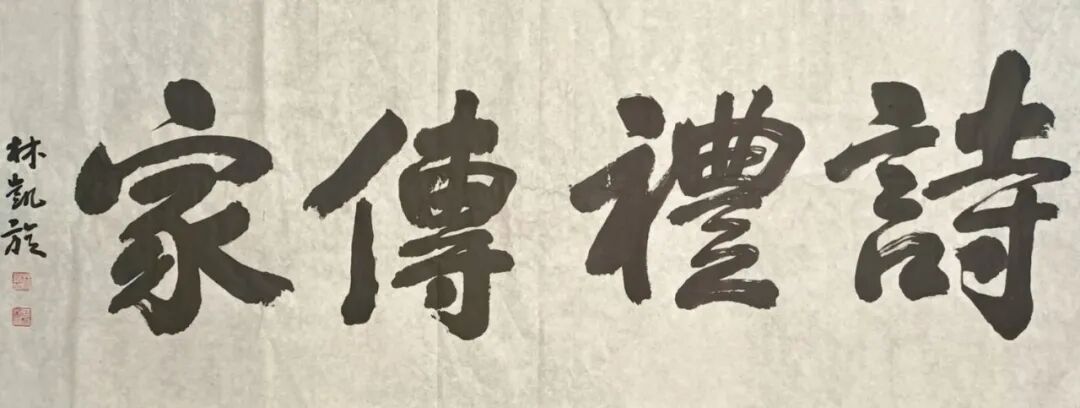 林凯旋先生书、文、诗、印皆有成就,具有很浓的文人化、学者化倾向。他的书法,立足传统汲取营养,又不失时代气息,可以说,书法的各种书体让他捏摸了个遍,但他认真听取大家意见,有重点地选择了隶书、楷书和行书的研究,从而以自己的笔墨语言塑就了他严谨而不失灵活、浑古而见率意的书风;“林凯旋很有天赋,不仅学问做得扎实,书法也很有才气,和别人都不一样,很有新意,也很有前途。”他被大家誉为学者型书家,不仅仅是因为他大量书法研究的理论和成果,更因为在这个艺术领域里诗书文印俱佳者实在不多。他的诗空灵俊逸,意蕴悠远,颇具古风,因而,他的书法创作多以自作诗联为素材,就更具有了双重的艺术价值。自写自书,当然就有了自己的感悟,自己的节奏,读来一气呵成,酣畅淋漓,绝无艰深之感,这也是他的书法耐读的另个原因。
