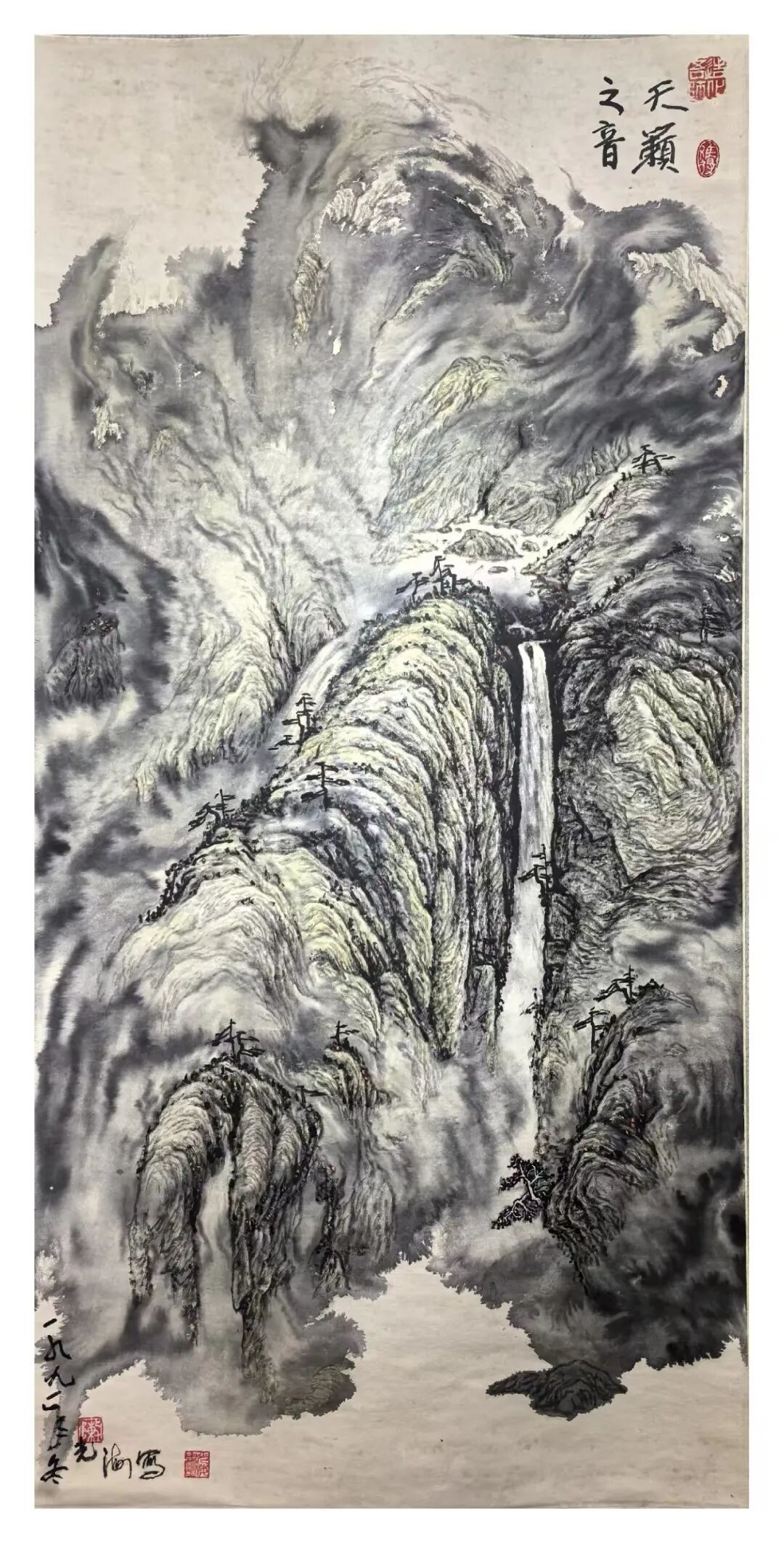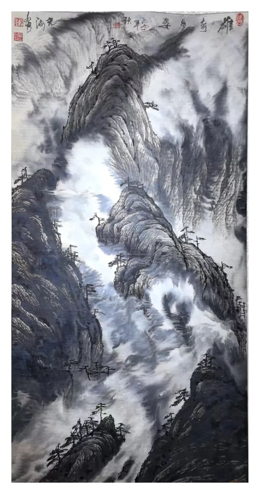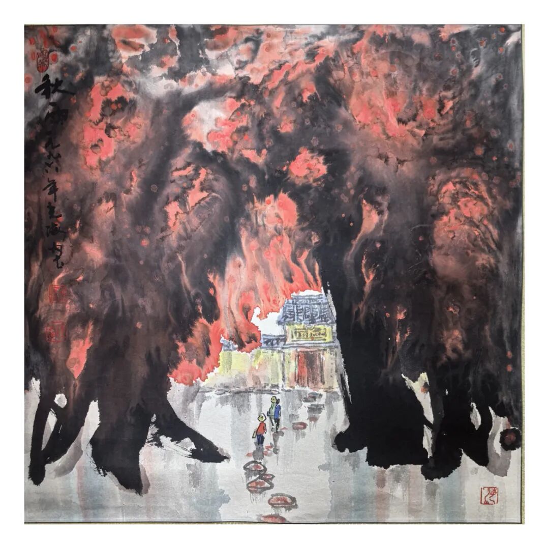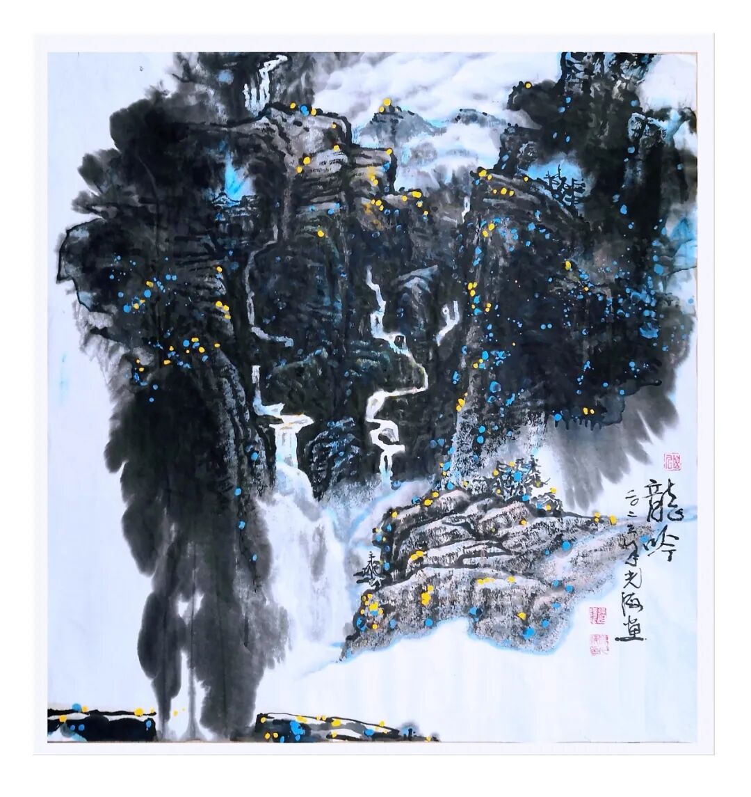 “玄墨”是陈光海在大写意中对墨色运用的独特手法。墨色在中国画中不仅是色彩的表现,更是一种哲学的象征。陈光海对玄墨的运用是天人合一的道法自然之理,他强调墨色深沉、神秘与变化。打破传统的法度,在泼、湿、染、冲、撞等技法的运用上,作画之前,象上帝一样,先创造一个混沌苍茫的初始,深不可测,玄妙神造之美。如《雄奇多姿》《古壑》等作品体现墨色与色彩的绚丽变化,而是通过泼墨的浓淡、干与湿,隐与显,虚与实的对比,天然生成来展现出画面的构成,层次感和意境。这种这种泼彩湿墨的运用,如同道家所言的“玄之又玄,众妙之门”,在深沉的神妙的墨色中蕴含着无尽的奥妙和哲理。