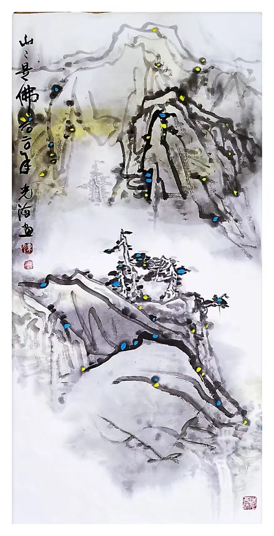 在艺术表现上,他运用古拙朴素的反扑归真的“拙笔”线条,与自然痕迹结合,遵巡志于道,游于艺的道家思想,沉浸在自然造化之中,妙趣横生,创造出一种空灵、深远的画面意境。画家以古拙笔法勾勒,铁骨殘痕的线条物象,与玄墨渲湿出的画面的氛围,使观者在欣赏作品时,能够感受到一种超越形象本身的精神内涵。从画家画作中可以看出,陈光海的《山山是佛》《和风》《仁者寿》等,无论是题材内容或表现形式,都是基于艺术大写意精神,不限于某种传统技法束缚与重负,与时代精神同呼吸,既符合中国传统文化中“大道至简”的哲学思想,又展现了画家对艺术本质的深刻理解。