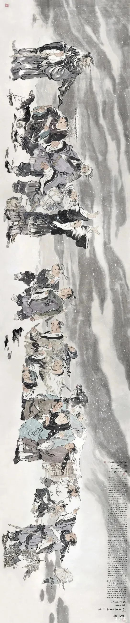 《千古风流人物》作为其人物长卷又一力作,展现出李学辉更为宏阔的历史视野与人文情怀。这幅作品堪称一部铺展于纸上的中华文明精神史诗。李学辉以饱含深情的笔墨,跨越朝代藩篱,将那些在历史星空中熠熠生辉的灵魂——从慷慨悲歌的志士仁人,到光耀文坛的诗词巨擘,再到推动文明进程的思想先驱——汇聚于同一时空维度。这并非简单的历史人物罗列,而是李学辉以其独特的艺术哲思,对中华民族精神脊梁的一次深情巡礼与崇高致敬。画卷中流淌的,是“虽九死其犹未悔”的忠诚,“留取丹心照汗青”的气节,“吾将上下而求索”的坚韧,共同铸就了贯穿千古、奔涌不息的精神长河。
