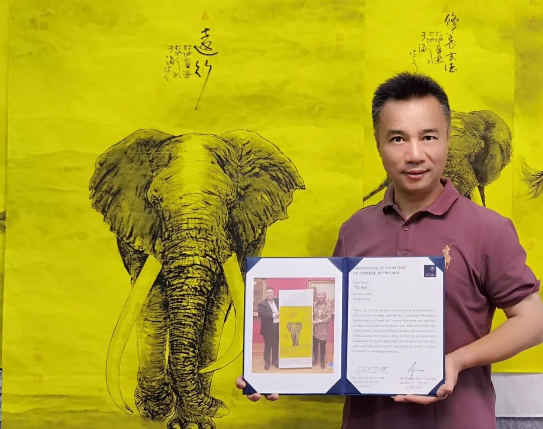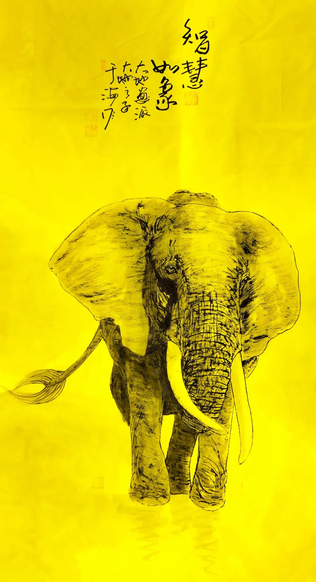 牛津大学的收藏则更具戏剧性。当艺术学院安娜教授用紫外线灯照射《和光同尘》作品中大象的眼部时,隐藏的太极图在那如黑洞洞一样的黑暗中熠熠生辉——这正是于海独创的“灵动水墨光影探道技法”。更令人称奇的是,扫描画角二维码可听到画家用桂林方言吟诵《道德经》第35章,“执大象,天下往。往而不害,安平太…”。声波图谱与画面墨迹起伏完全同步。“中国艺术家早在一千年前就掌握了‘视听通感’的艺术密码。”安娜教授在捐赠证书上如此评价。