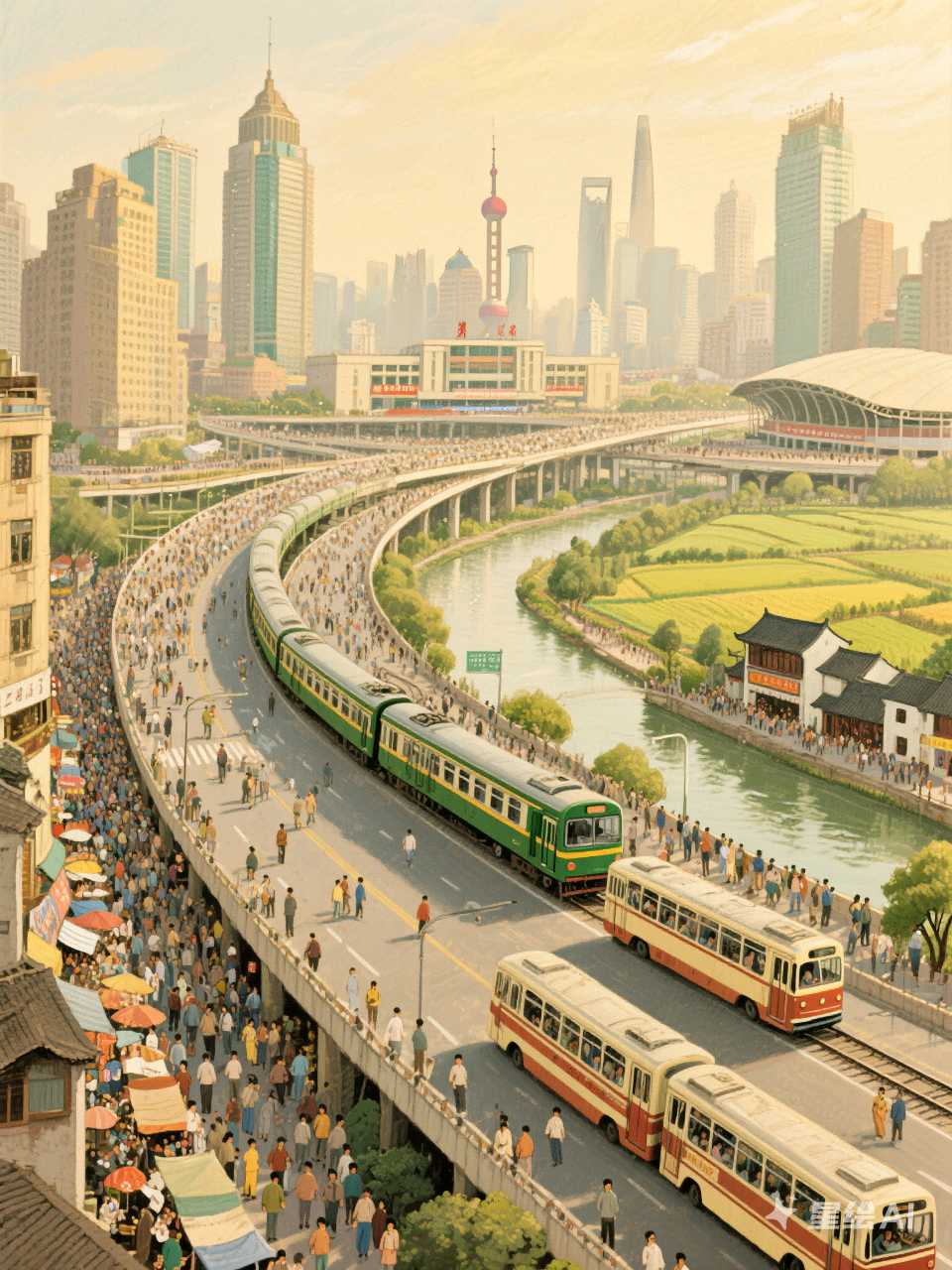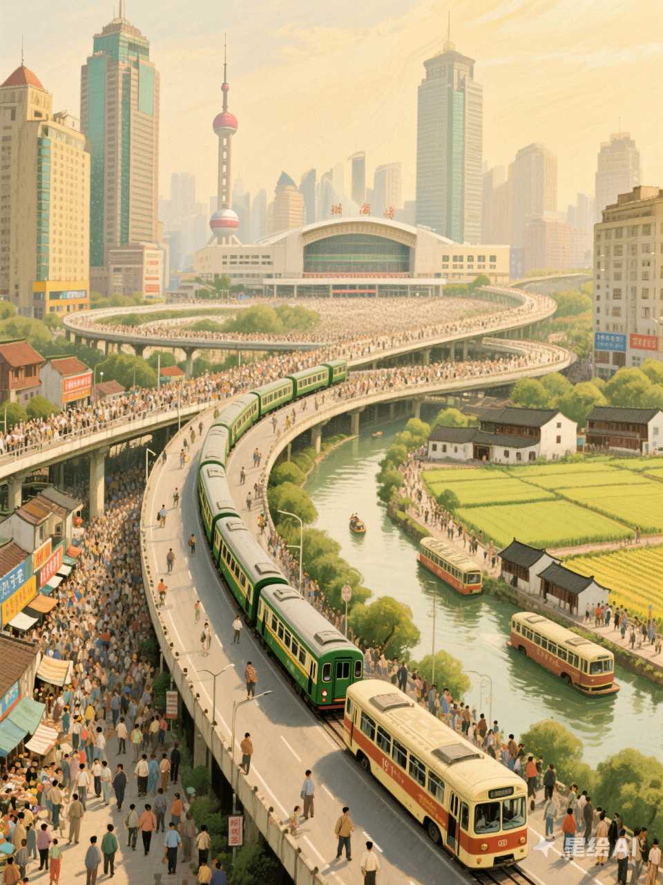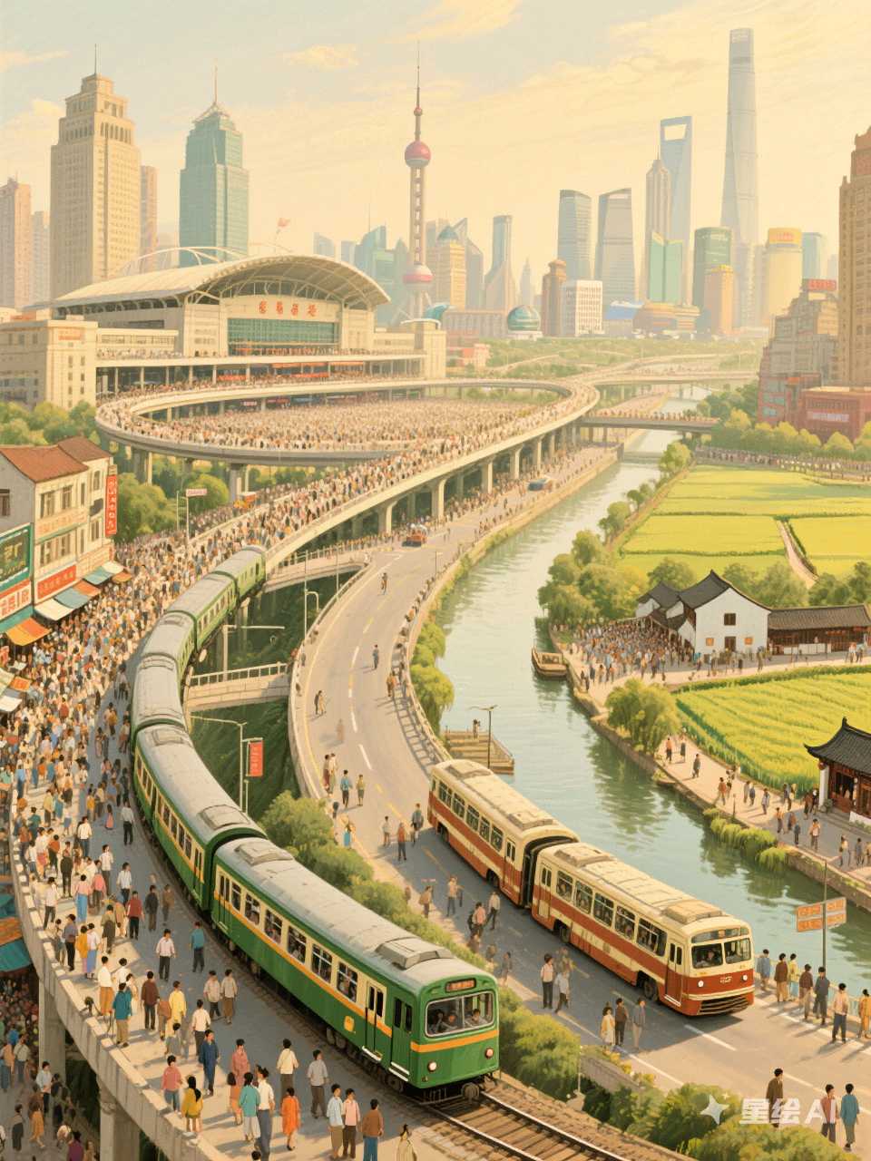 市区与郊区:市中心的高楼林立、交通拥堵与七宝古镇“一片绿色的田野”、“跟一个县城差不多”的宁静形成对比,展现了上海城市发展的层次和复杂性。