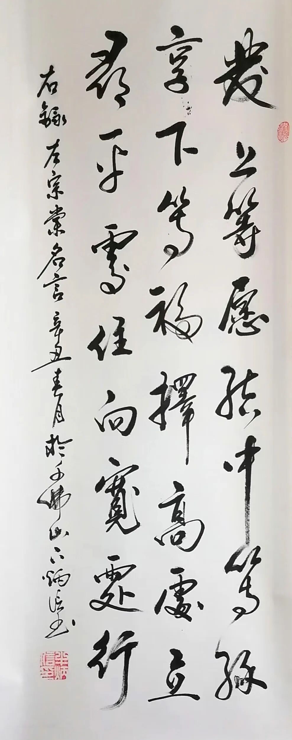 牛炳信先生深耕书艺数十载,其作品扎根传统,又融个人风骨,展现出齐鲁文化特有的浑厚与朴茂,用笔沉稳而不失灵动,线条刚健有力,提按转折间可见对唐楷法度的严谨继承,而行草作品则流露出对“二王”一脉的深刻领悟,笔势连贯,气韵生动。作品整体风格雄浑大气,既有北派书风的豪迈,又兼收南帖的细腻。 内容多取经典诗文,书写时注重文意与书风的统一,字里行间透露出文人书家的学养积淀,尤其对联、中堂等形制,布局疏密有致,虚实相生,给人以庄重典雅之美。