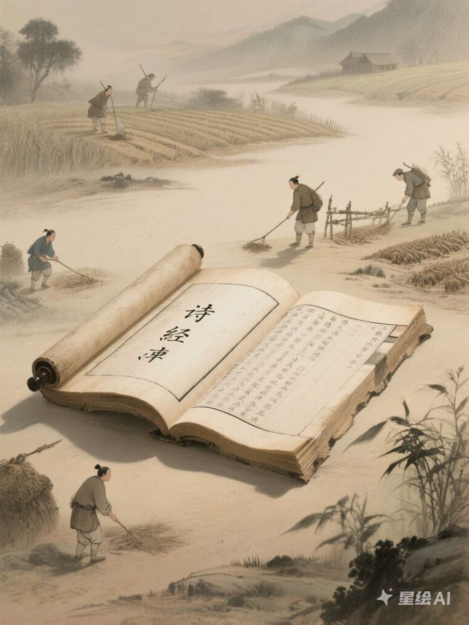 《诗经》首联以“风雅三千”总领,“肇古疆”点明其开创性;“四言犹带黍离霜”暗合《王风·黍离》的沧桑感。颔联选取“田家击壤”(《豳风·七月》农事场景)与“戍卒怀乡”(《小雅·采薇》征人情怀),具象呈现社会风貌。颈联“作赋官”“删诗笔”呼应《诗经》编纂背景(采诗、孔子删订),强调其记录民生、垂范教化的功能。尾联“清芬润海棠”以花喻诗,赞其滋养后世文心。