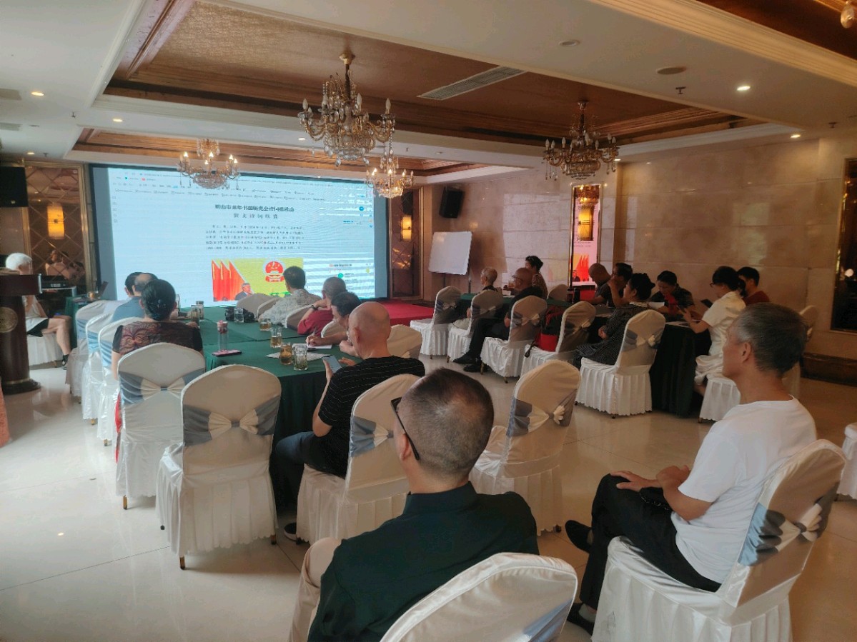 《 三苏文学迅》 2025年6月23日上午,眉山市老年书画研究会诗词组在眉山东坡名人大酒店二楼东坡厅举办了一场别开生面的诗词交流活动。近30名诗人在此相聚,共同聆听诗人贺文创作的十二首诗歌,沉浸在诗词的芬芳之中。