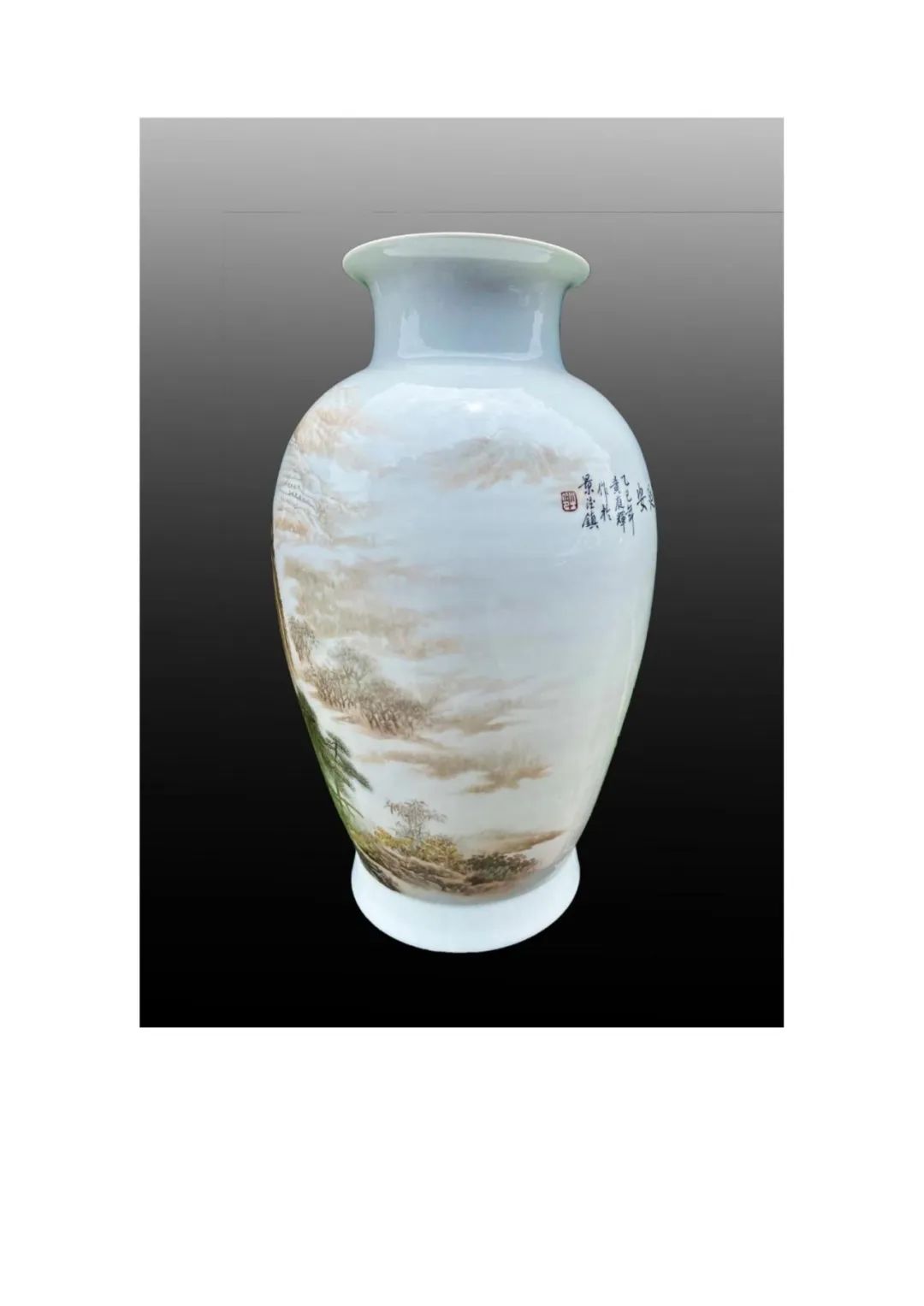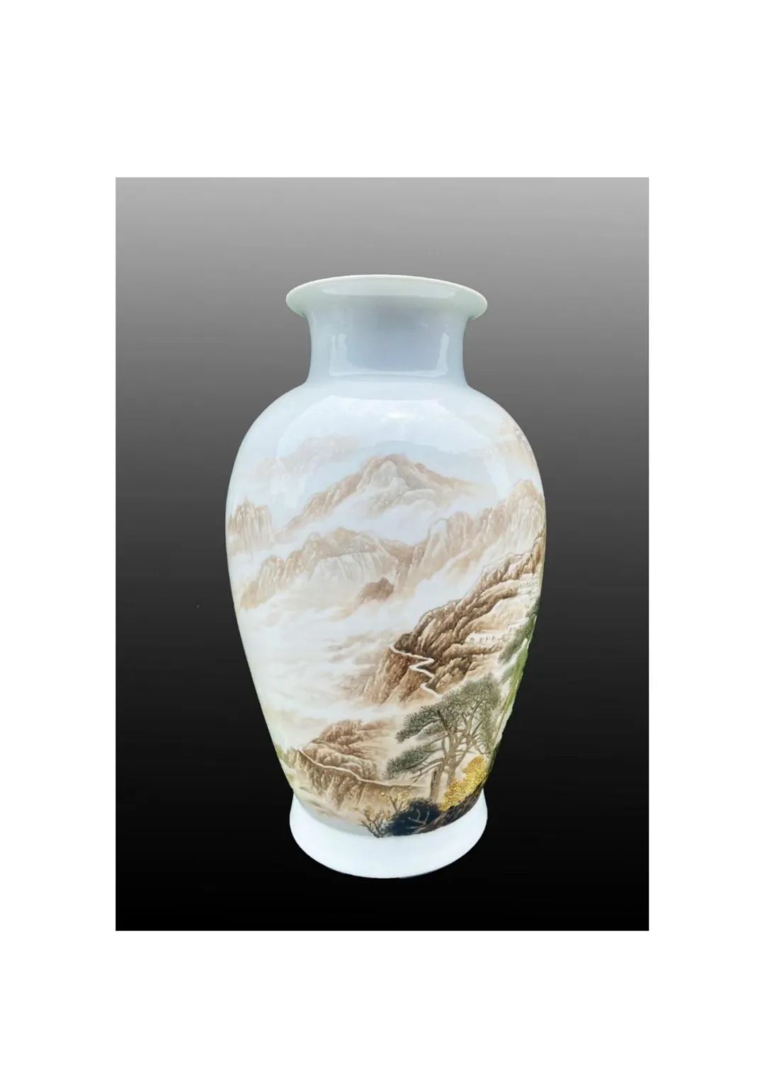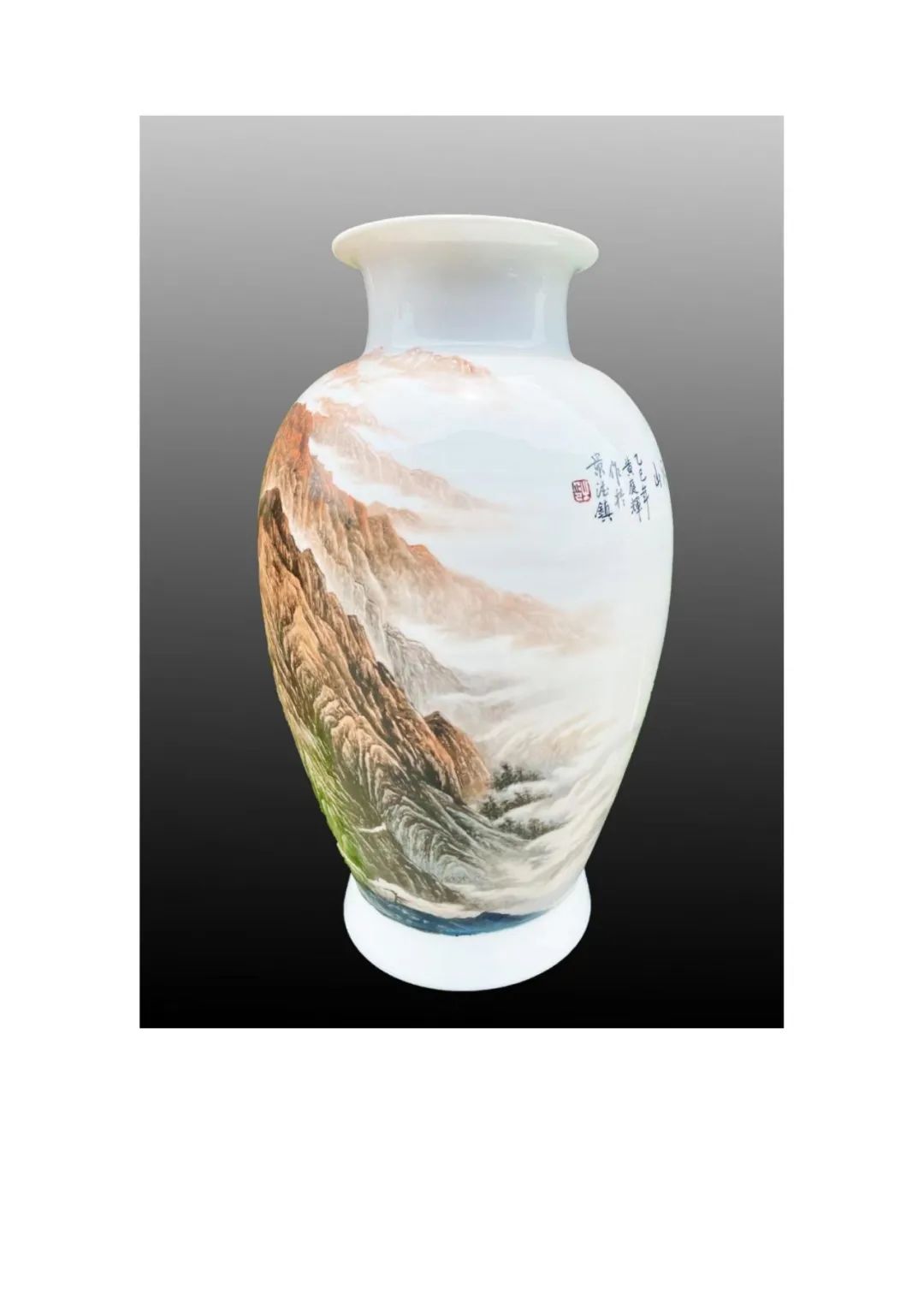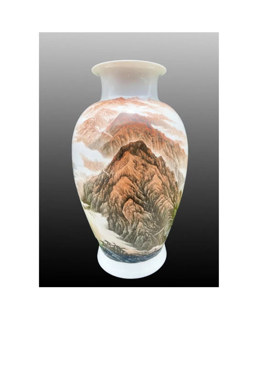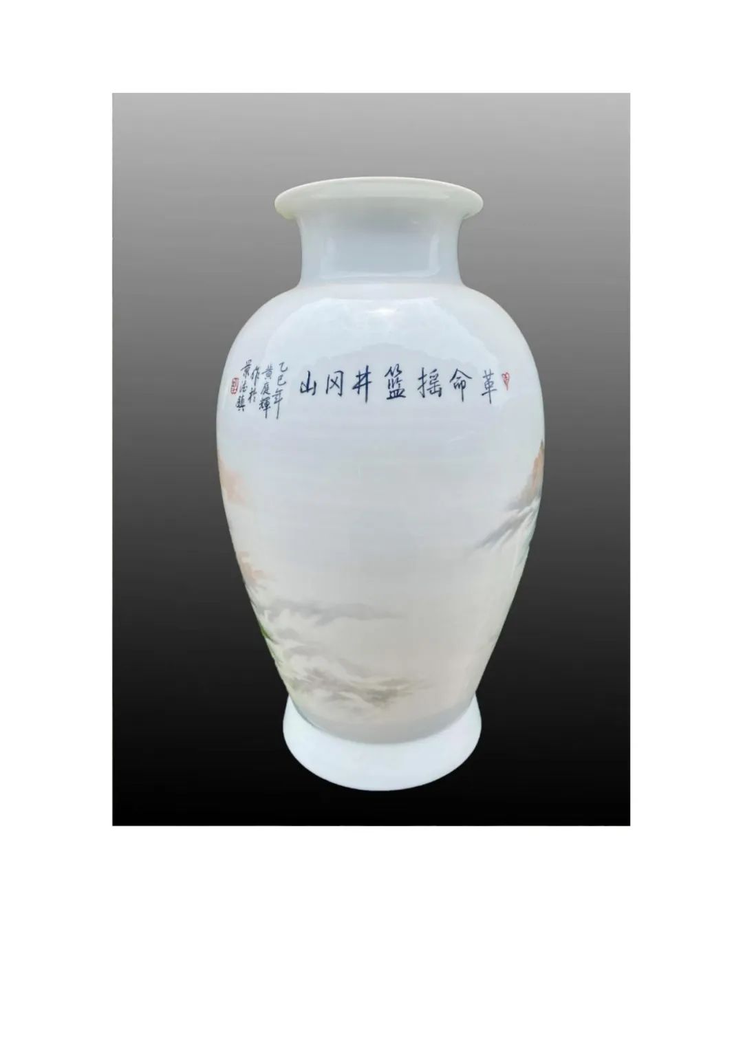 《革命摇篮井冈山》采用通景装饰技法,以大红油彩为主,描绘崇山竣嶺,这种色彩不仅还原了历史场景,更通过陶瓷特有的材质语言,诠释了"星星之火,可以燎原"的革命信念。瓶体主画面从瓶底至瓶颈,用刀刻般的线条勾勒出险峻山势,群山层叠,云雾绕绕,巍峨险峻。近景处,作者以蓝、绿色点缀丛丛树木,并绘制出蜿蜓山路,象征着革命先辈的跋涉之路。