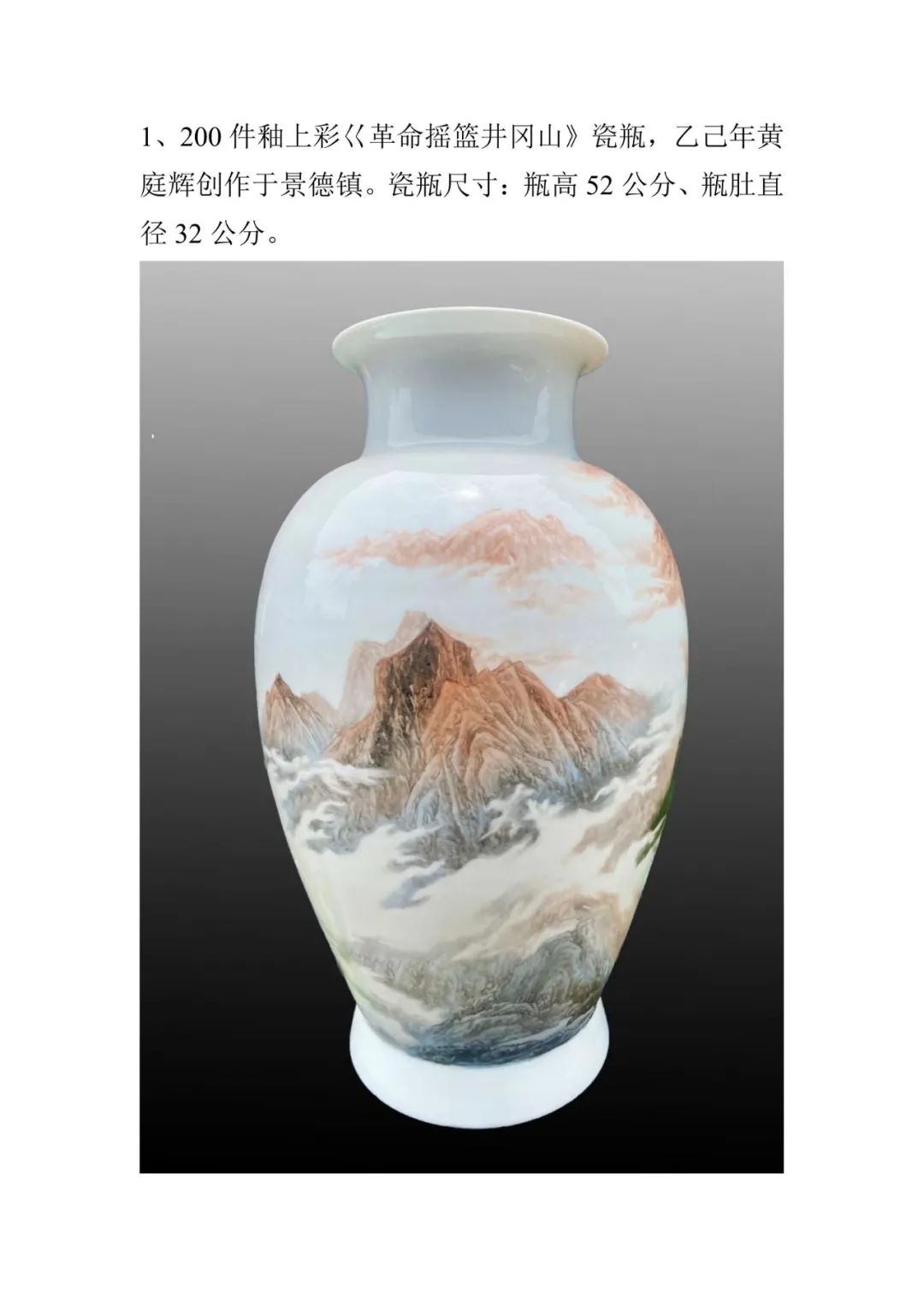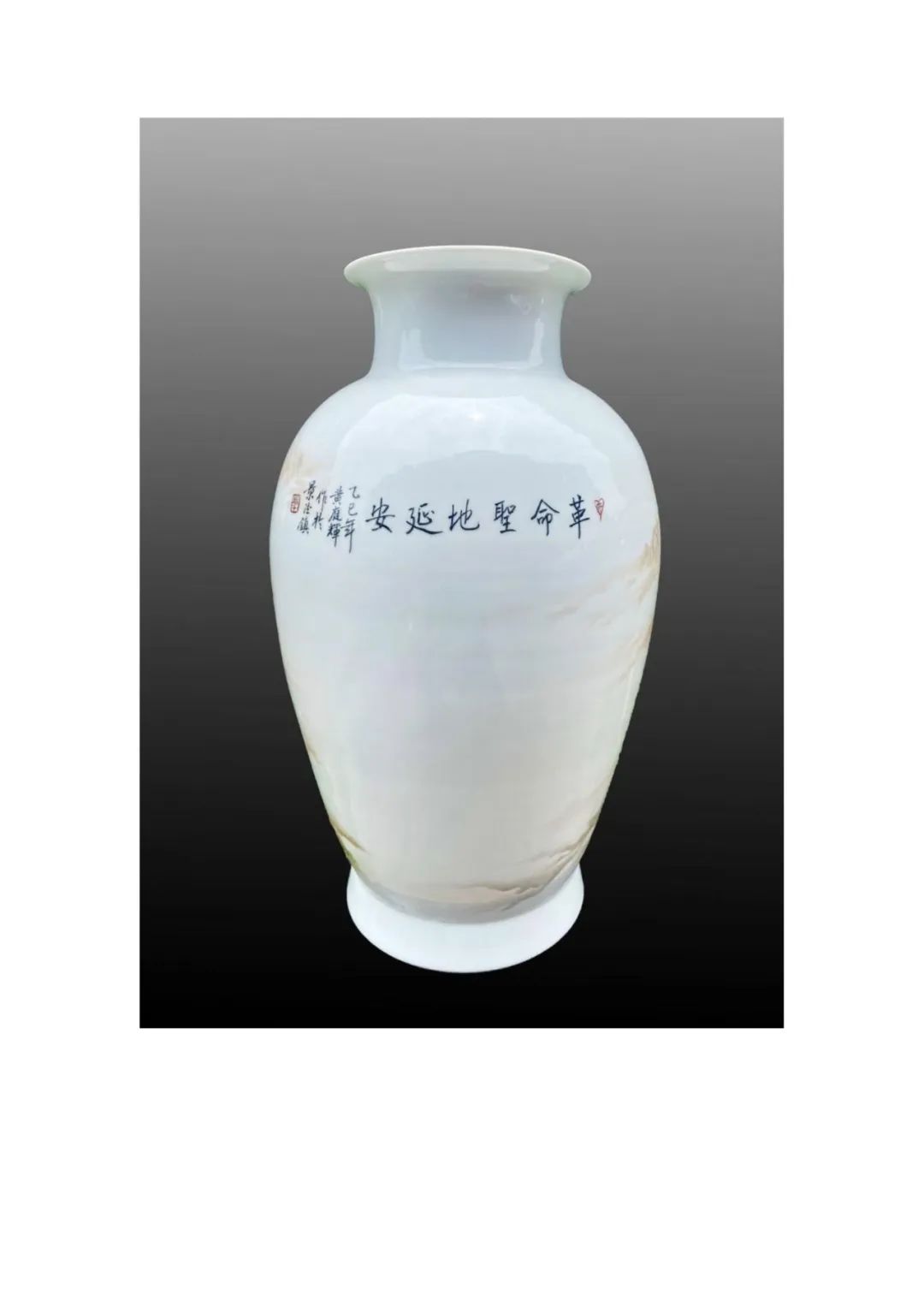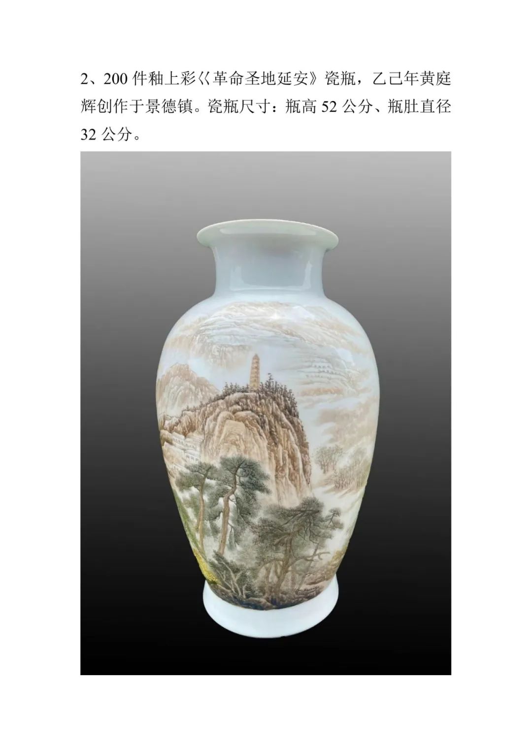 在纪念中国人民抗日战争暨世界反法西斯战争胜利80周年之际,江西省景德镇市原红星瓷厂厂长、首届中国陶瓷艺术大师传承创新工作室获得者黄庭辉先生分别以井冈山、延安为主题,创作了一对200件釉上彩《革命摇篮井冈山》《革命圣地延安》瓷瓶。瓷瓶均以高白泥料为纸、新粉彩颜料为墨,在高温窑火中淬炼出中华民族的精神丰碑。瓷瓶选择“松子瓶”器型,饱满壮硕,寓意革命传统生生不息,代代相传。