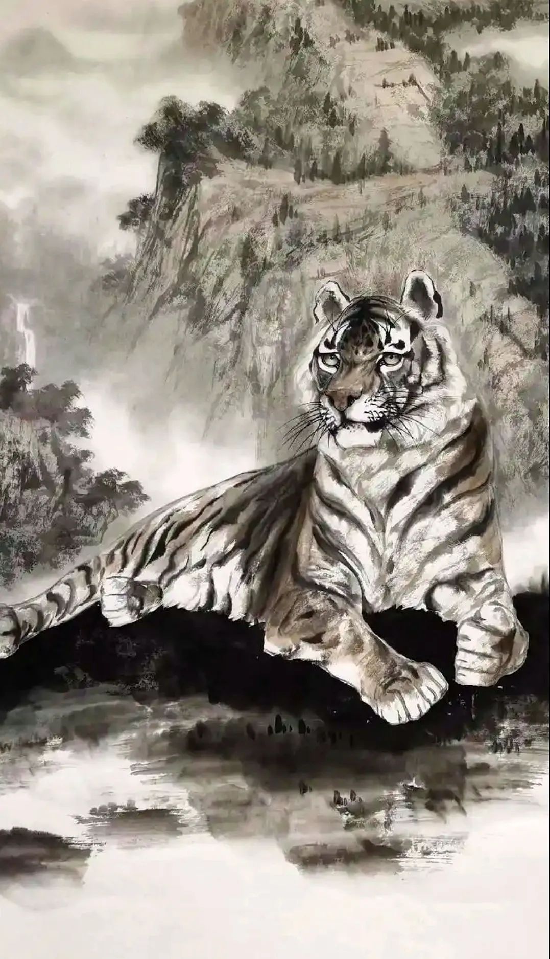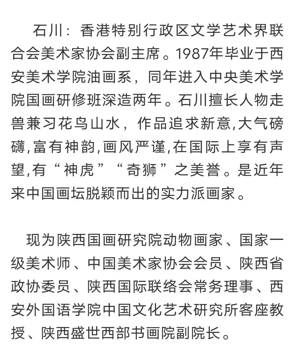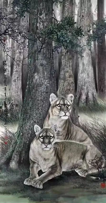 石川的走兽作品以虎、狮为核心意象,在当代中国画坛独树一帜。作为融合中西技法的实践者,他将传统水墨的写意精神与西方绘画的写实技法熔铸一炉,通过对动物生命形态的深度解构,构建起既具视觉冲击力又富含人文哲思的艺术世界。其作品以“神虎”“奇狮”蜚声国际,不仅因其精准的造型能力,更因其赋予猛兽以超越生物属性的精神内涵。