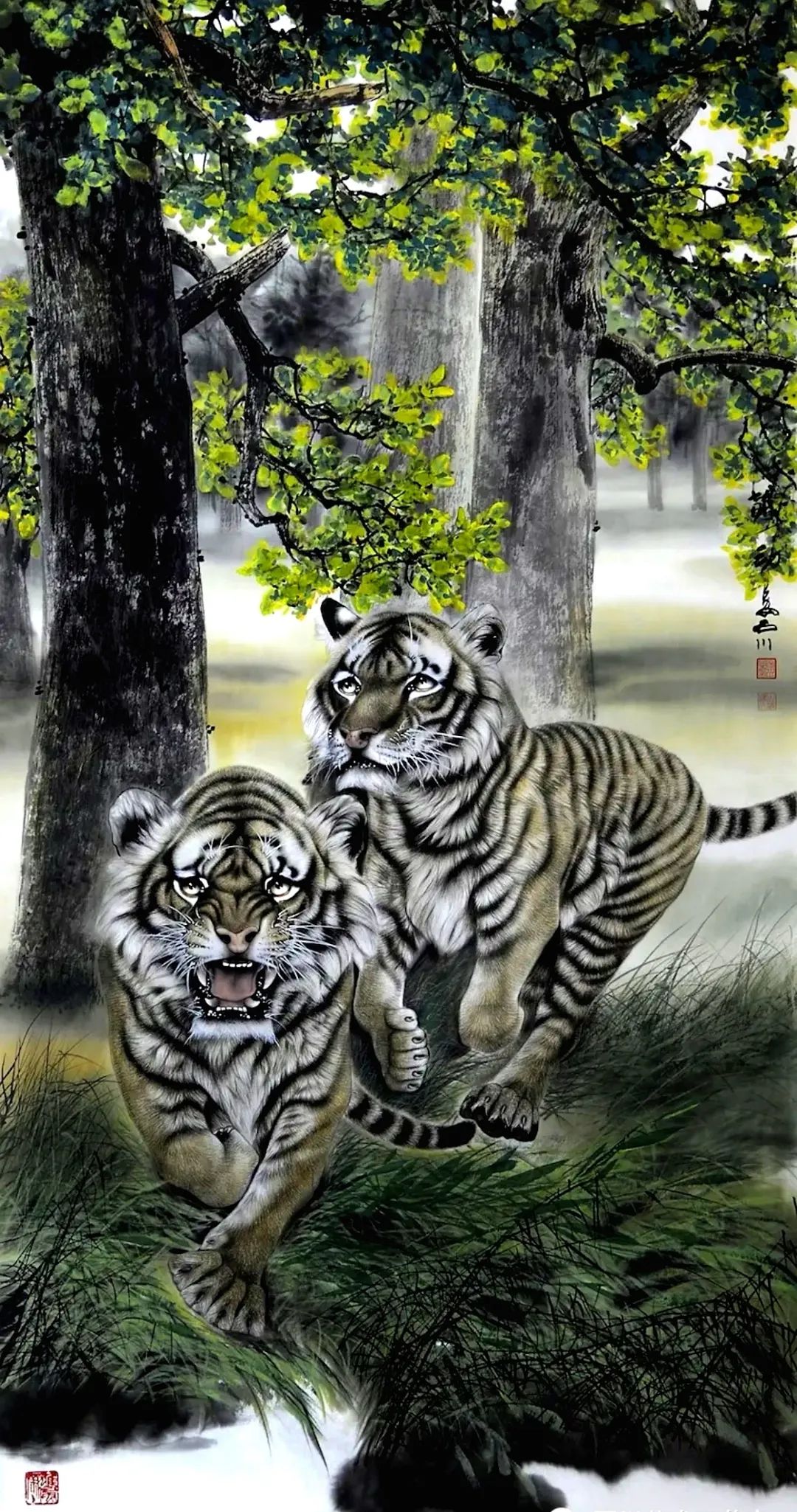 石川的走兽作品承载着深厚的文化隐喻。虎作为中国传统文化中的“百兽之王”,既是权力的象征,也是勇气的化身。石川在继承这一文化符号的同时,赋予其新的时代内涵:他通过对虎生存环境的现代性描绘,反思工业文明对自然生态的侵蚀;通过对虎精神气质的重新诠释,呼唤现代人失落的血性与尊严。