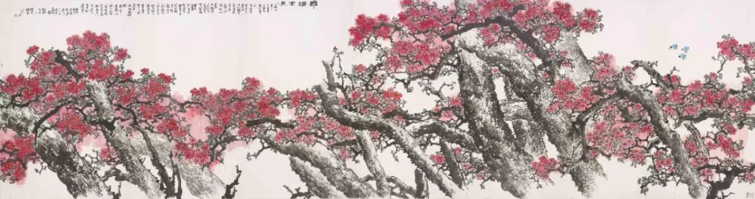 二是,我在与朱全增的闲聊以及进一步探询中才得知,他一生并非顺达,而是从基层工作一步步转向绘画专业,进入和提升到美术创作和领导岗位的。其中的人生滋味谁也无法确切得知,只有他本人才能真正深切体知。尽管如此,我却仍从他的言谈描述中,感知其辛艰以及分享他的艰辛所带来的收获和喜悦。山东的先贤哲人孟子曾在评赏诗时说:“知人论世”。这也是作好文艺和绘画评论的第一原则。如果你不了解画家的个人经历,那么如何真正评解其画的思想内涵,趣味和风格取向呢?可以说,朱全增先生的花鸟画不仅格局宏大,而且所选题材,虽有的墨竹,蘭草以及山石累累,但最令人注目的却是他笔下那些粗壮,遒劲,横空出枝或矗矗耸立的树幹,不论是红梅或木棉,都在树枝的支撑下才得以熠熠生辉,才充满了不屈不挠的生机,这不正是他个人经历的绝好写照吗?