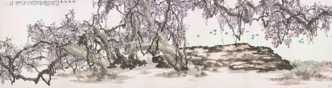 在我与朱全增先生的交谈中,他说自己的花鸟画比较注重“写实”(这显然与他曾经的西画背景有关),但其实他的花鸟画仍然流露出“写意”的韵律,“写实”和“写意”在他作品中是并行不悖的,他的花鸟画宏篇巨制若无“写意”作为基本的形式表达,一味“写实”实际上是难以为继的。但的确,观其画,可以看出朱全增花鸟作品中,每一枝幹,每一花朵,每一粒粒花蕊,每一只雀禽,皆能逼肖其态,真显其形,写意笔调是服务于写实的取向的。他的花鸟色彩亦是按照写实手法,随类、随物、随心而赋之,绝无丝毫松懈马虎。
