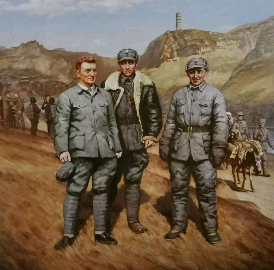 《三位老朋友(新西兰人路易.艾黎、德国人汉斯.米勒医生、美国人马海德医生)》油画,150cmⅩ150cm,邓邦镇作