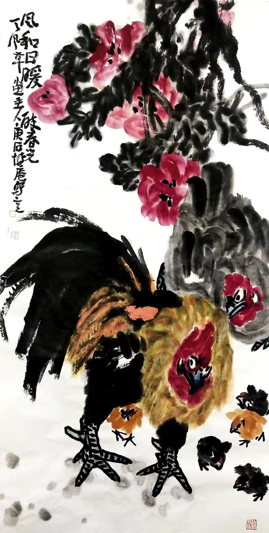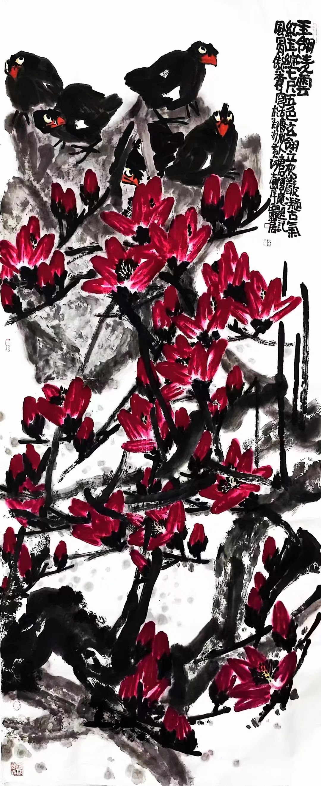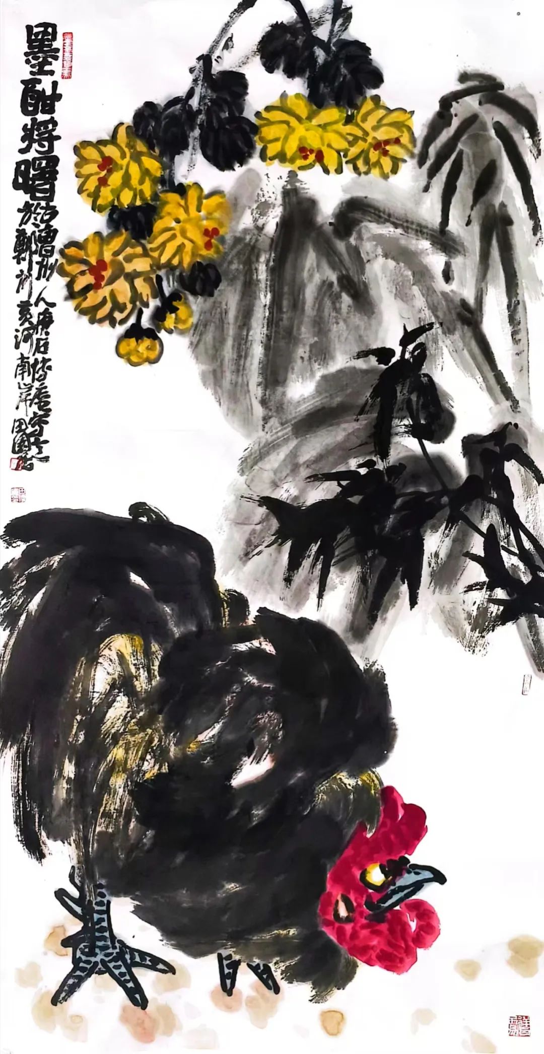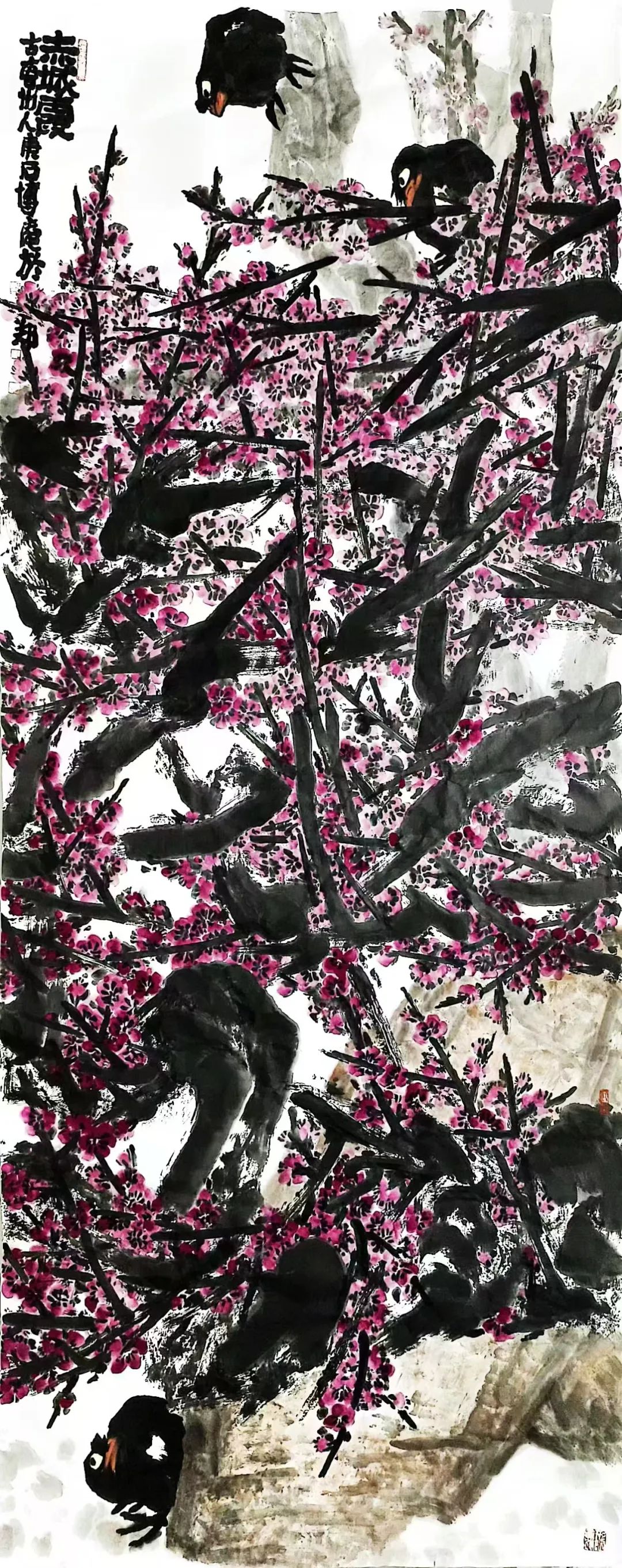 山东菏泽的沃土赋予他朴野鲜活的原生力量一一那是水浒故事流传的豪勇之地,是曹州牡丹甲天下的炽烈乡情,更是高台戏腔与木版年画交织的民俗盛宴;而中岳嵩山的云烟苍茫,则为他注入雄浑苍劲的天地意识。从曹州书画院到嵩山书画院,他怀揣两片厚土的馈赠,以墨为犁、以笔为钺,在中国大写意花鸟画的疆域上,刻下一部名为“重、拙、大”的视觉史诗。